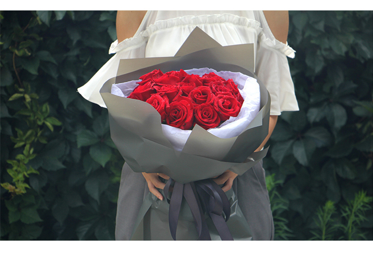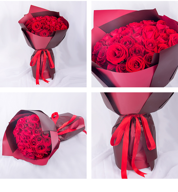 包装:里层4张白色雾面纸,酒红色包装纸4张,暗红色包装纸4张。红色缎带花结。