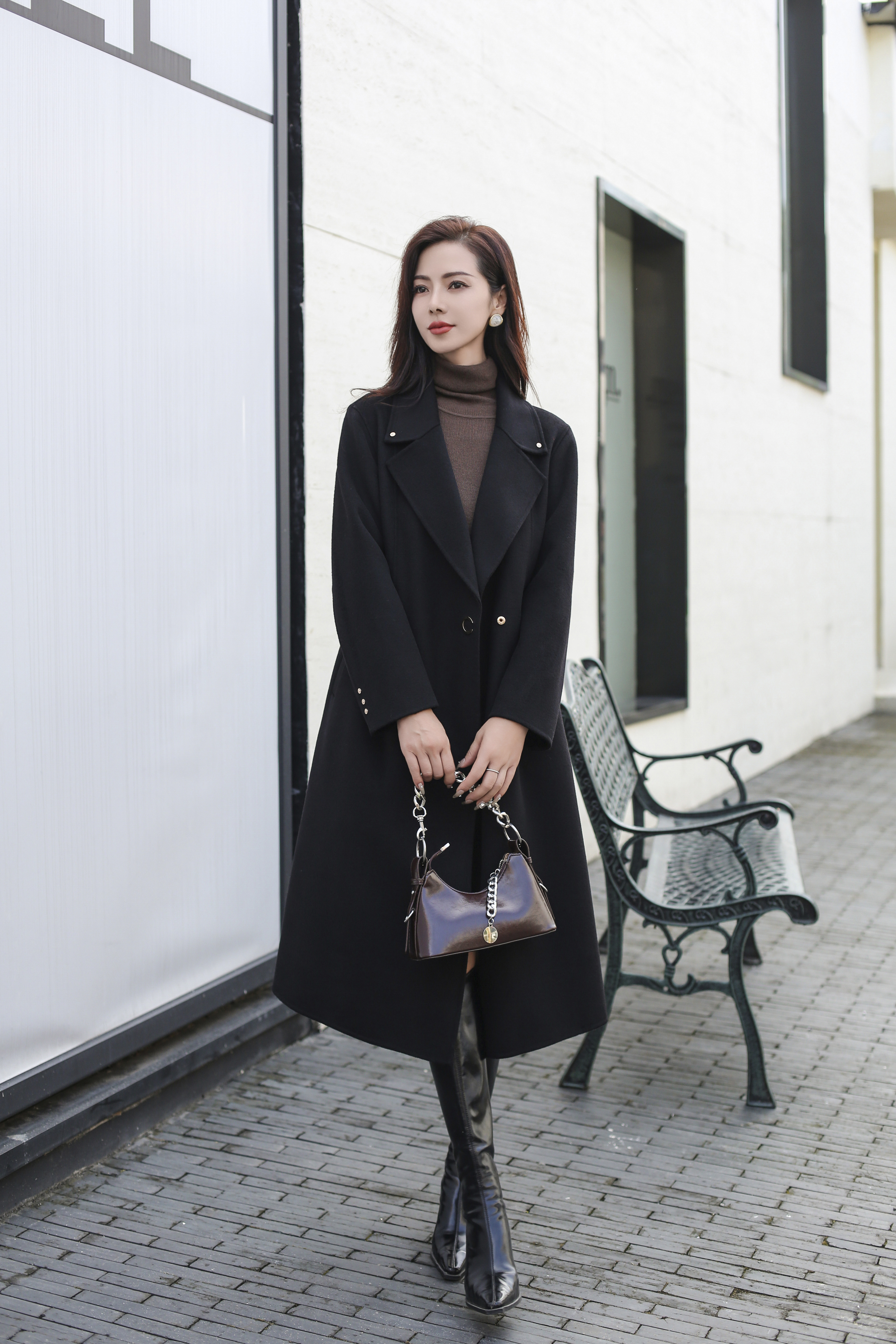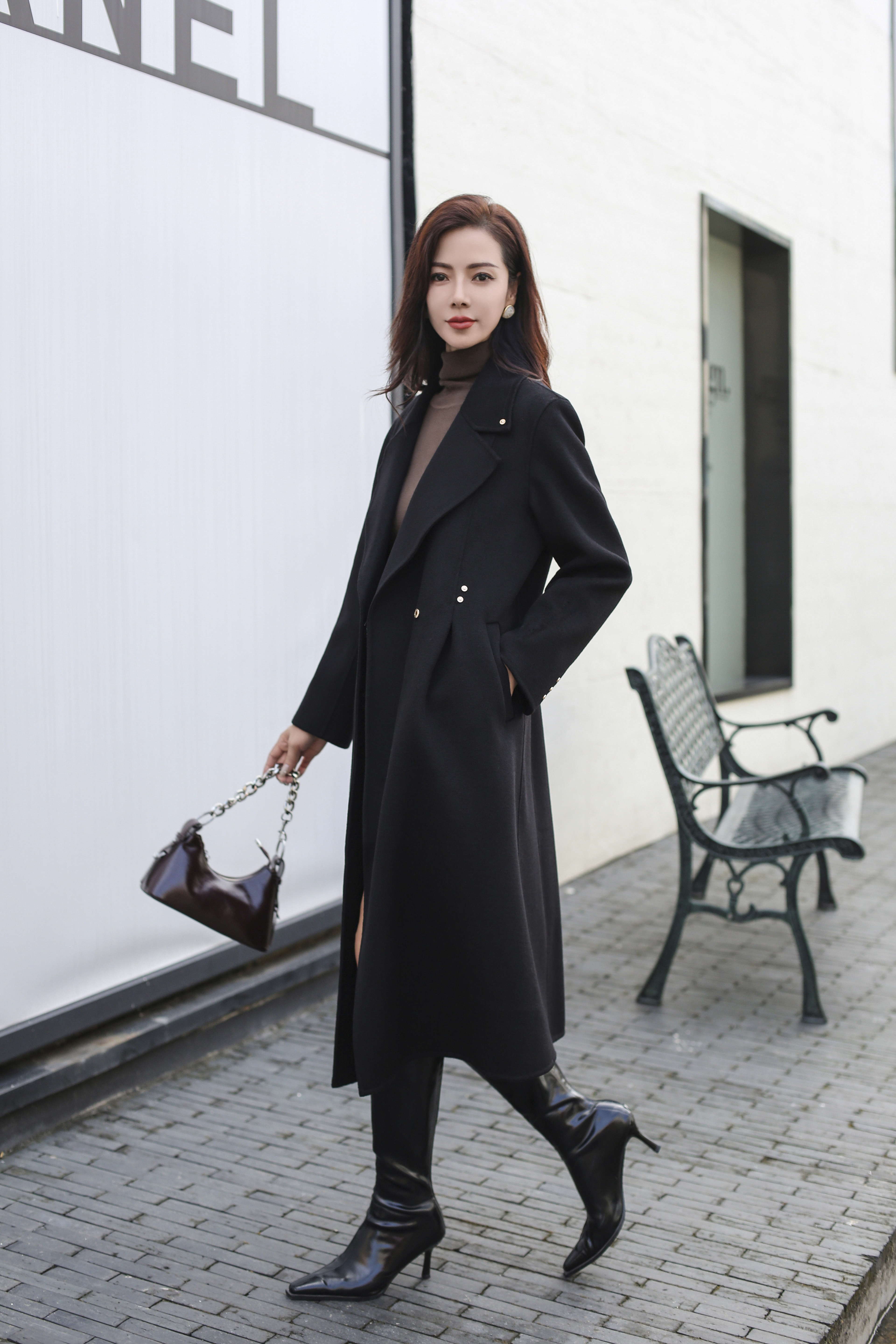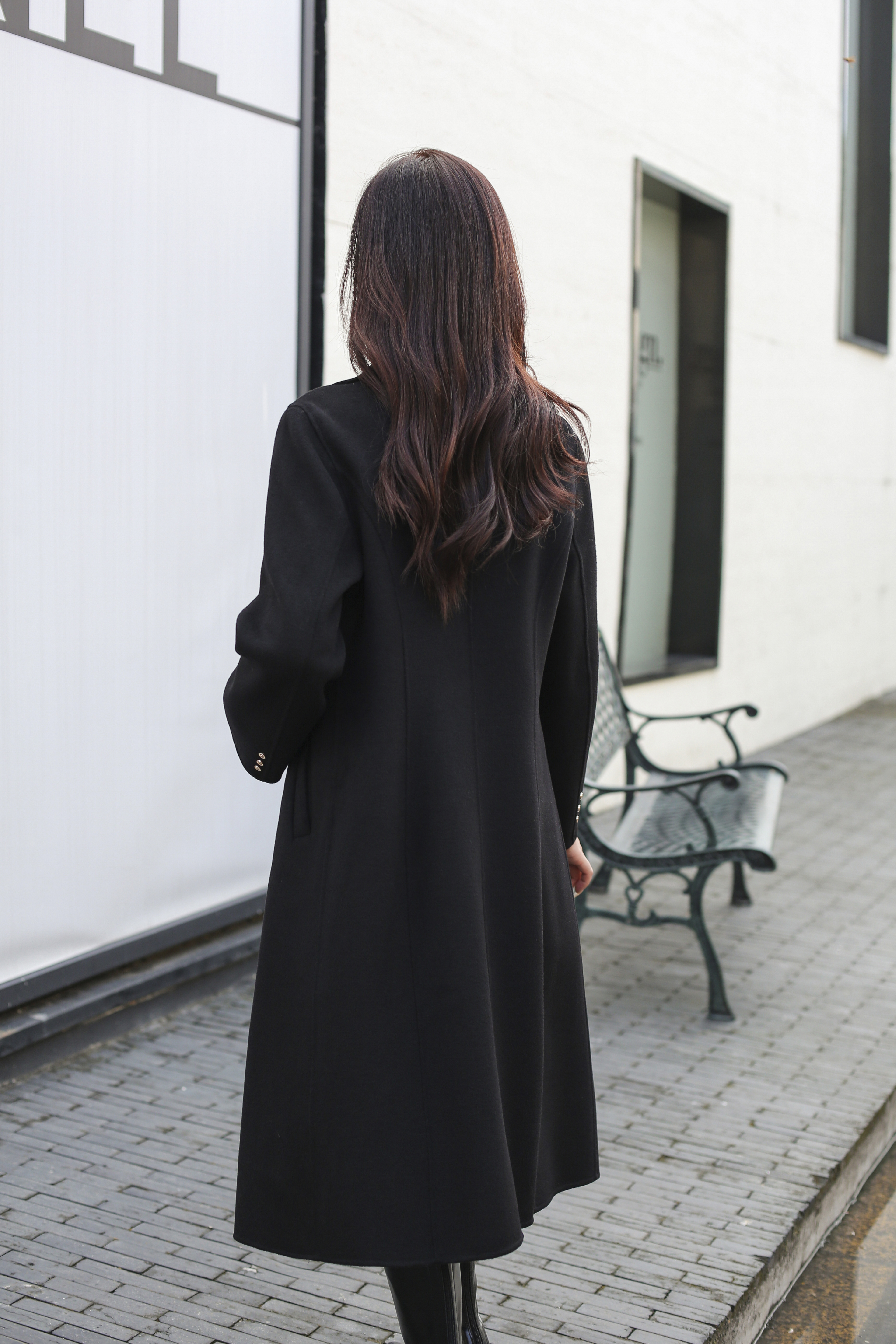 SZ6C15_漆黑色/栀黄色_大衣_冬季_西装大翻领收腰收褶A字摆中长款_高级女装_BERNIEELEN 伯妮斯茵