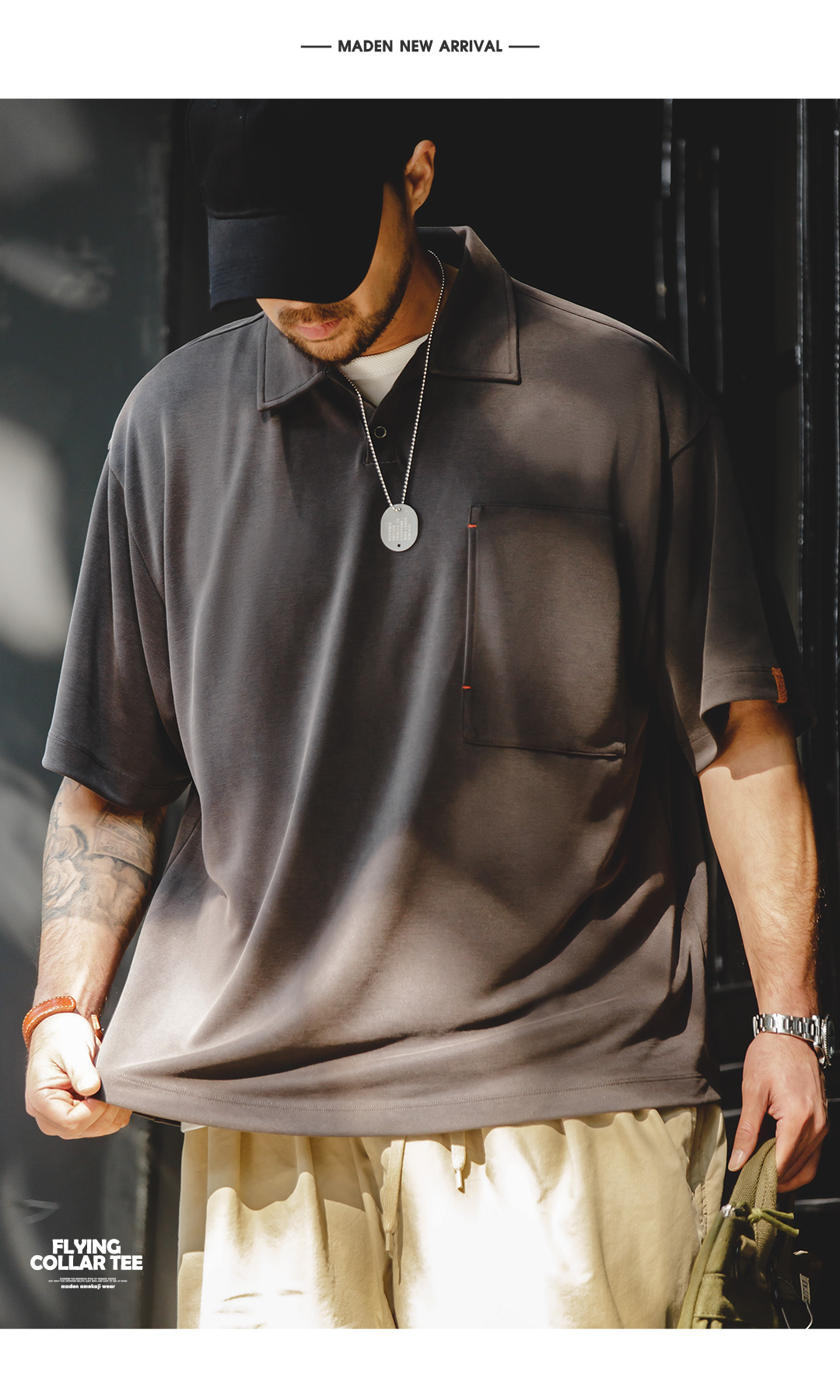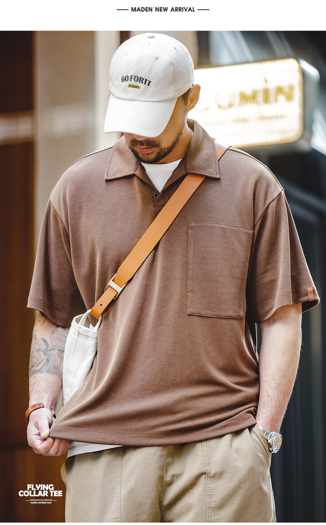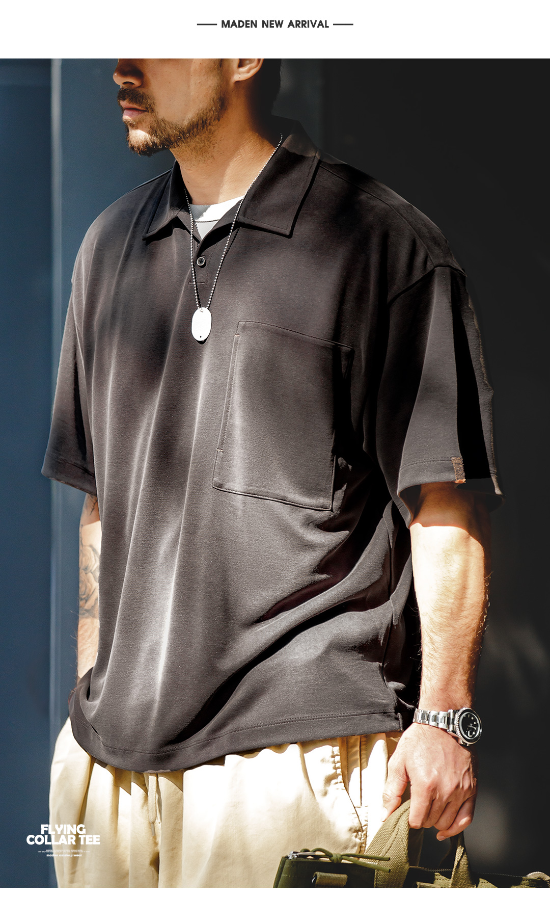 马登工装 美式复古polo领短袖落肩宽松翻领半袖衫莫代尔口袋T恤男夏
