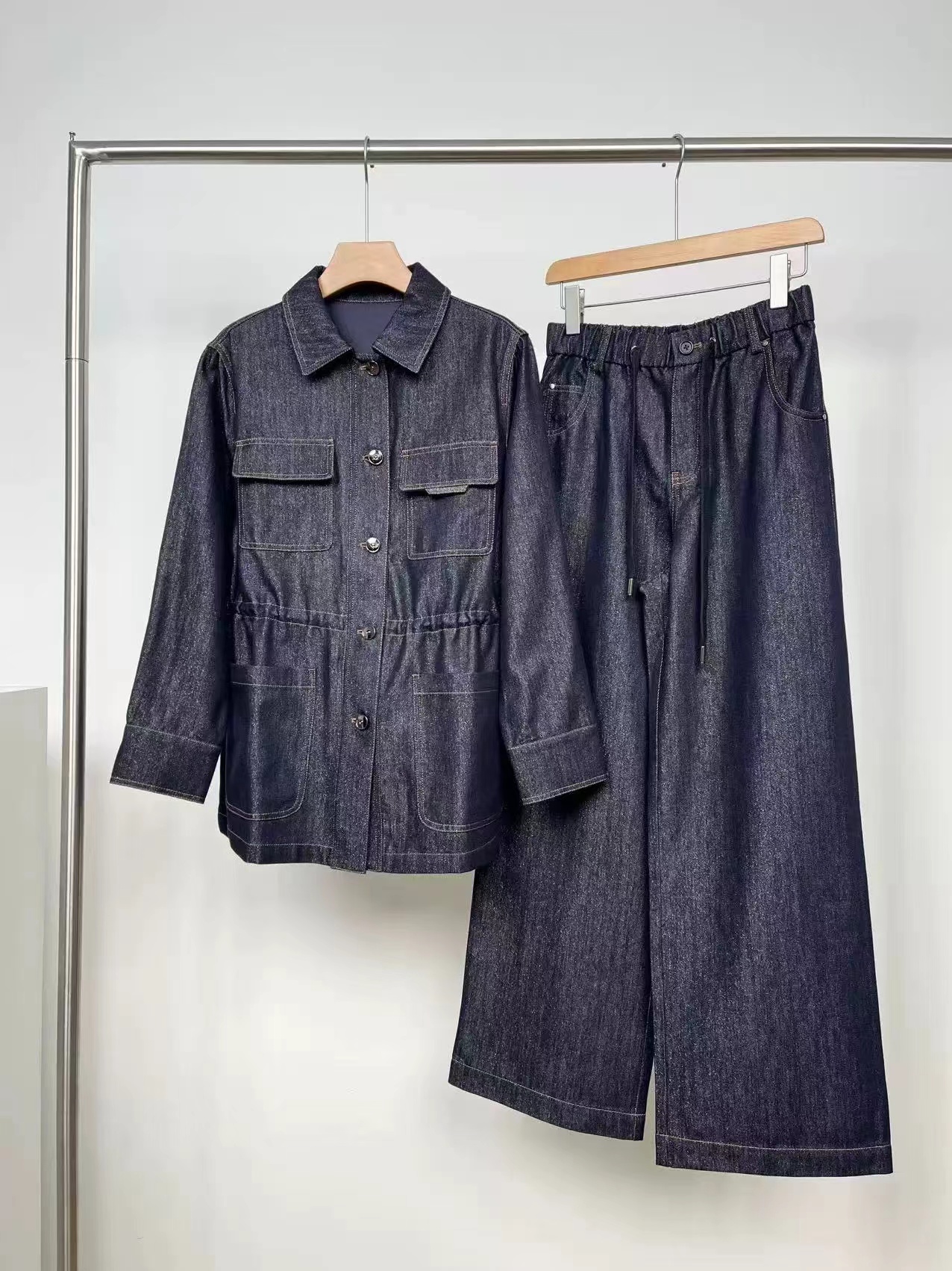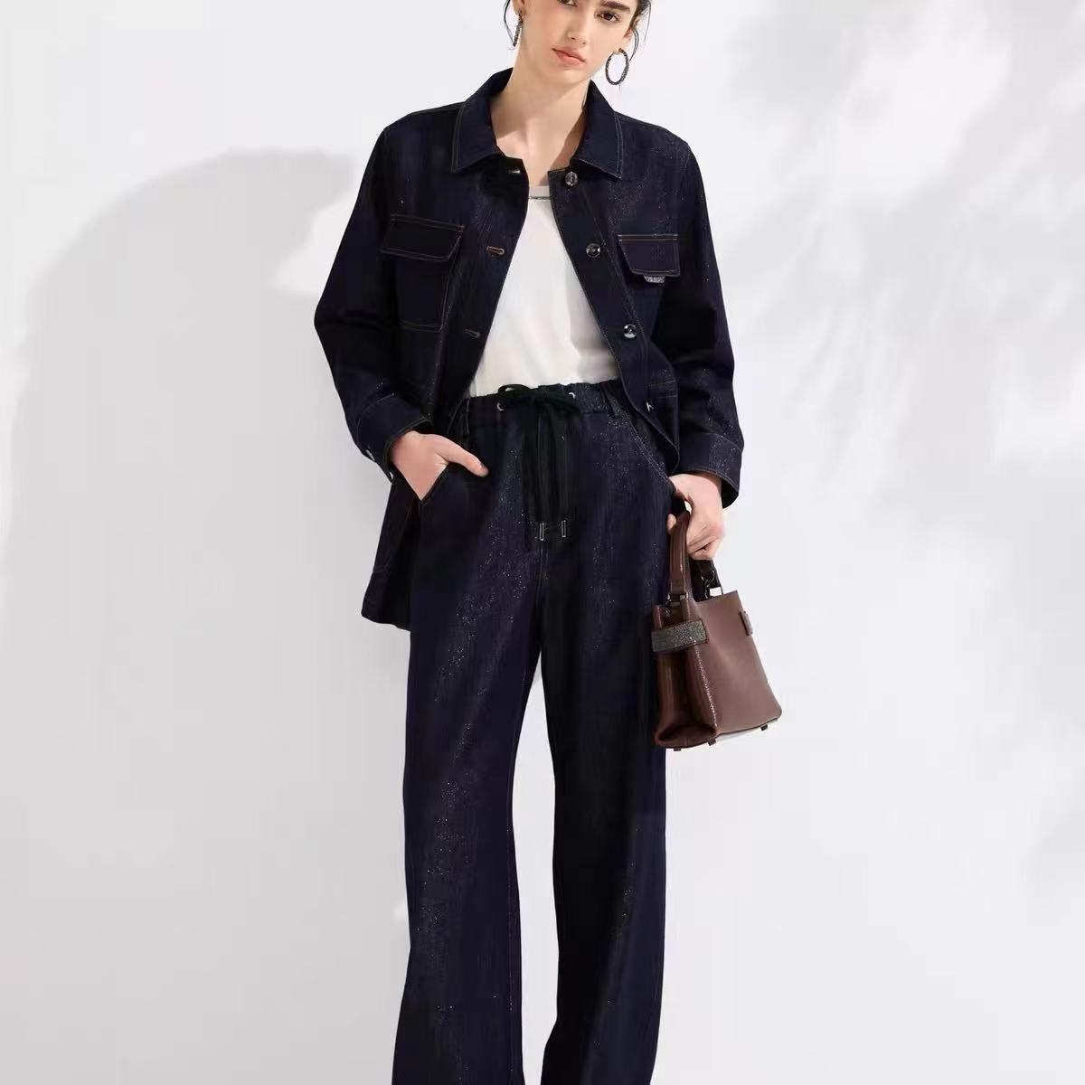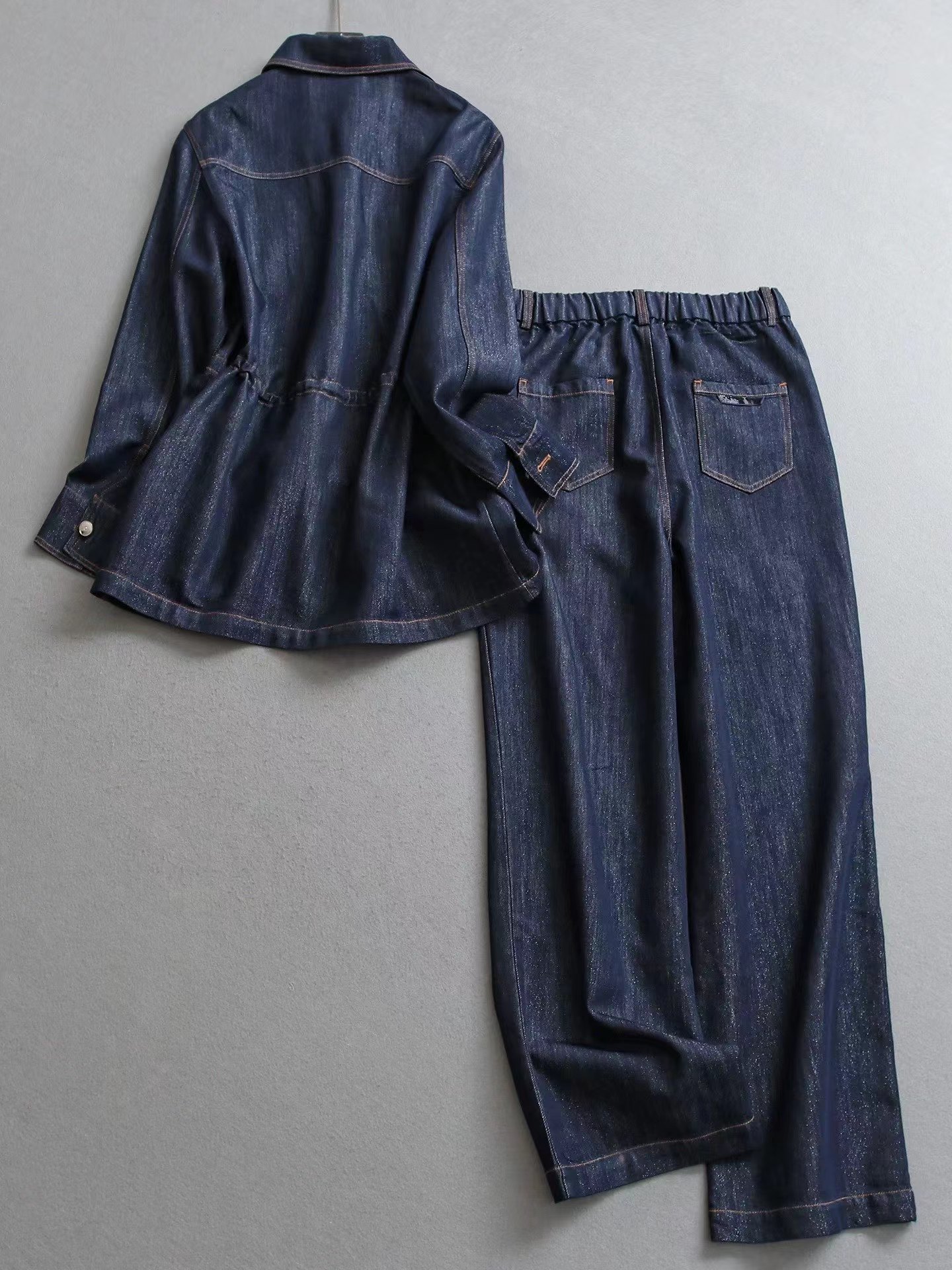 上衣尺码S码肩宽40胸围108衣长71 M肩108裤长103 宽42胸围112衣长72 L码肩宽44胸围116衣长73 裤子松紧腰设计不挑身材 尺码 S码腰围70 臀围104裤长102 m码腰围72臀围108裤长103 L码腰围74臀围112裤长104