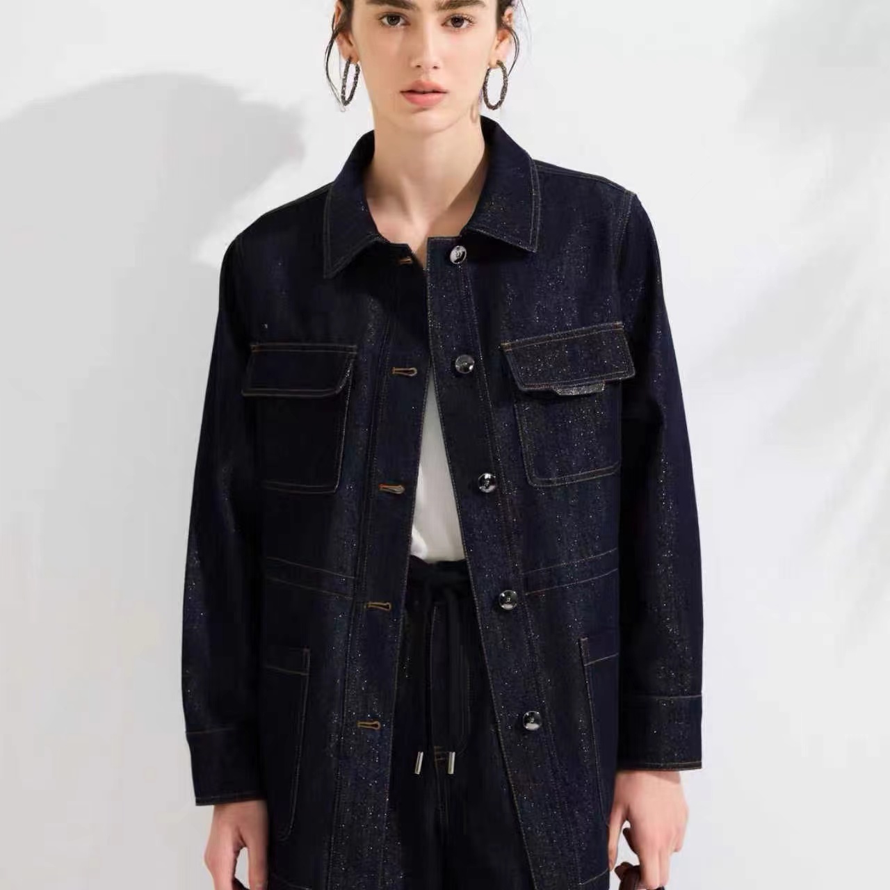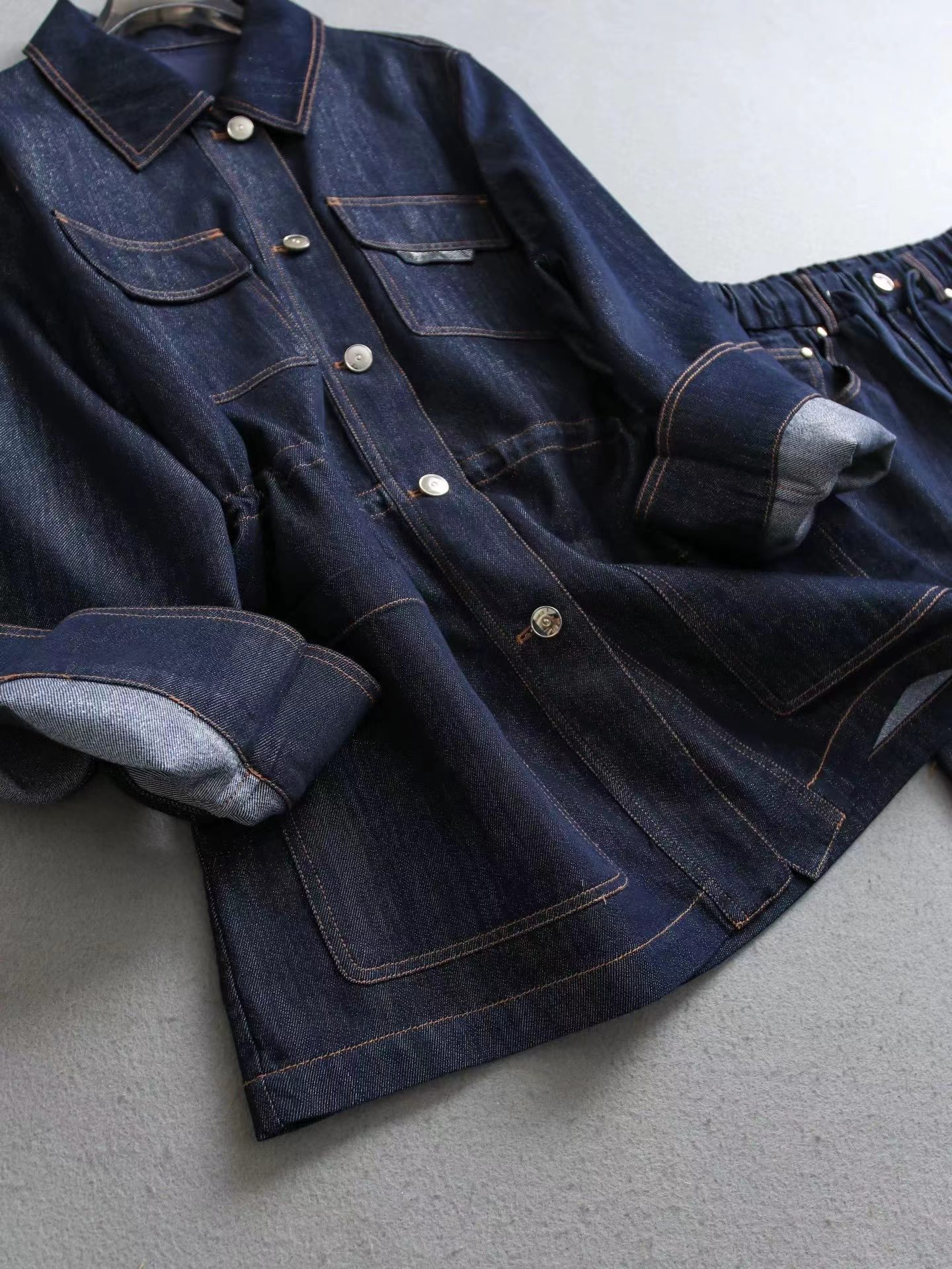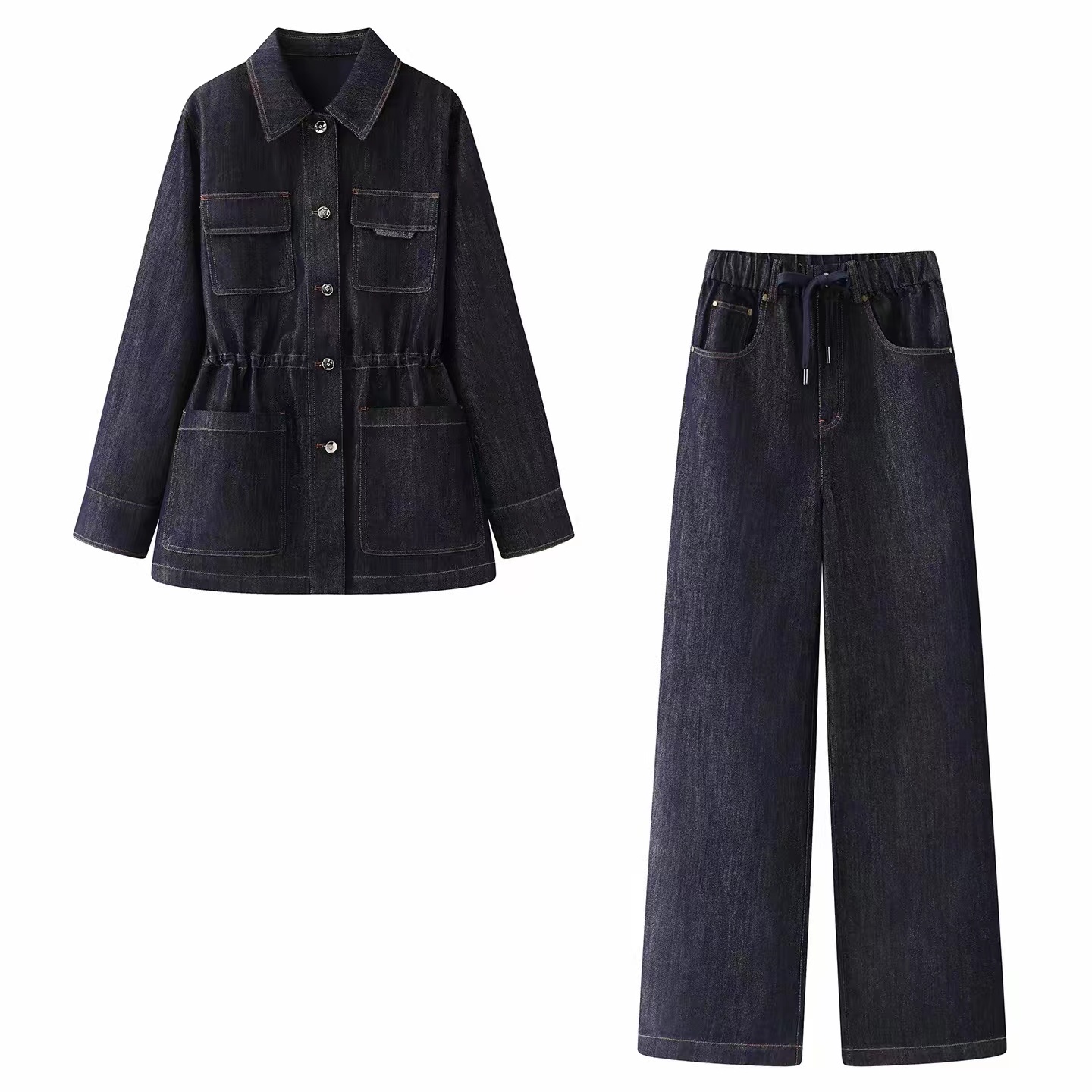 上衣尺码S码肩宽40胸围108衣长71 M肩108裤长103 宽42胸围112衣长72 L码肩宽44胸围116衣长73 裤子松紧腰设计不挑身材 尺码 S码腰围70 臀围104裤长102 m码腰围72臀围108裤长103 L码腰围74臀围112裤长104