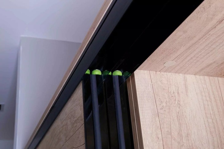 这款爱阁衣柜使用的是欧派克加重滑轮轨道,推拉起来手感顺滑稳重