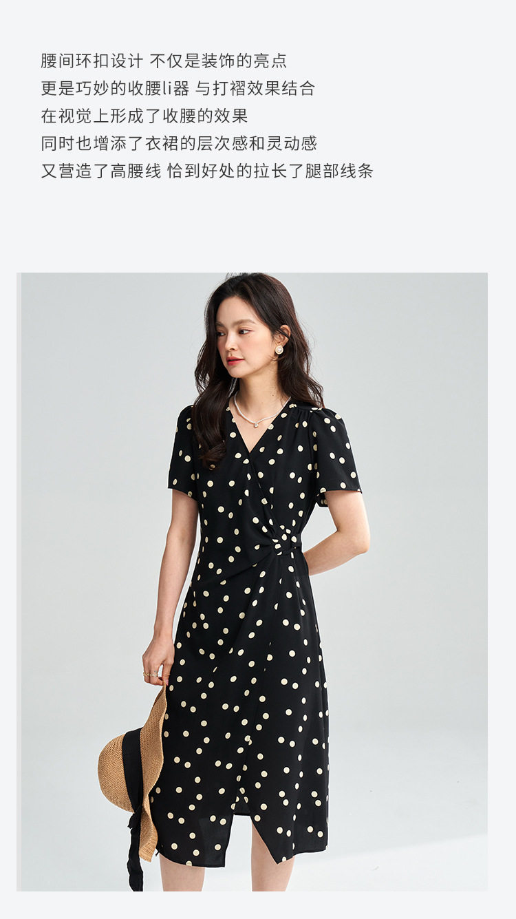 25夏新款红/袖同款泡泡袖黑色波点连衣收腰V领显瘦雪纺裙女18296 商品图4