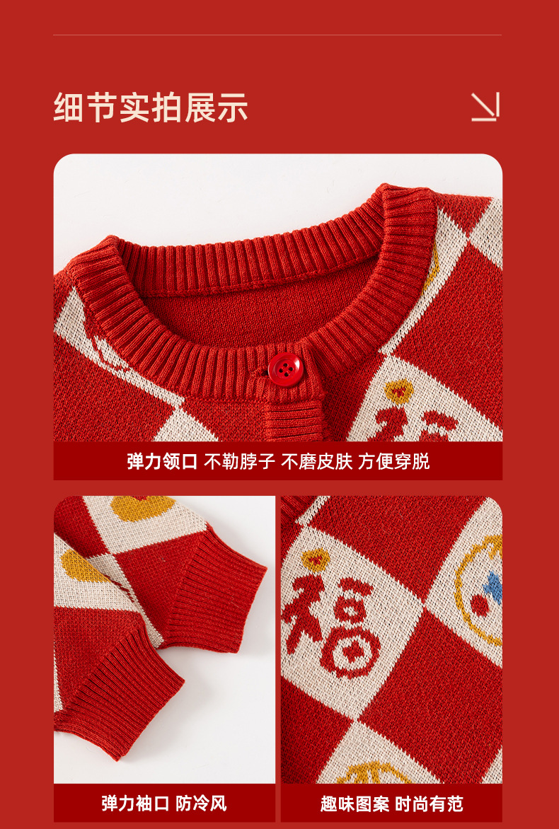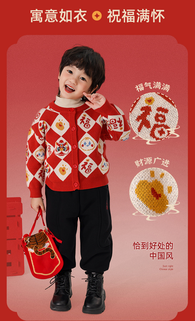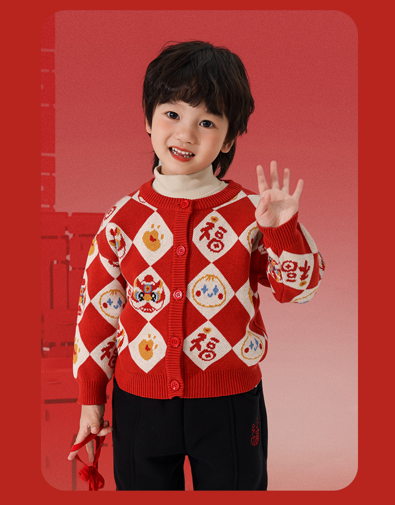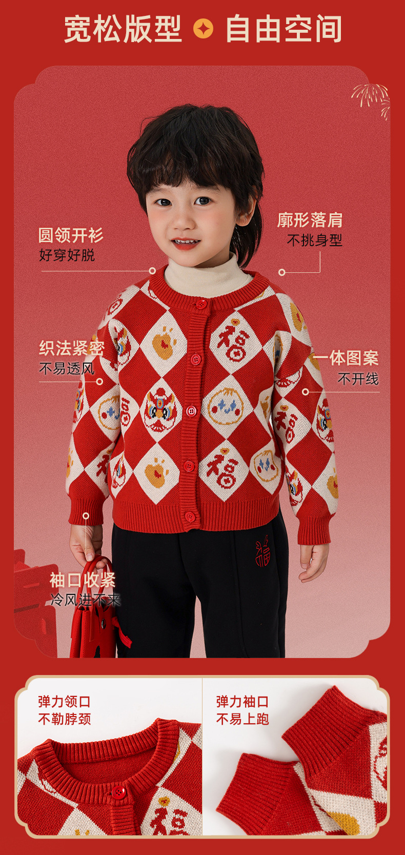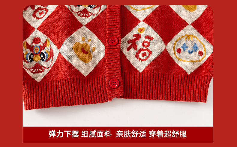 【金狮送福❗️儿童喜庆红色毛衣】寓意如衣祝福满怀,满满细节感,拜年软毛衣光洁手感,贴服无摩擦,冬季新年装开衫外套纯棉L