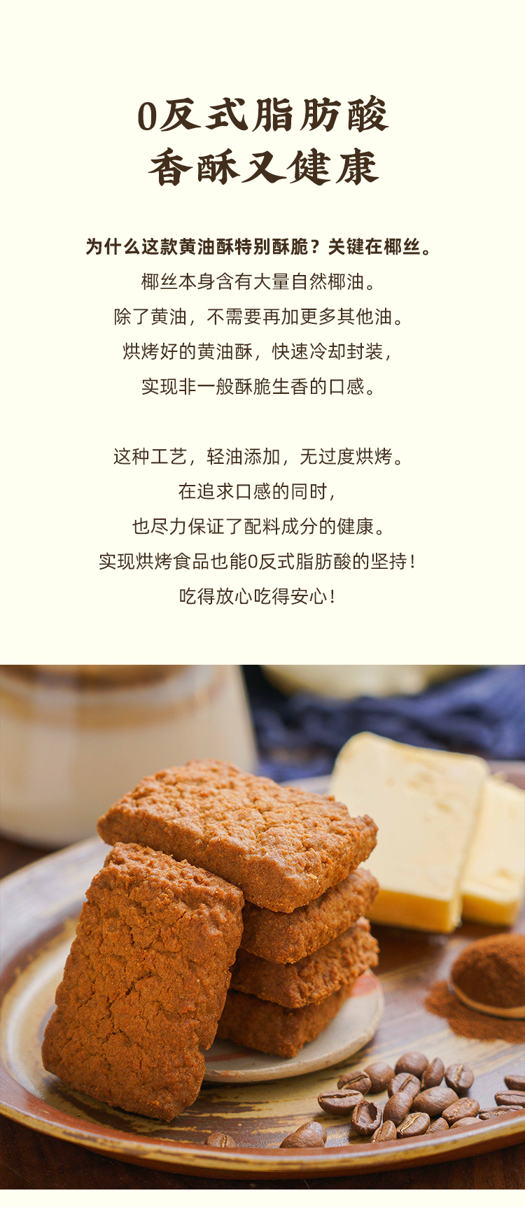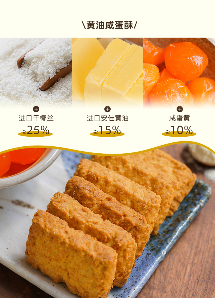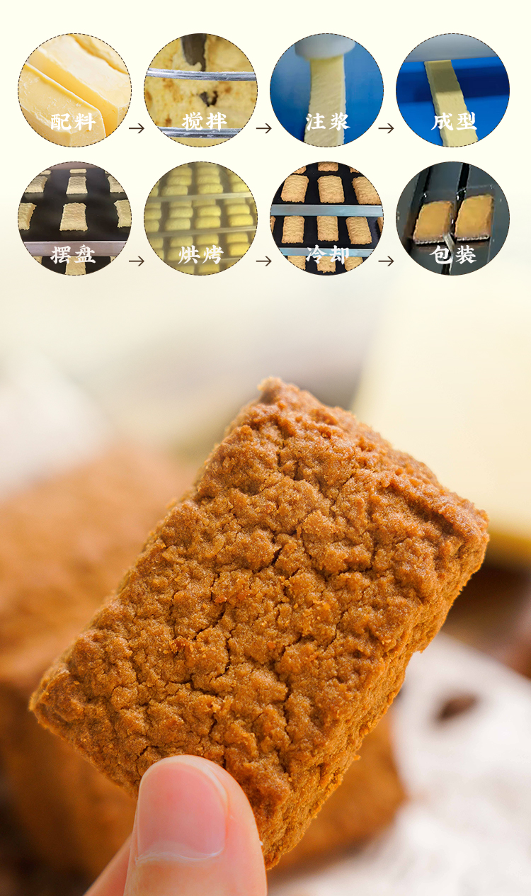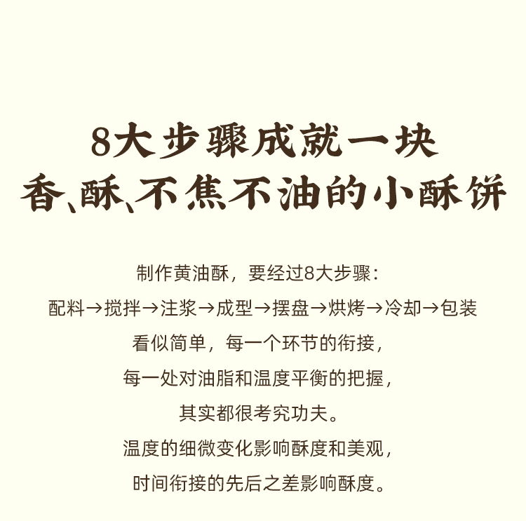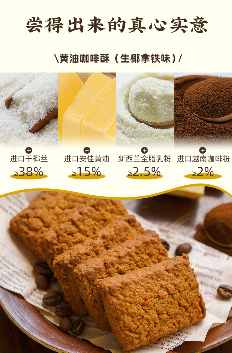一方云拾真的很舍得用料,新西兰进口安佳黄油含量≥15%,作为天然的起酥剂,黄油带来的那种酥松与奶香,真的是味蕾的大享受!还有新西兰进口乳粉+进口干椰丝+越南进口咖啡粉,汇聚全球优质食材,光成本就比一般曲奇高出好几倍。而在制作工艺上,每一块黄油酥都要经过8大步骤:配料、搅拌、注浆、成型、摆盘、烘烤、冷却、包装。看似简单,但每一个环节的衔接,每一处对油脂和温度平衡的把握,其实都很考究功夫。除了黄油,还有椰丝自带的天然椰油,不需要再额外添加,无过度烘烤,非一般酥脆生香!