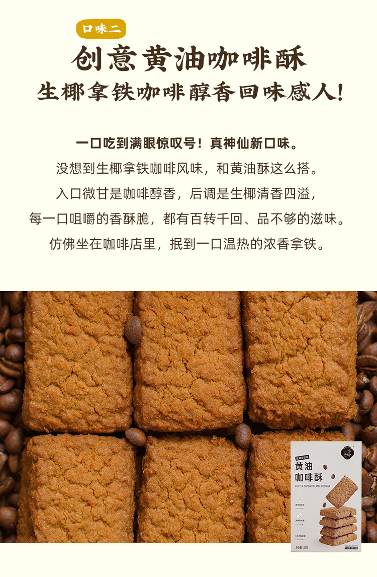 因为他们家的岩烧咖啡太过美味,所以我对黄油酥也是很期待,很有仪式感的试吃了下,果然继续美味!香气浓郁,酥脆绵密,厚厚一块,噗噗掉渣!经典咸蛋黄味,融合浓厚的黄油乳香,一入口就如流沙般化开,纯正奶香,又带点咸咸,层次感人;还有生椰拿铁味,也非常可,咖啡味实实在在,生椰味清香四溢,还咬得到粒粒分明的椰丝颗粒,嚼起来沙沙生香!