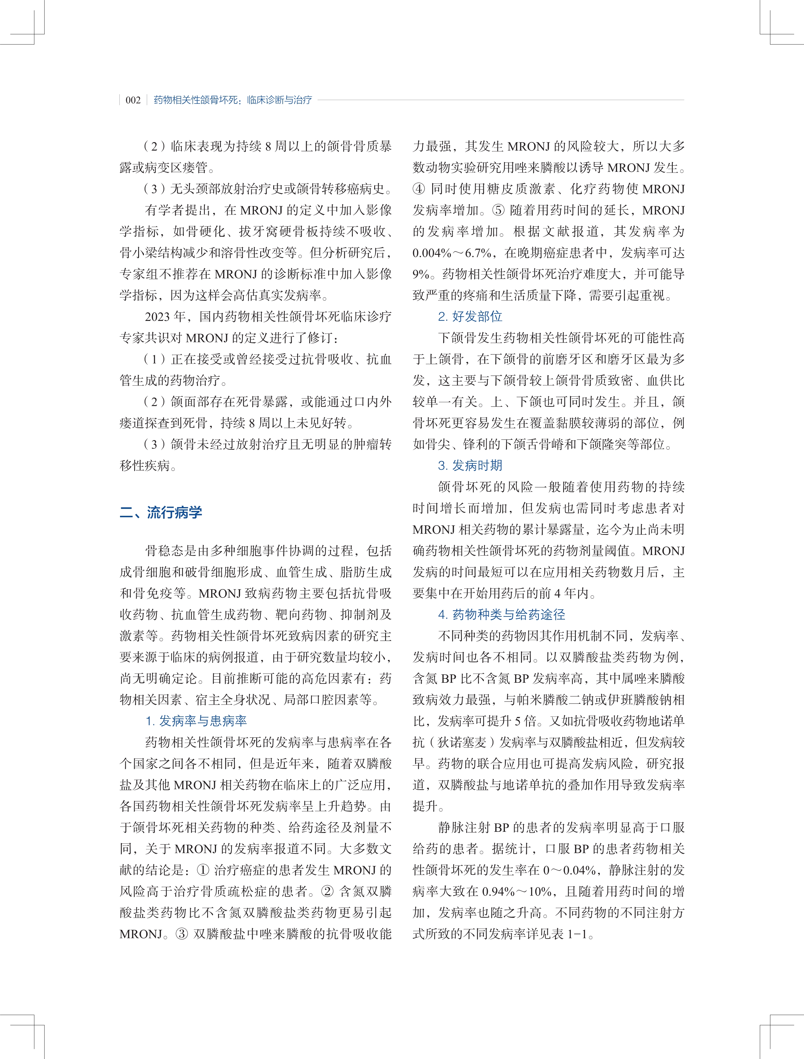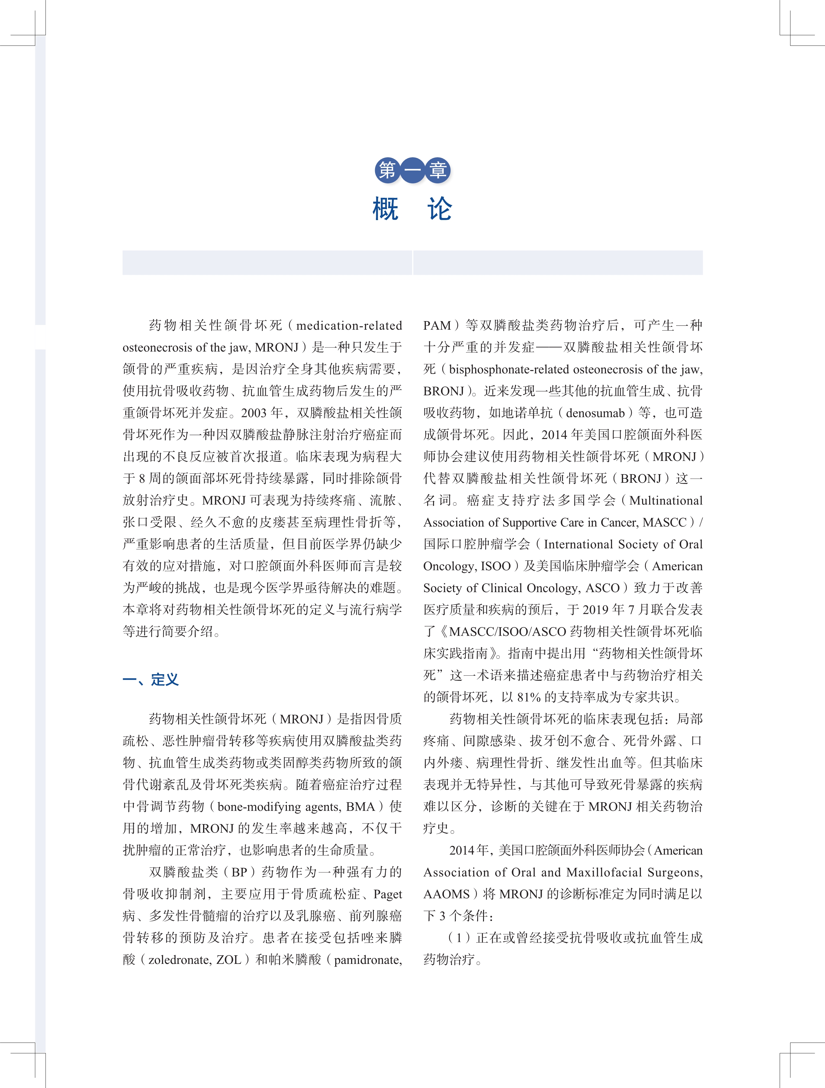 药物相关性颌骨坏死(medication-related osteonecrosis of the jaw, MRONJ)是指因骨质疏松症、恶性肿瘤骨转移等疾病使用双膦酸盐类药物、抗血管生成类药物或类固醇类药物所致的颌骨代谢紊乱及骨坏死类疾病,是口腔颌面外科、肿瘤科、影像科、内分泌科、风湿免疫科、骨科等共同面临的临床难题。