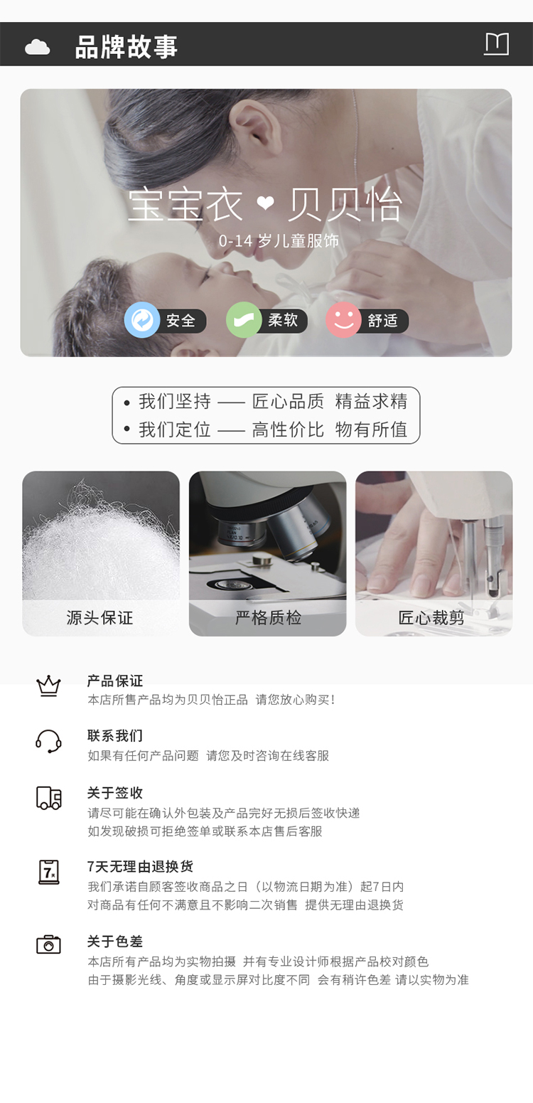 - 贝贝怡专注0-6岁婴幼儿服饰,坚持安全、柔软、舒适的产品理念,为千万中国家庭提供超高品质、安全可靠的婴幼儿服饰产品,妈妈放心,宝宝开心!