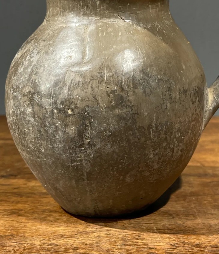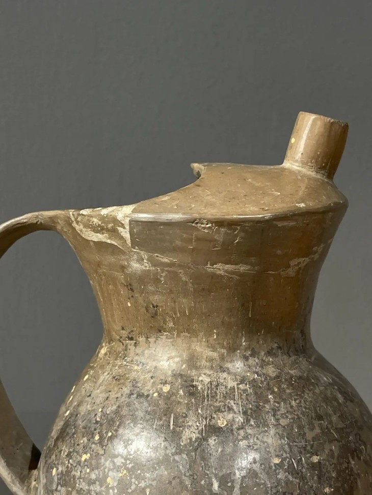 此件灰陶鸱鴞形把手盉与出土的齐家文化陶器的材质、制作方法、与风格相似,可陈设家中,也可用来插野地摘来的花,格外动人,如图所示,环绕器物口沿有破裂修复痕迹,把手修补位置会漏水,边沿有小磕碰伤,除此以外基本保持完好。