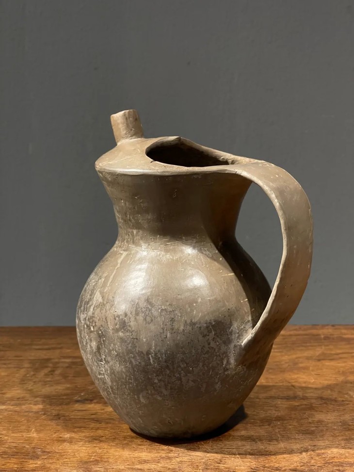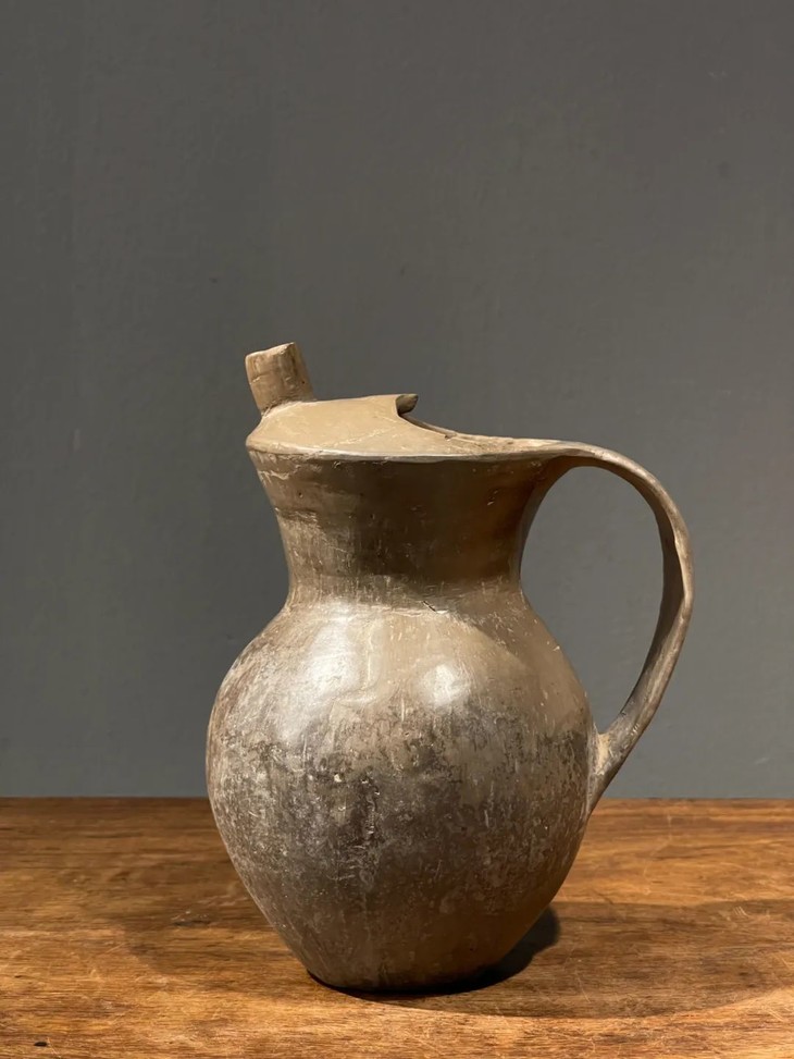 这是一件齐家文化风格的灰陶鸱鴞形把手盉,造型简约,器壁薄,低温烧造的陶器,表面手磨刨光,风格与1924年在甘肃省和政县齐家坪发现的陶器相似,齐家文化分布范围主要在甘肃、青海和宁夏等地。齐家文化陶器多为泥质红陶和砂质红陶,另有少量灰陶,以手工制作为主。器物的种类有杯、盘、碗、罐、甑等。纹饰以篮纹和绳纹最为普遍。