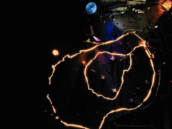 浩瀚星空下,长长的灯带把沙滩分成了一块块小区域,