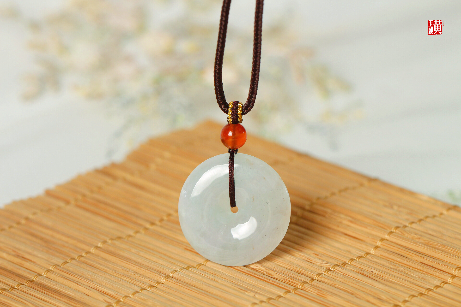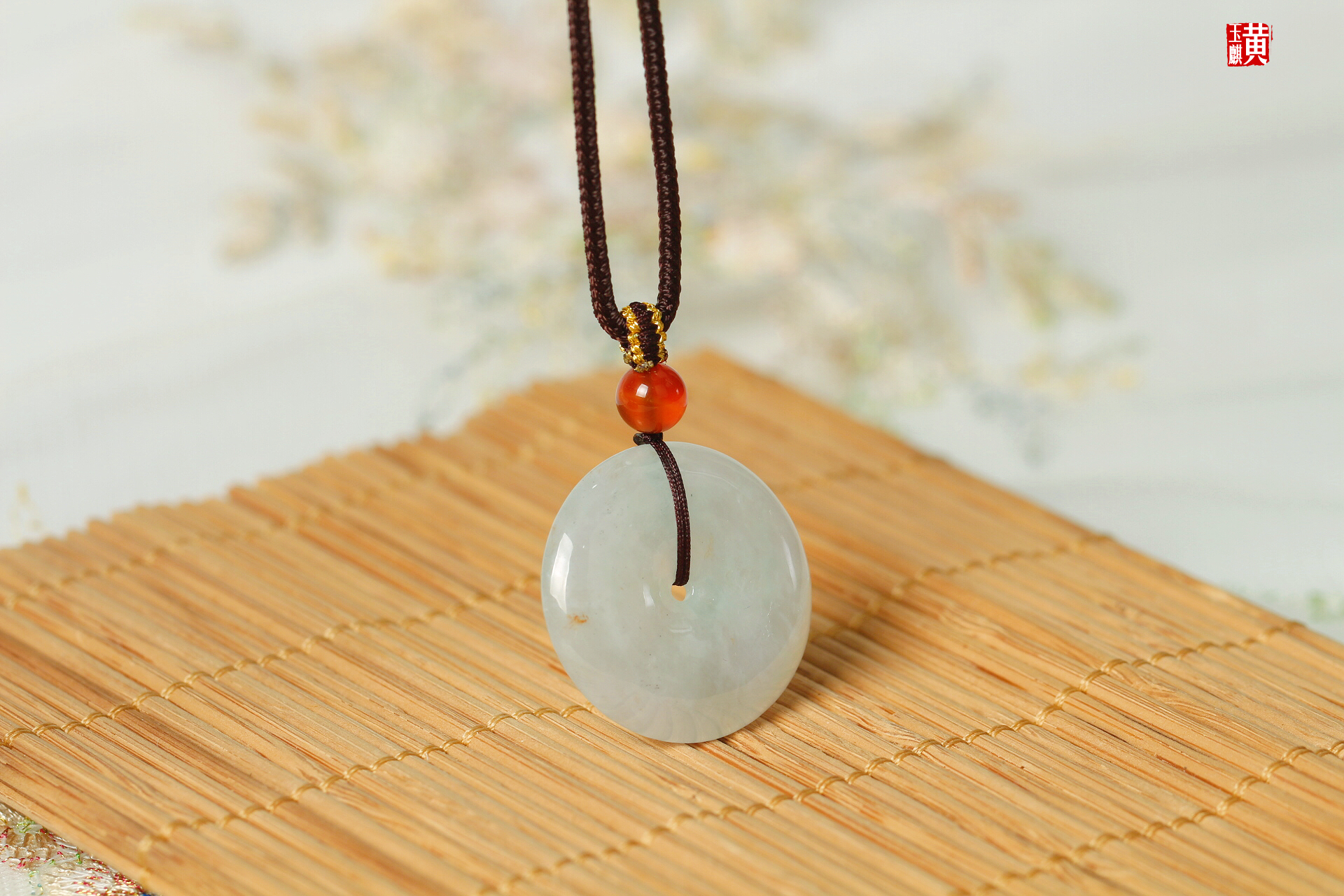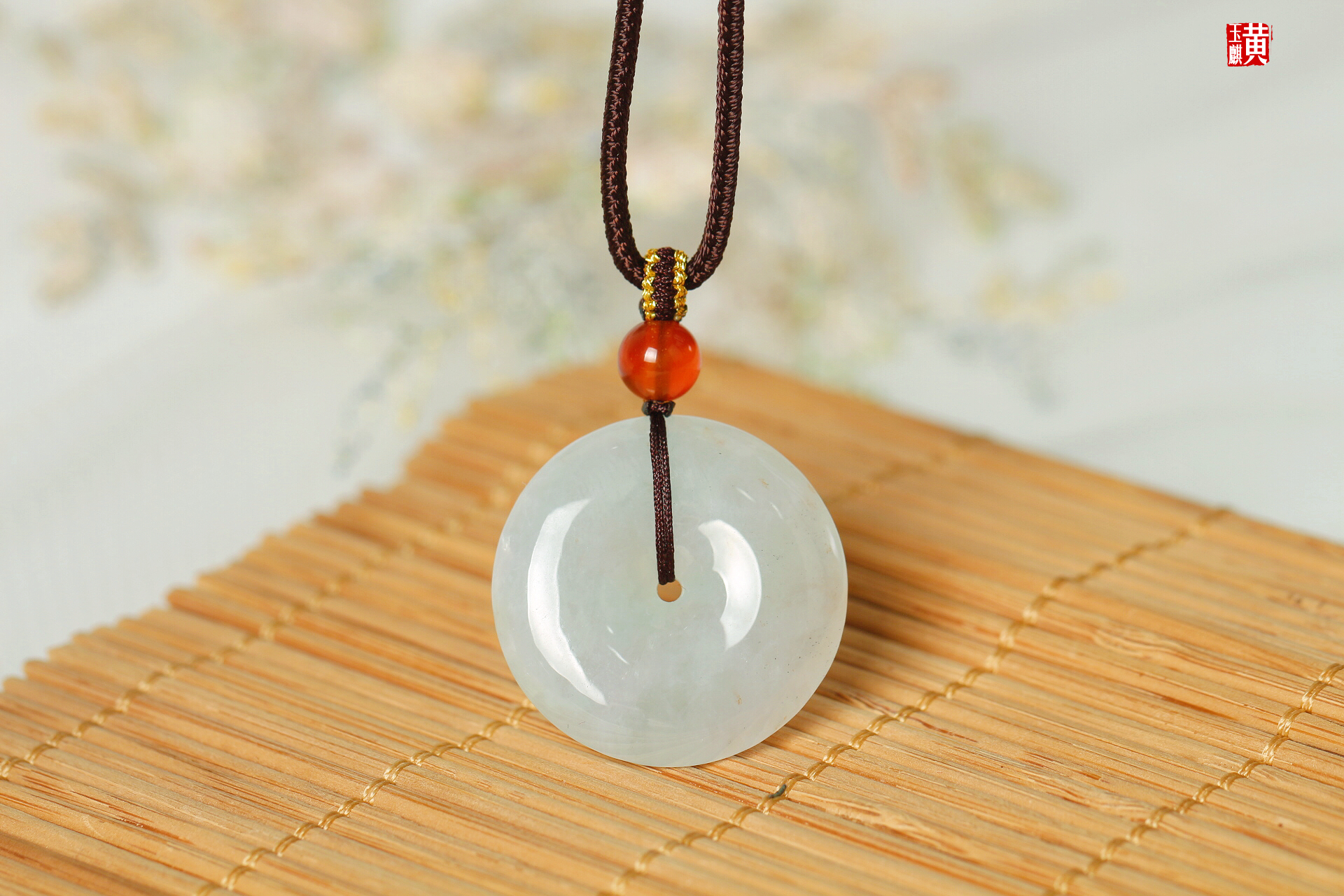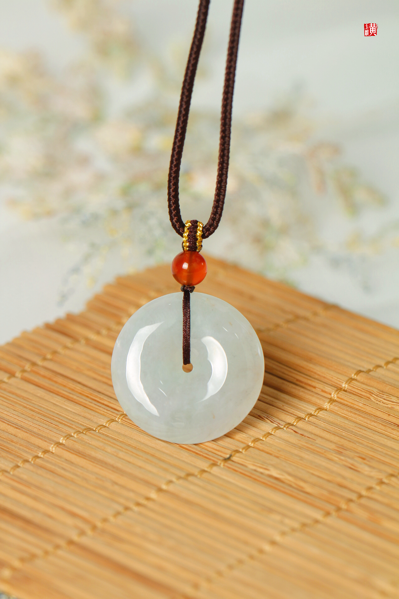 天然翡翠平安扣吊坠,水头灵动,色泽清雅,平安扣饱满圆润,寓意平平安安,圆满幸福,佩戴清爽宜人。
