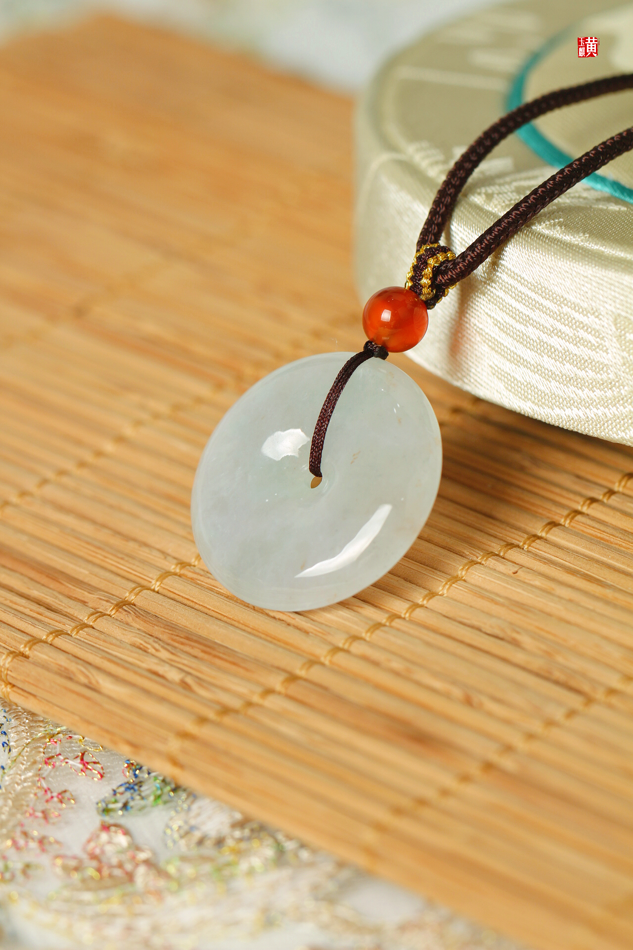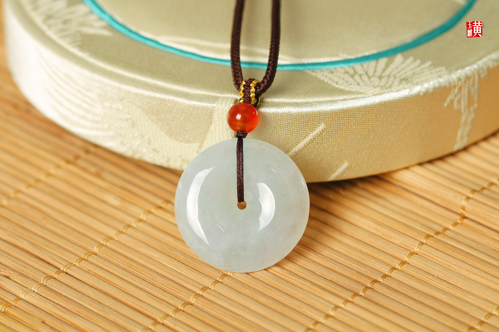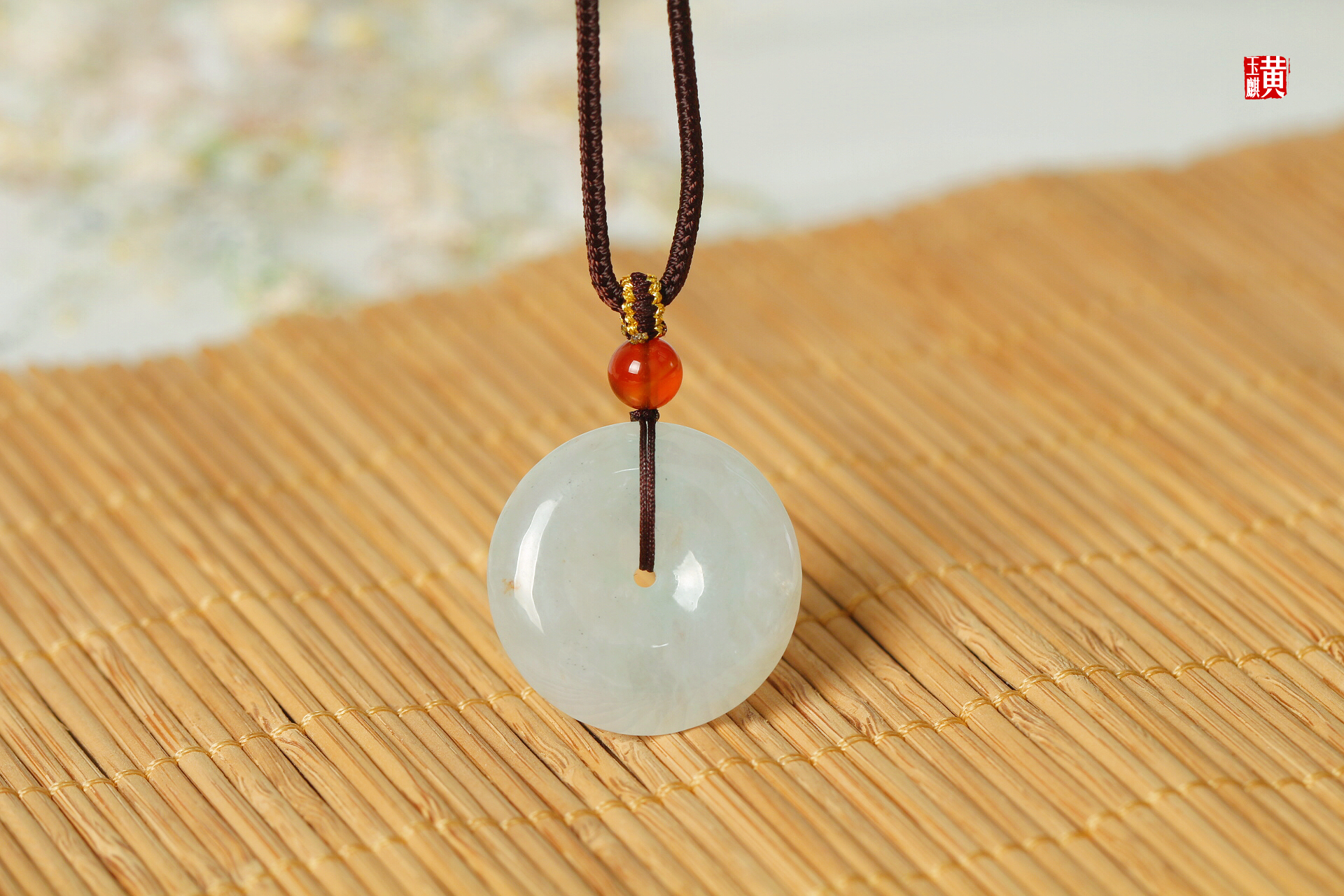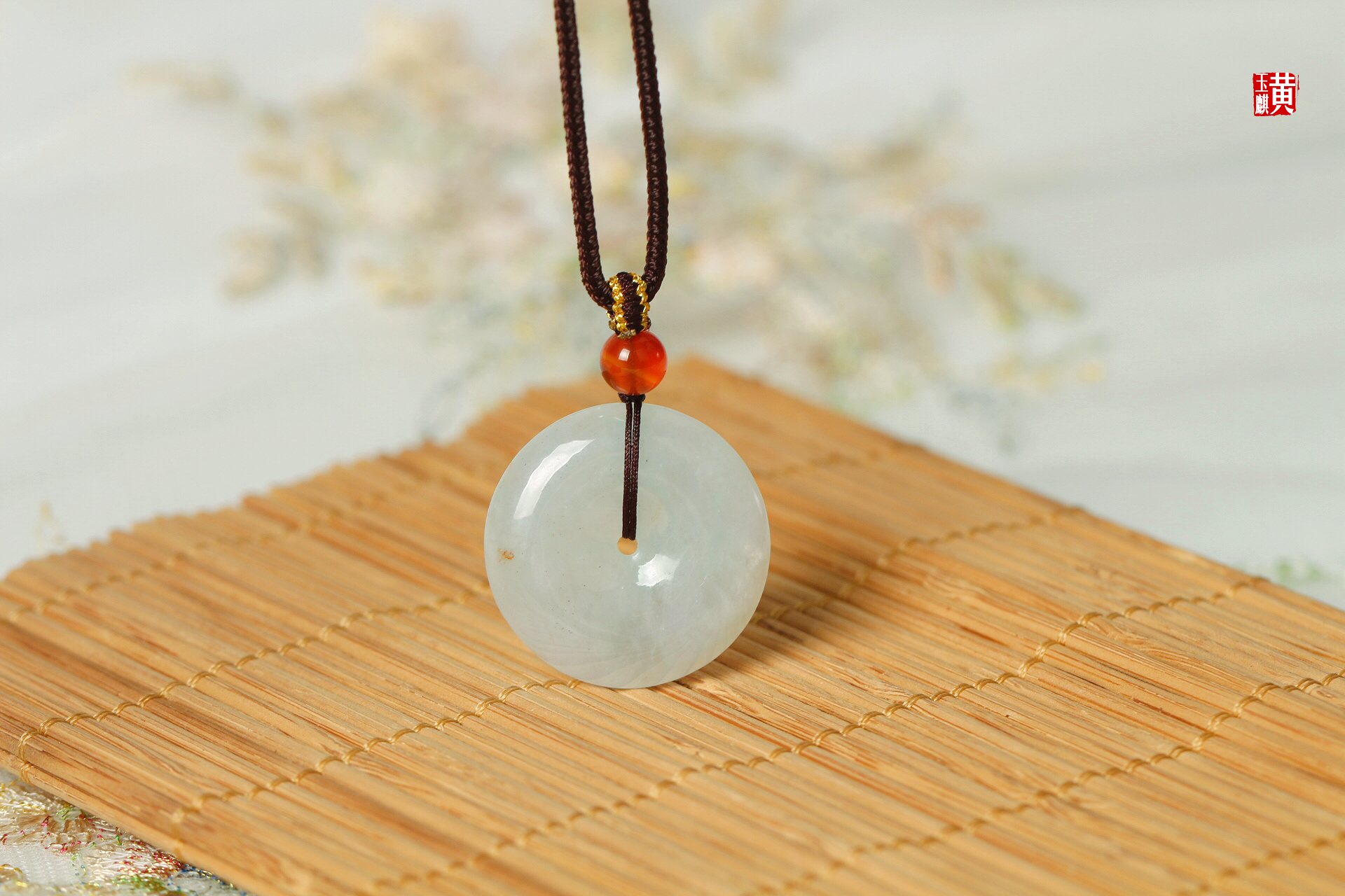 天然翡翠平安扣吊坠,水头灵动,色泽清雅,平安扣饱满圆润,寓意平平安安,圆满幸福,佩戴清爽宜人。