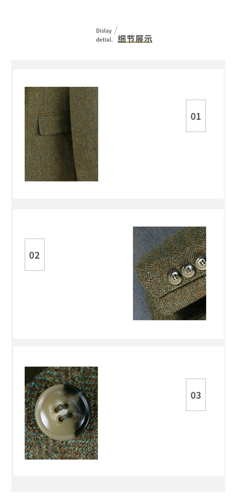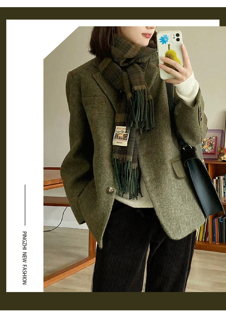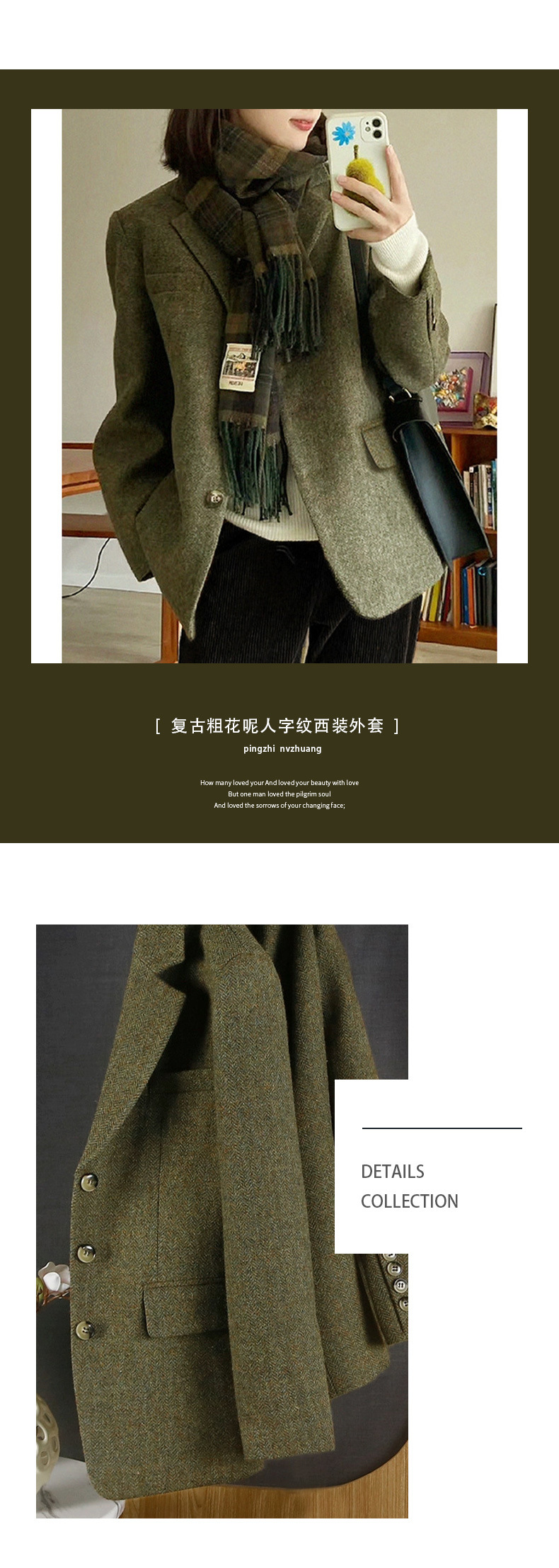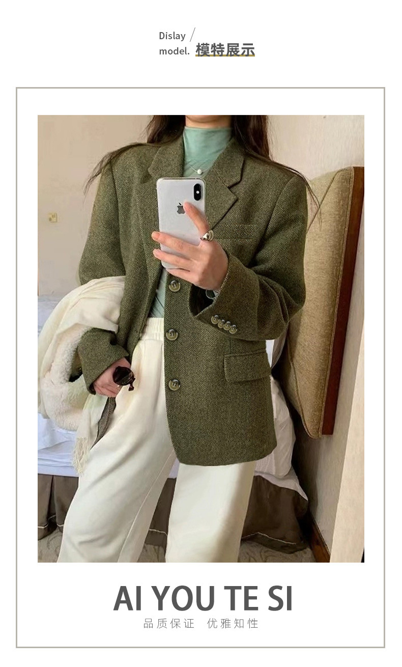 100%羊毛西装外套高质感人字纹复古粗花呢春秋季新款绿色短款女装