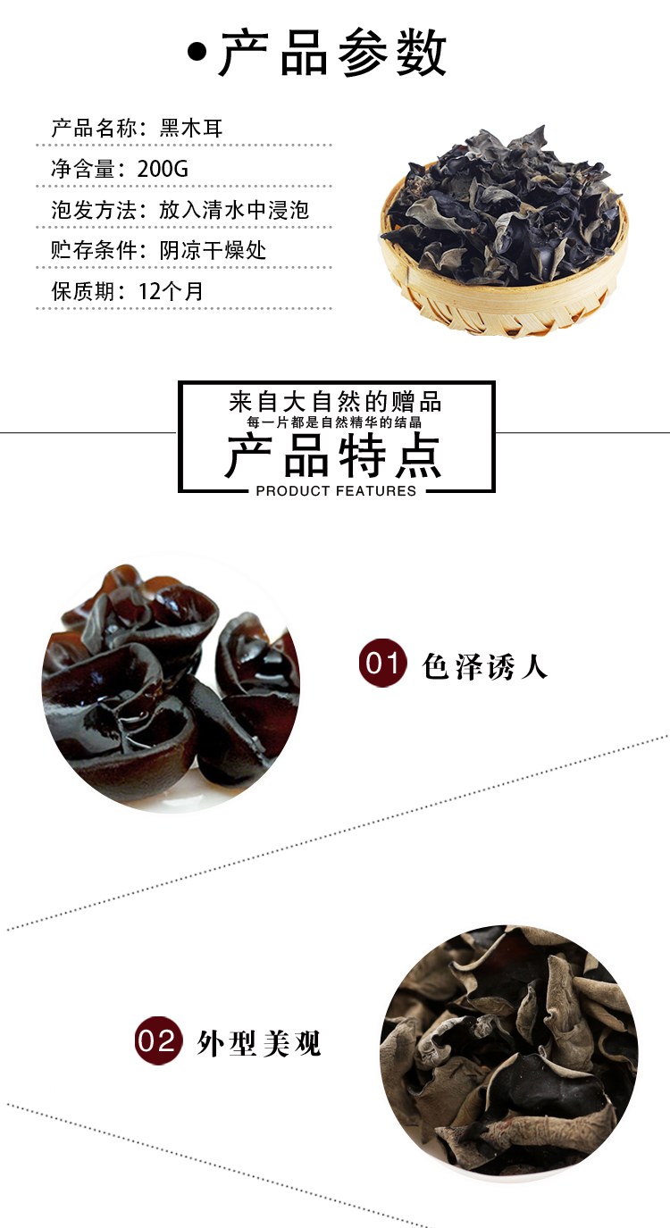 精选黑木耳200G干货木耳无根肉厚泡发率高