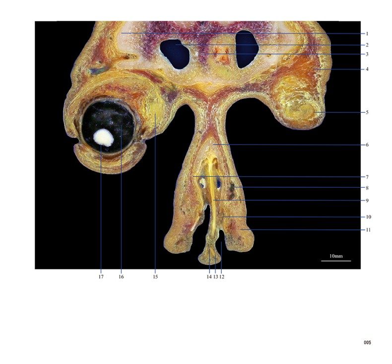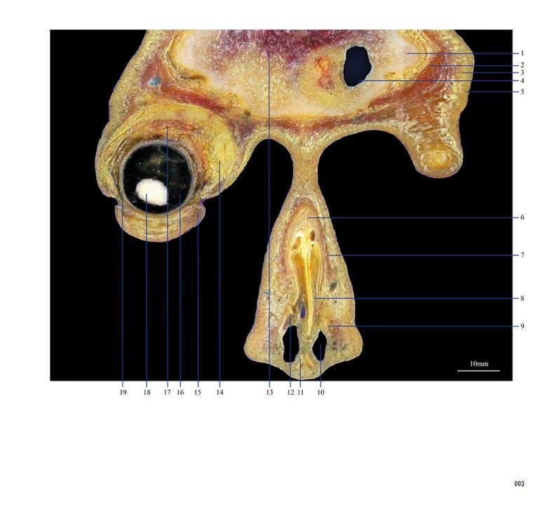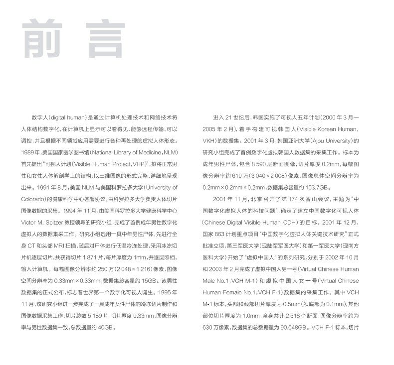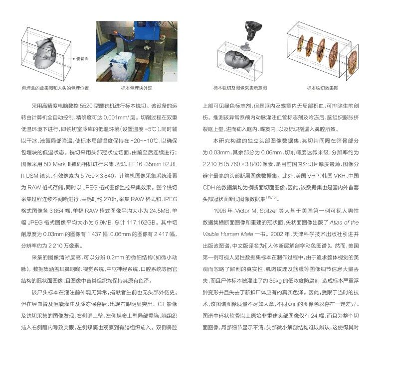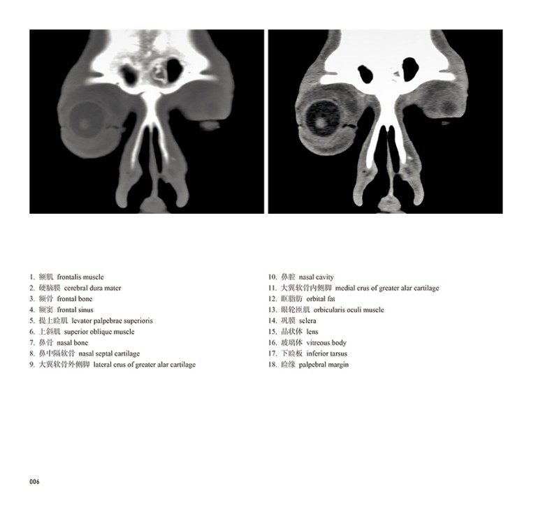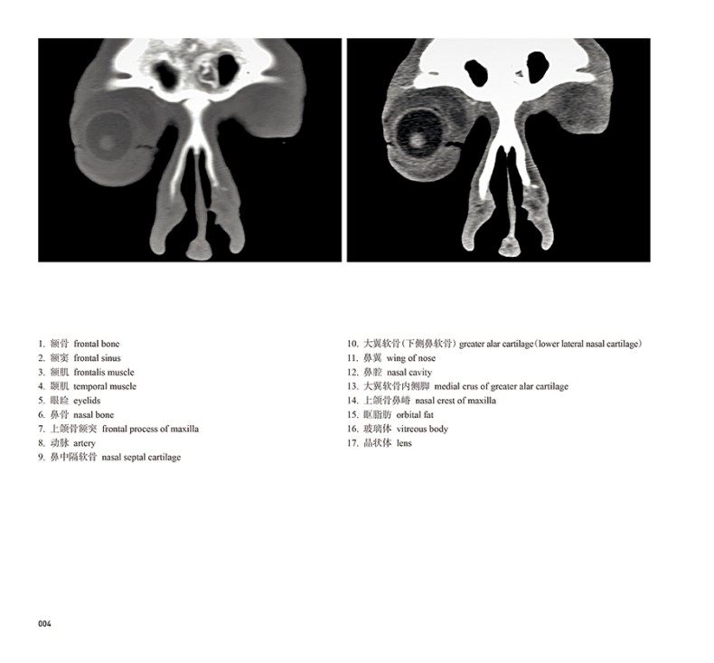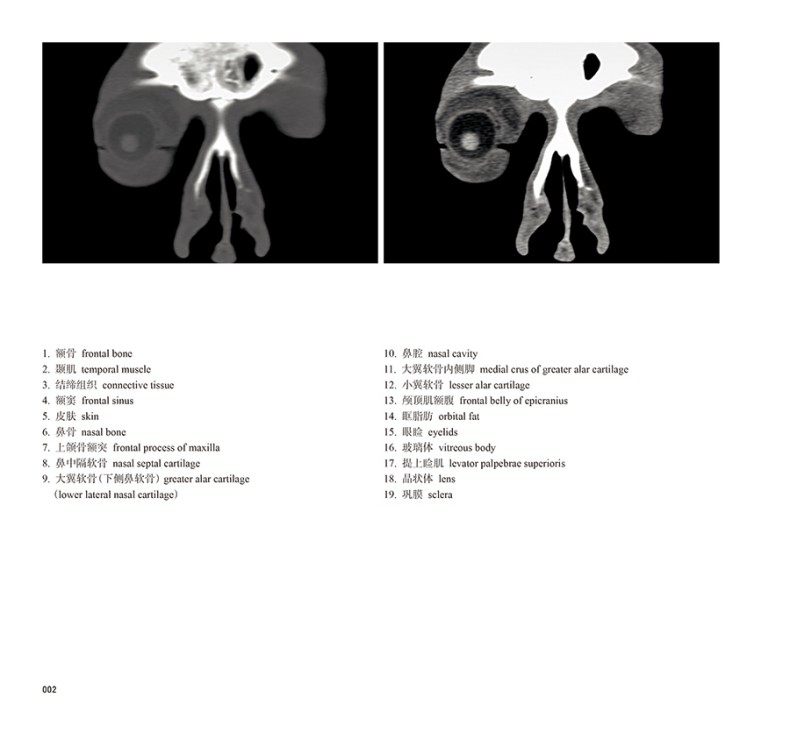 本书从数据集每隔1.2mm选取一幅图像,截取眼、耳、鼻及毗邻颅底的局部区域图像,共112幅图像。同时配以相应部位的CT图像对照。本书特色是断层解剖图利用数字图像处理技术优势,放大并清晰展示眼、耳、鼻及毗邻颅底断面的局部区域结构,组织色泽真实,甚至能够清晰显示肌肉纹理、筋膜纹路等细节结构,图像质量高于美国《人体断层解剖学彩色图谱》(引进版)类似图谱图像质量。对眼科、耳鼻咽喉科医生理解相关解剖结构有较大帮助。