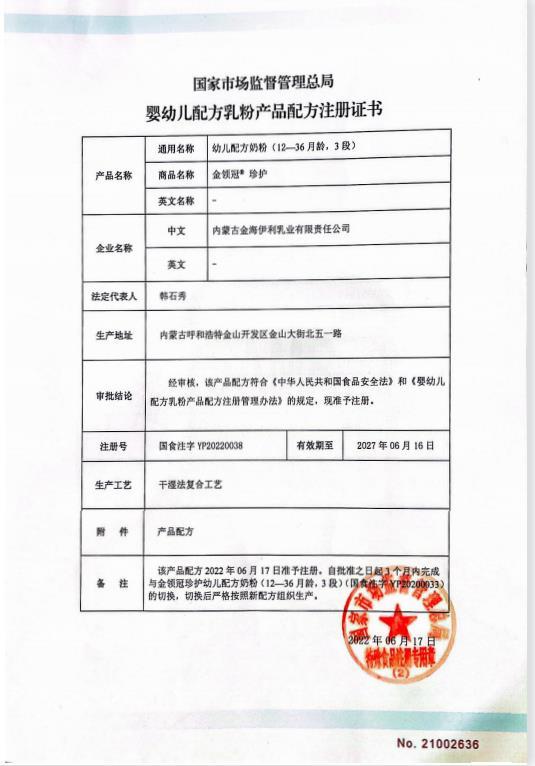 伊利金领冠珍护奶粉3段800g(12-24月龄)
