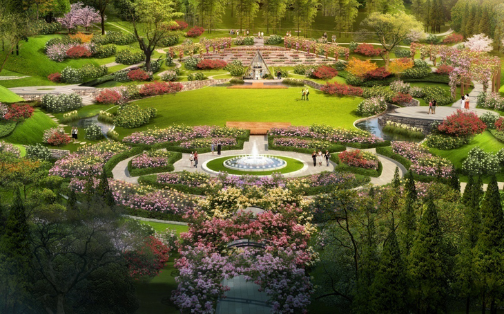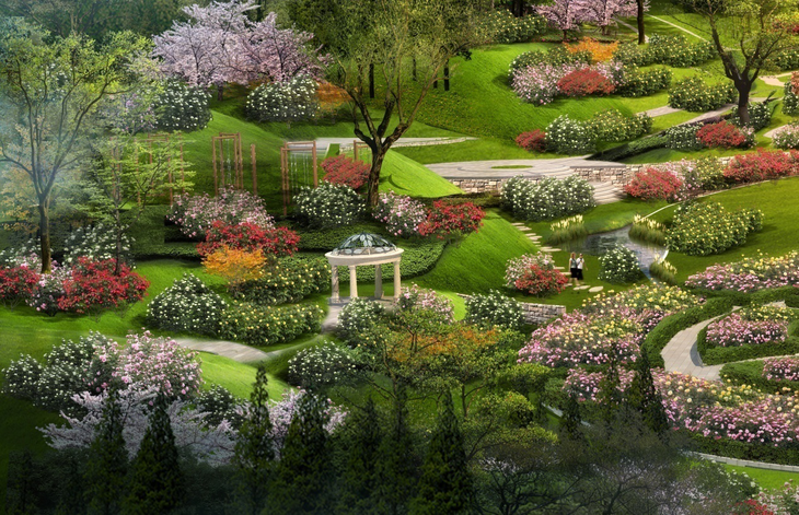 花园由精灵泉、奥斯汀的家、英伦花园组成,由玫瑰长廊为主环线串联全园,每年的3-11月持续开花,场面恢弘,雕琢细致。园艺师以色彩和气味为主题,通过色彩渐变,为之量身设计绚烂的区域主题,打造一个充满浪漫主义的唯美花园。