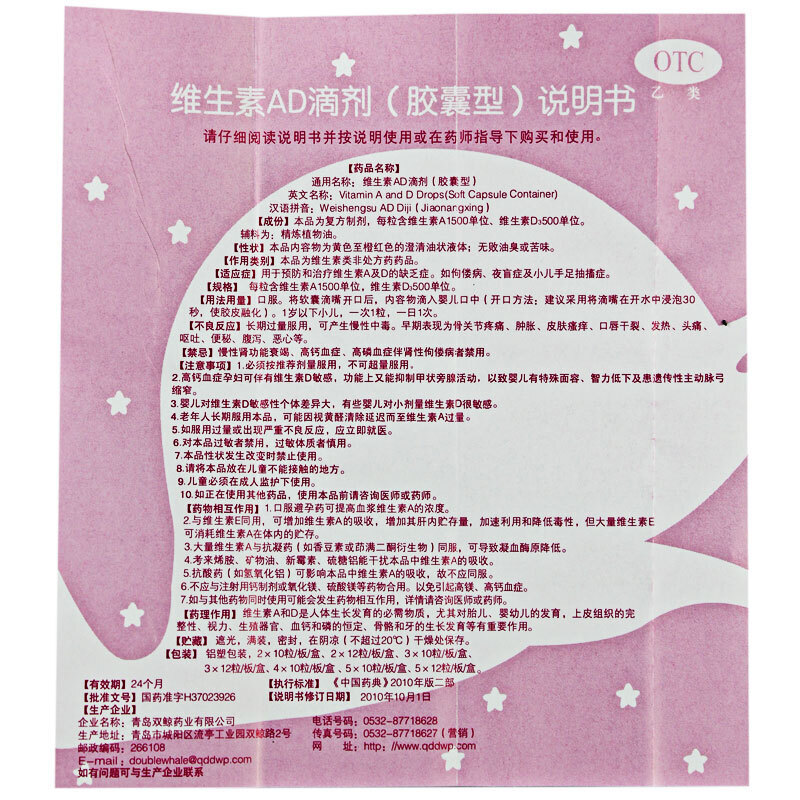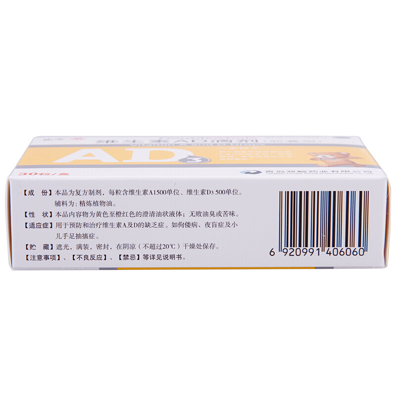 包邮】双鲸 维生素AD滴剂 30粒/盒(1岁以下)补充维生素AD佝偻病