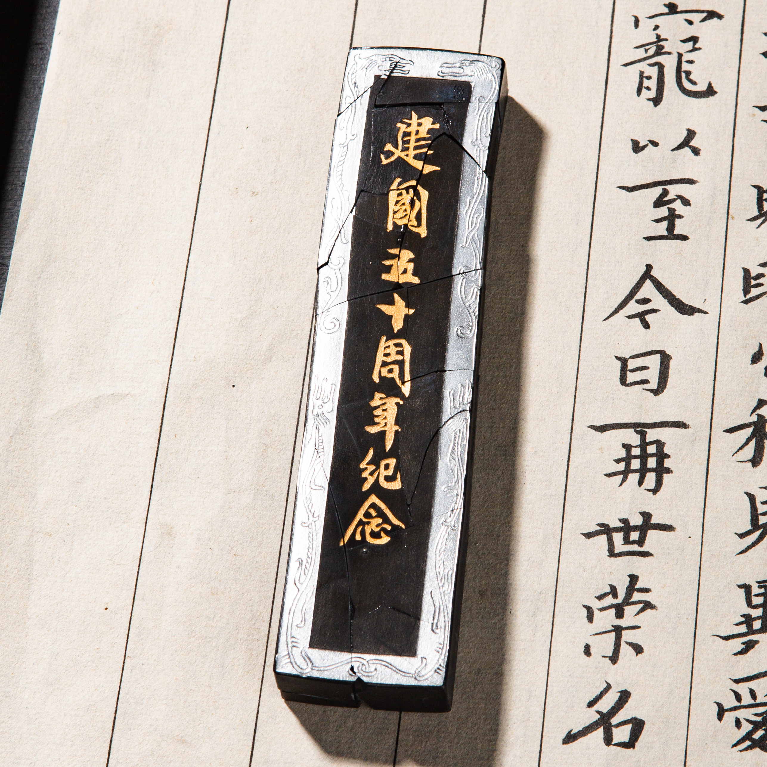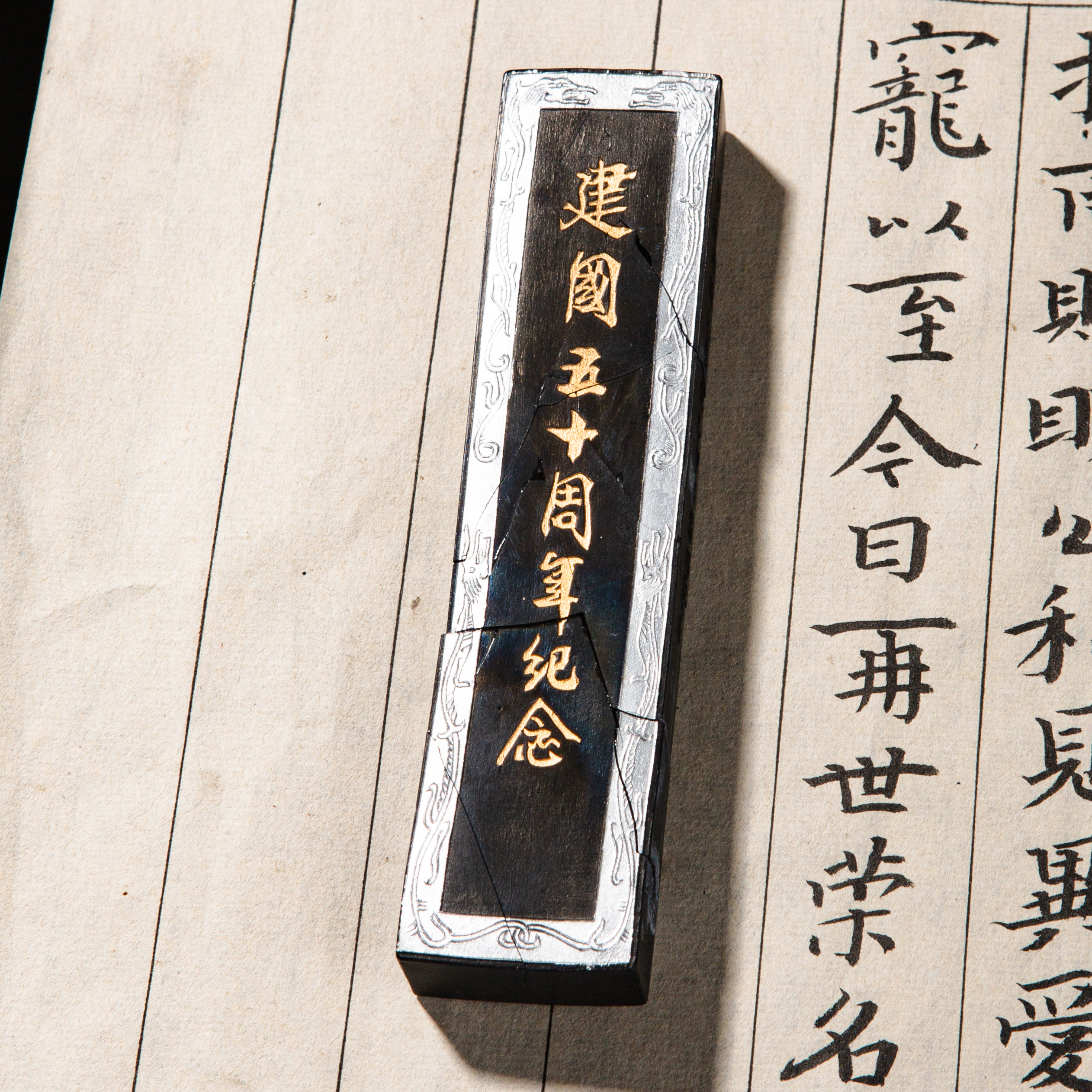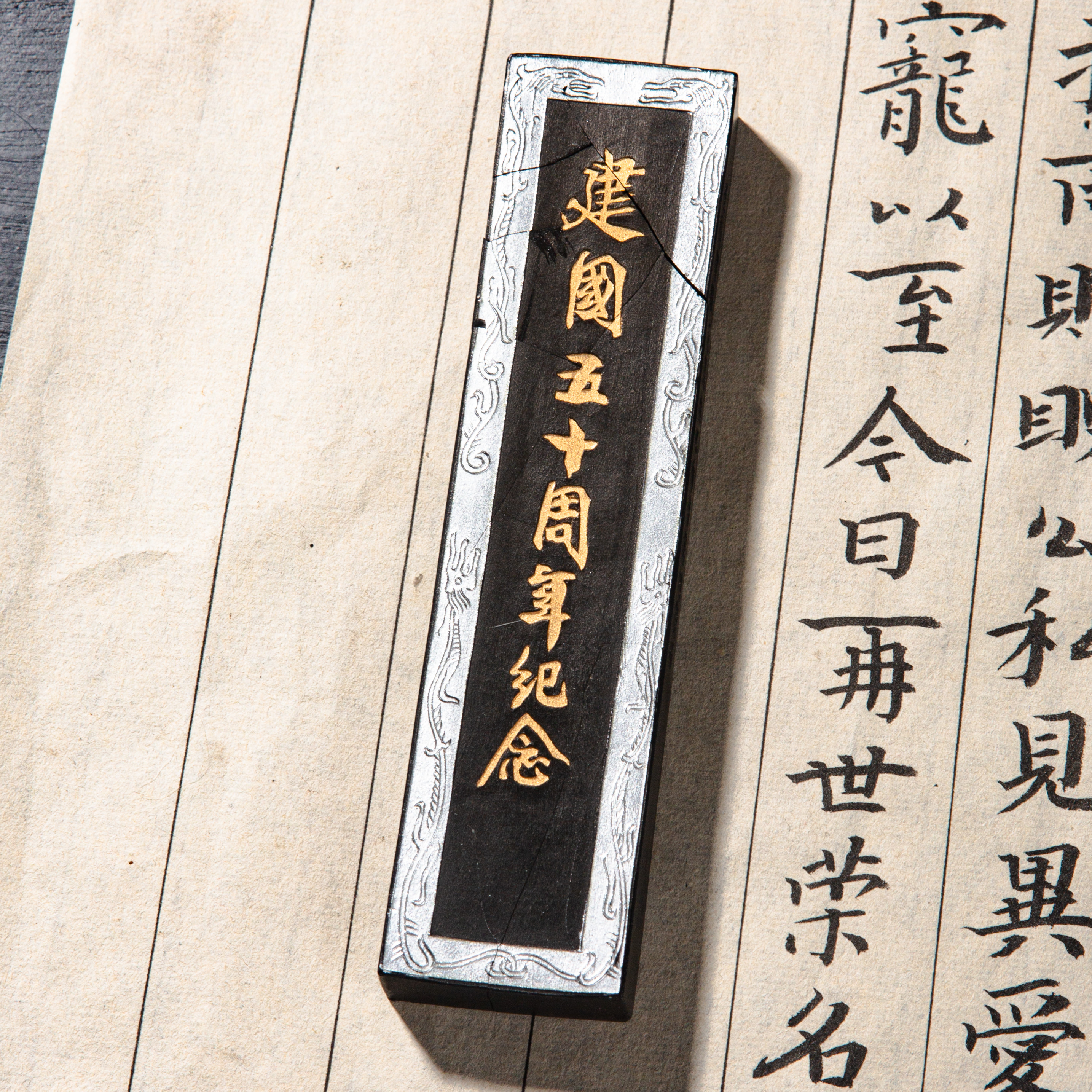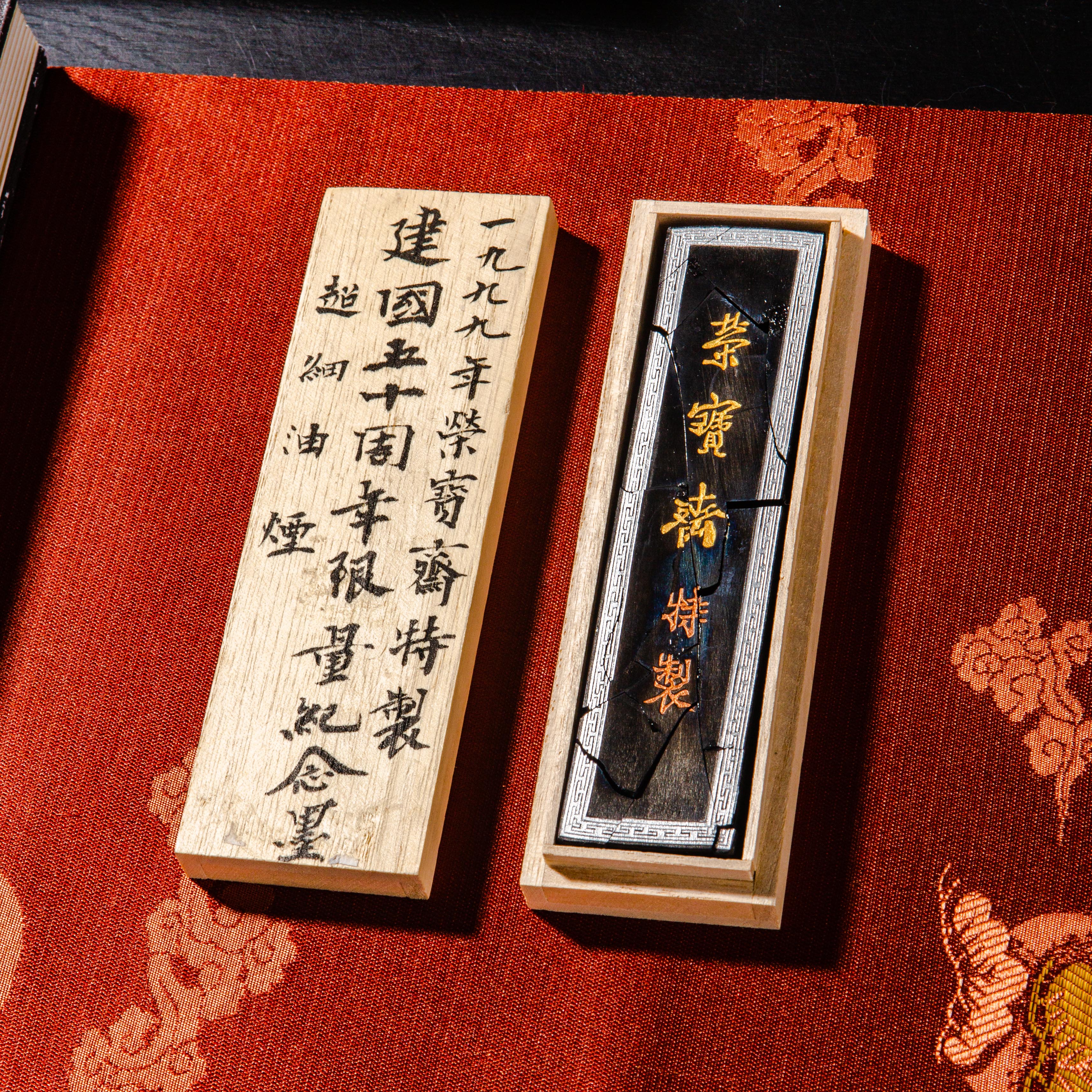 90年代荣宝斋特制建国五十周年限量纪念墨,此为断裂粘合品,不影响使用,特惠半价出售,性价比极高!此墨用料为超细油烟,材质细腻,墨色油亮,存世稀少,此版老墨市场鲜有流通,十分难得。