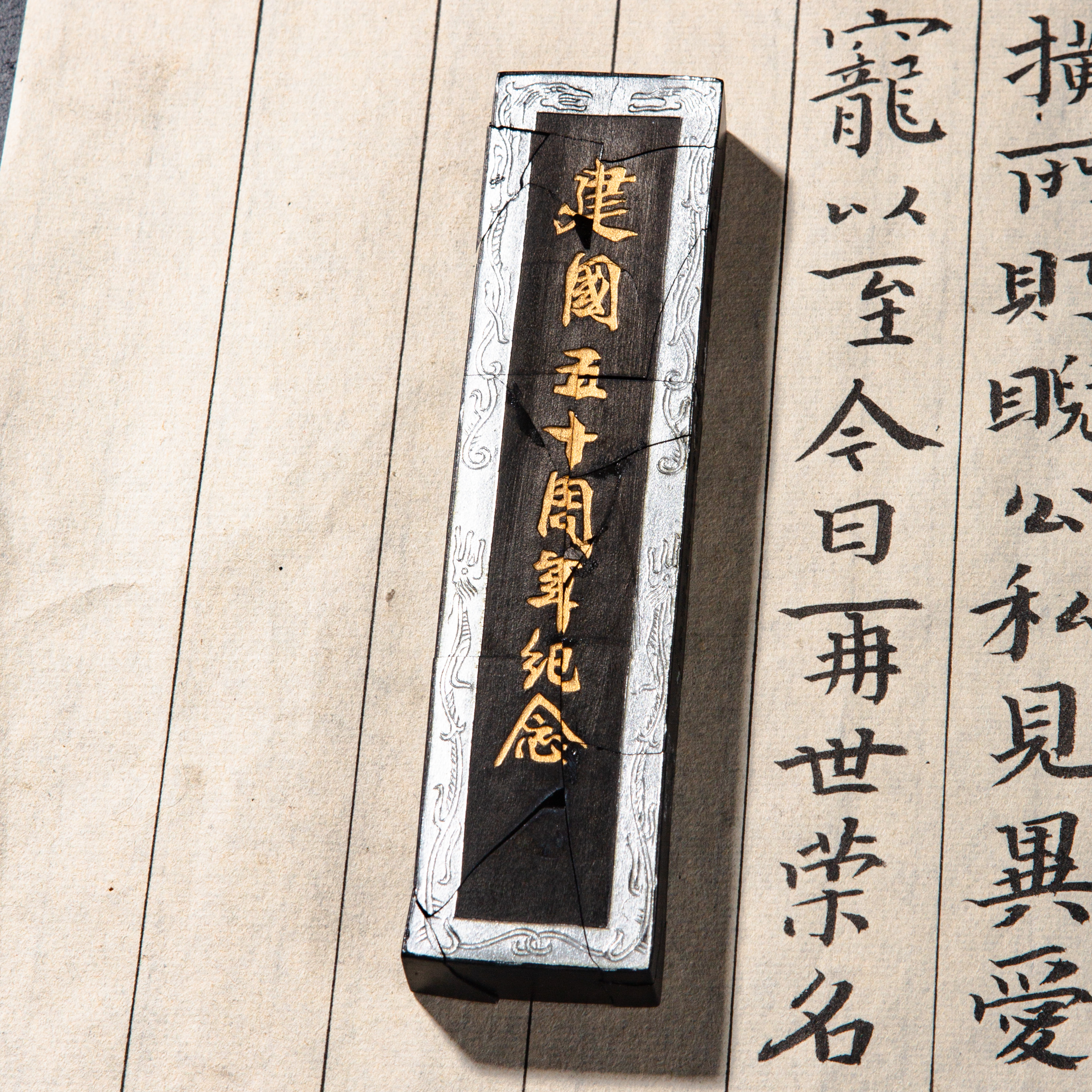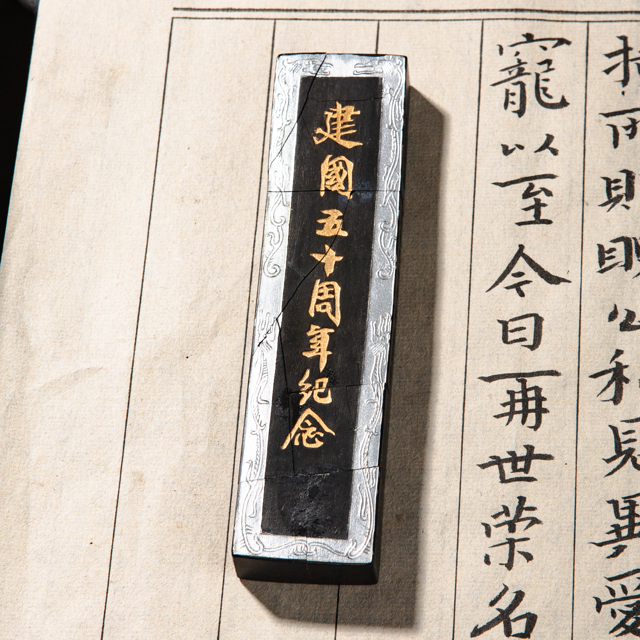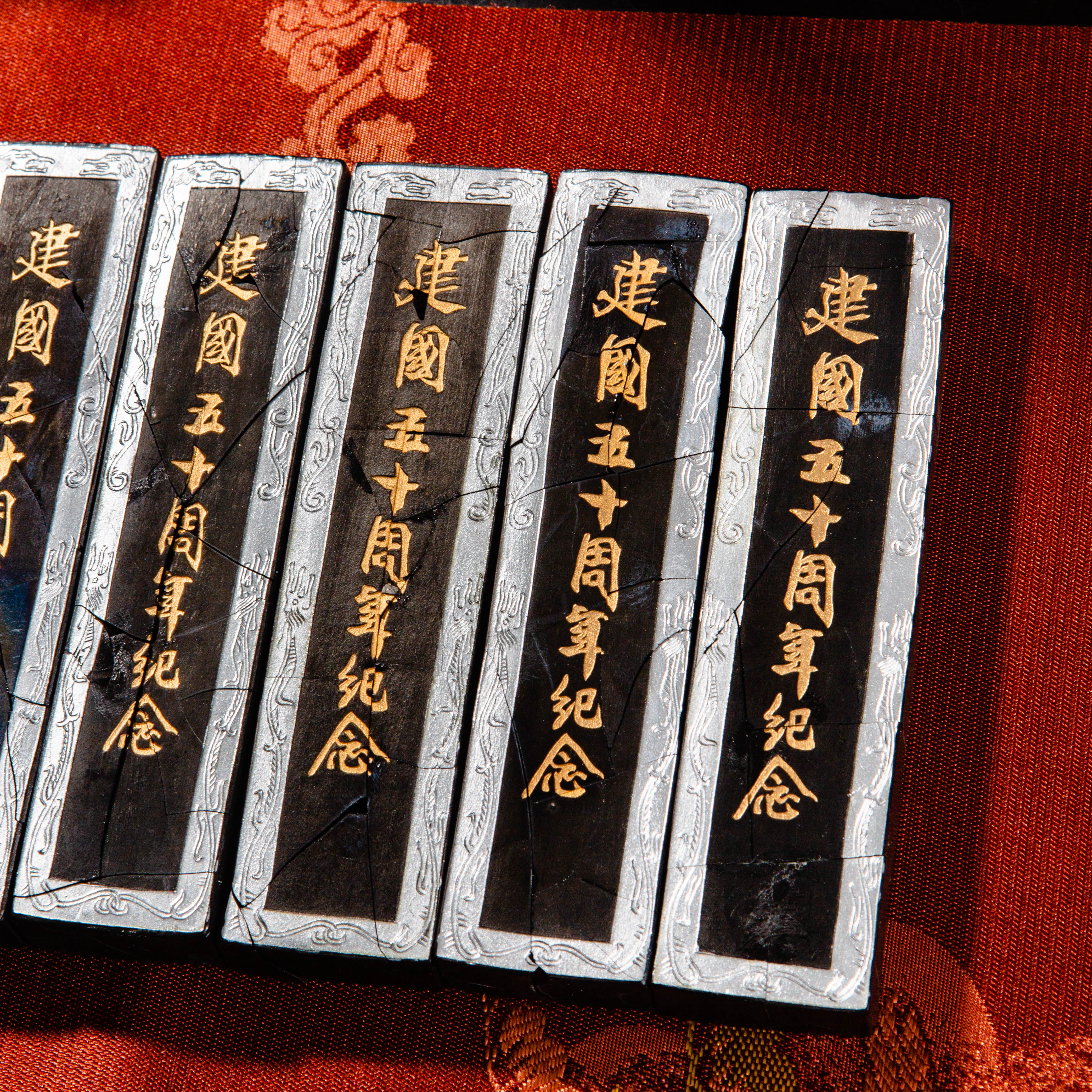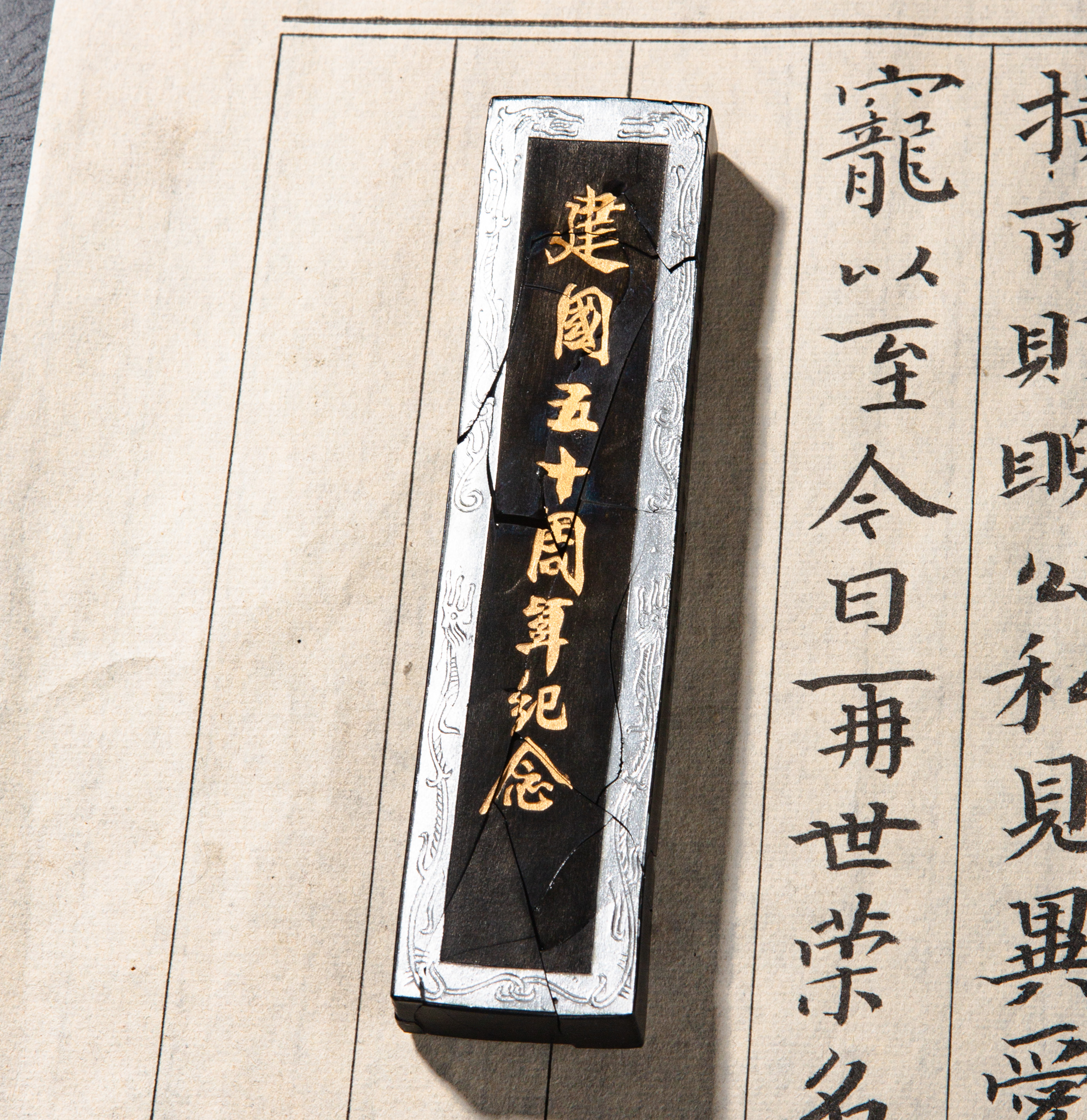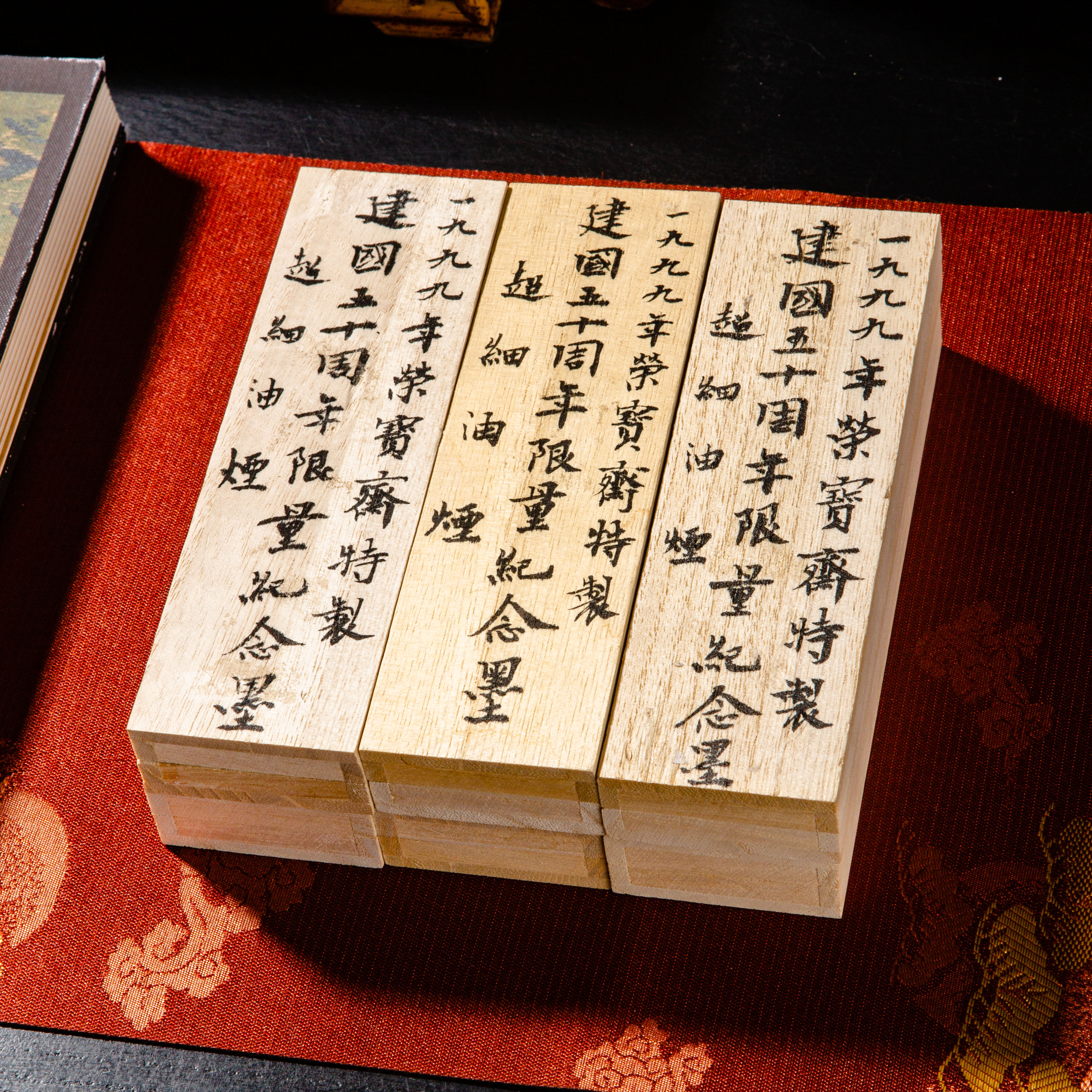 90年代荣宝斋特制建国五十周年限量纪念墨,此为断裂粘合品,不影响使用,特惠半价出售,性价比极高!此墨用料为超细油烟,材质细腻,墨色油亮,存世稀少,此版老墨市场鲜有流通,十分难得。