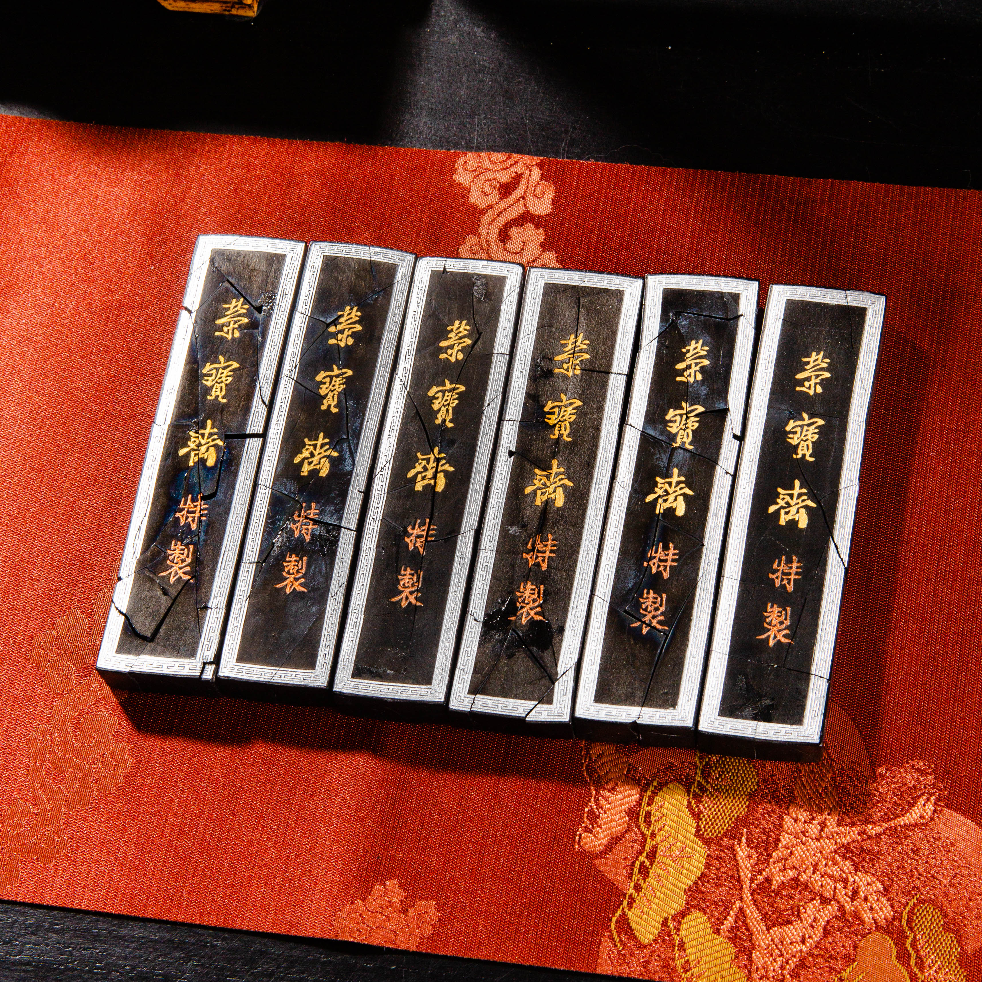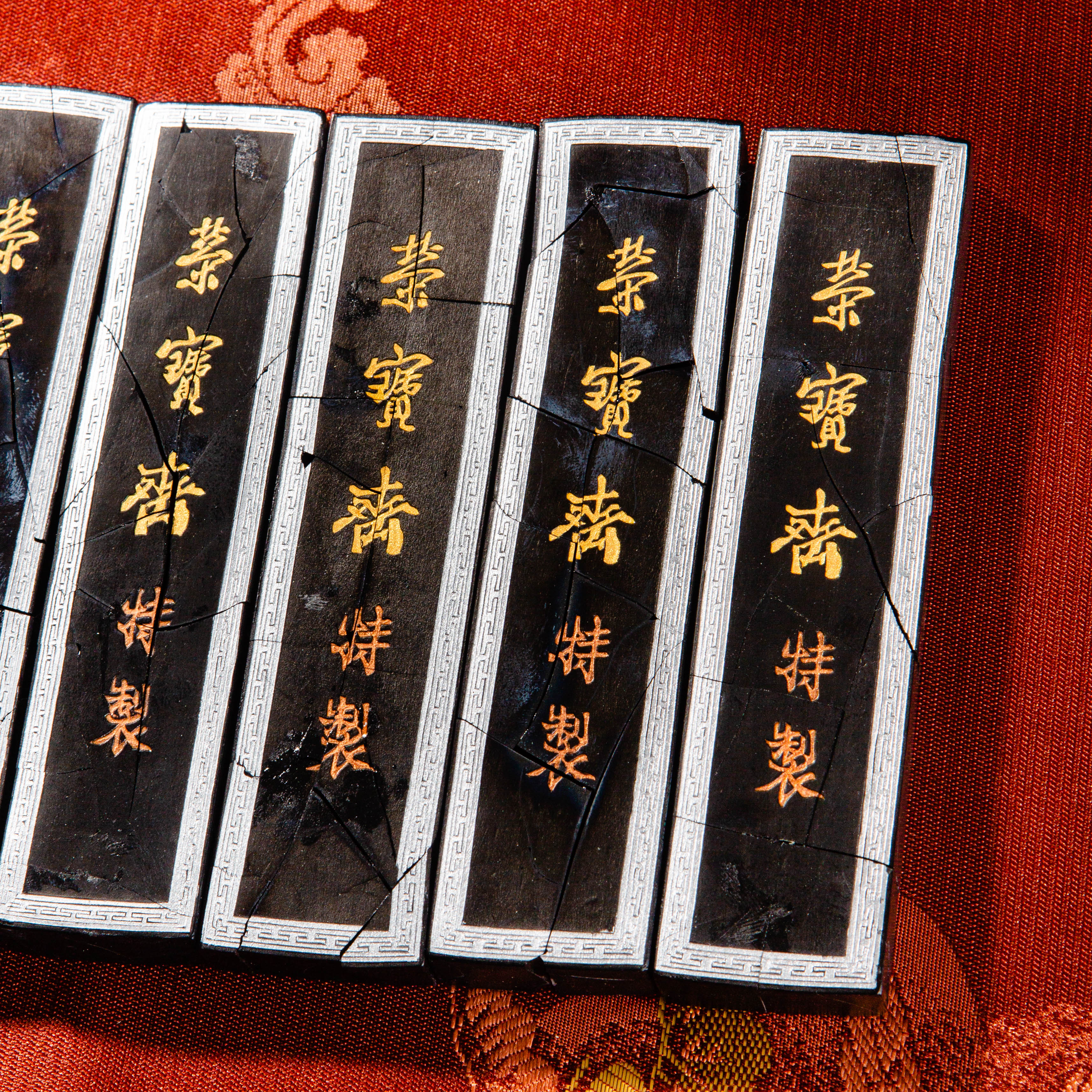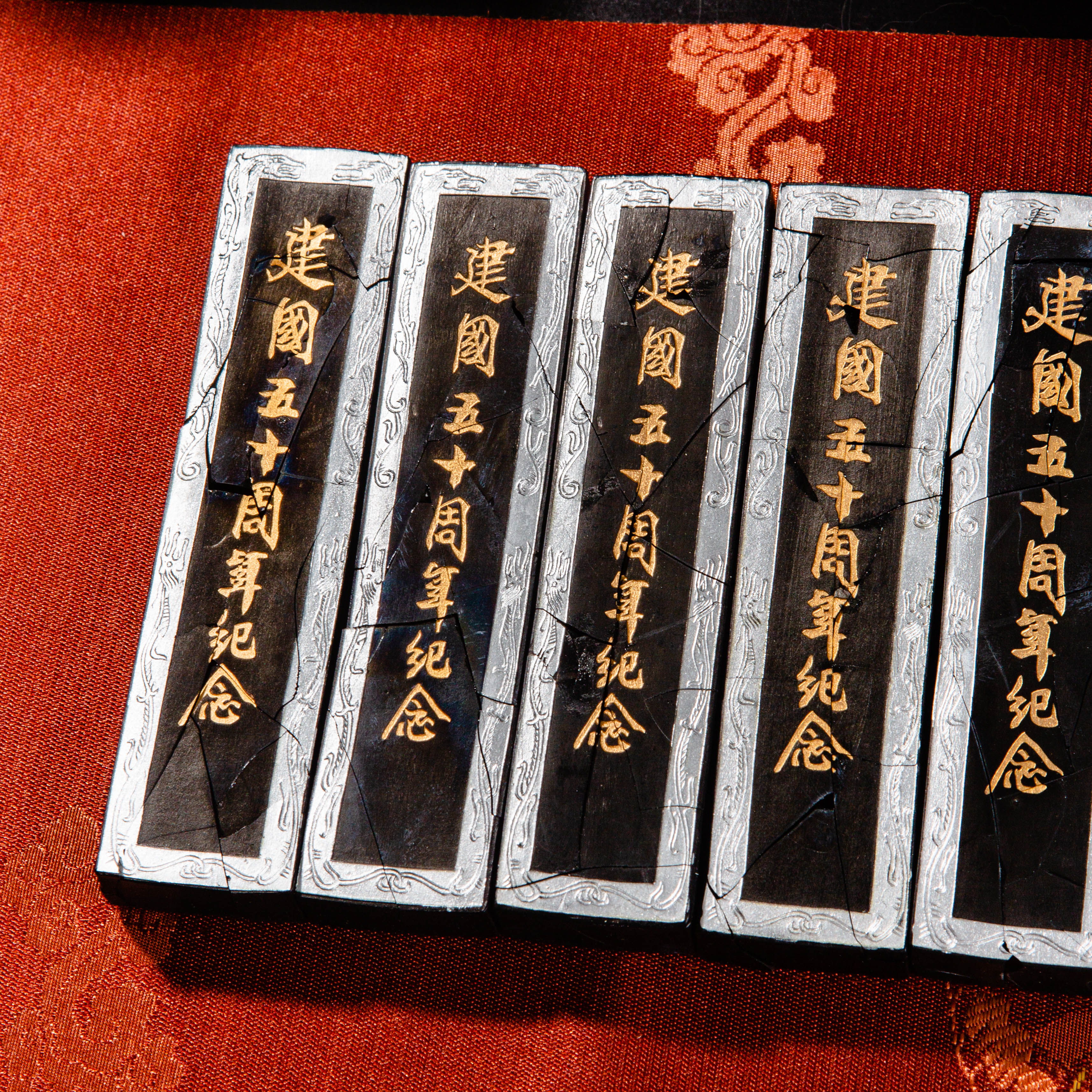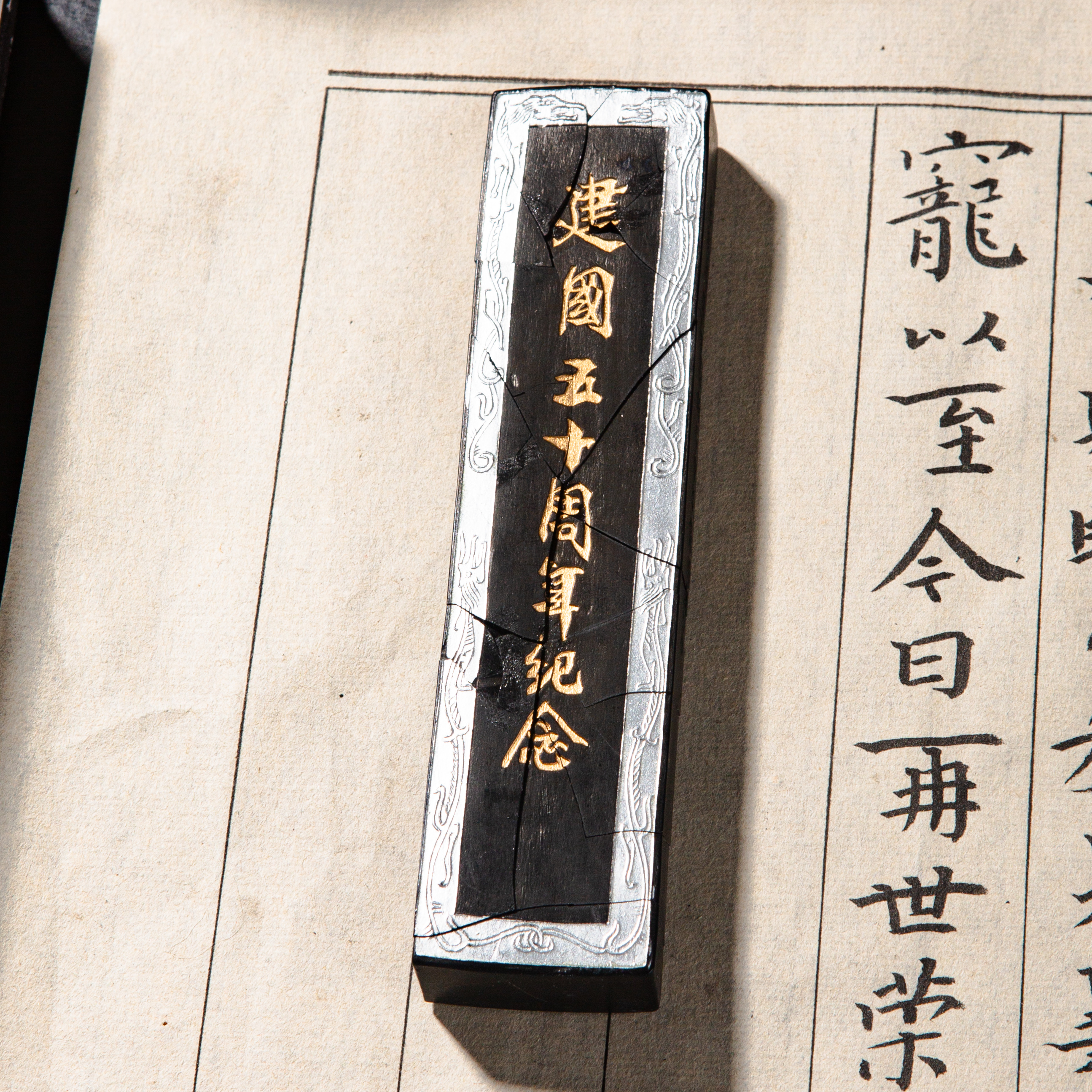 90年代荣宝斋特制建国五十周年限量纪念墨,此为断裂粘合品,不影响使用,特惠半价出售,性价比极高!此墨用料为超细油烟,材质细腻,墨色油亮,存世稀少,此版老墨市场鲜有流通,十分难得。