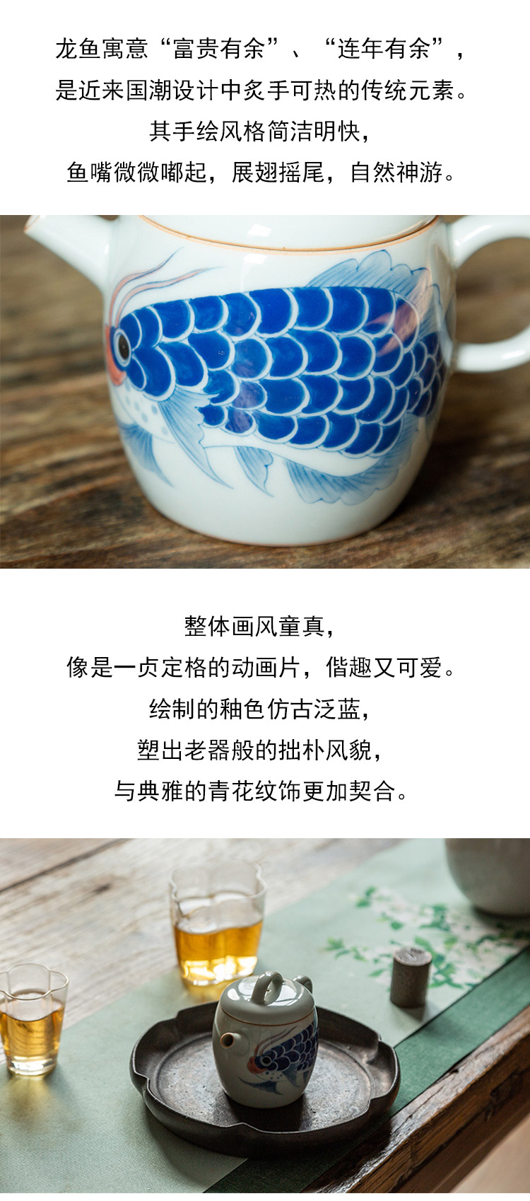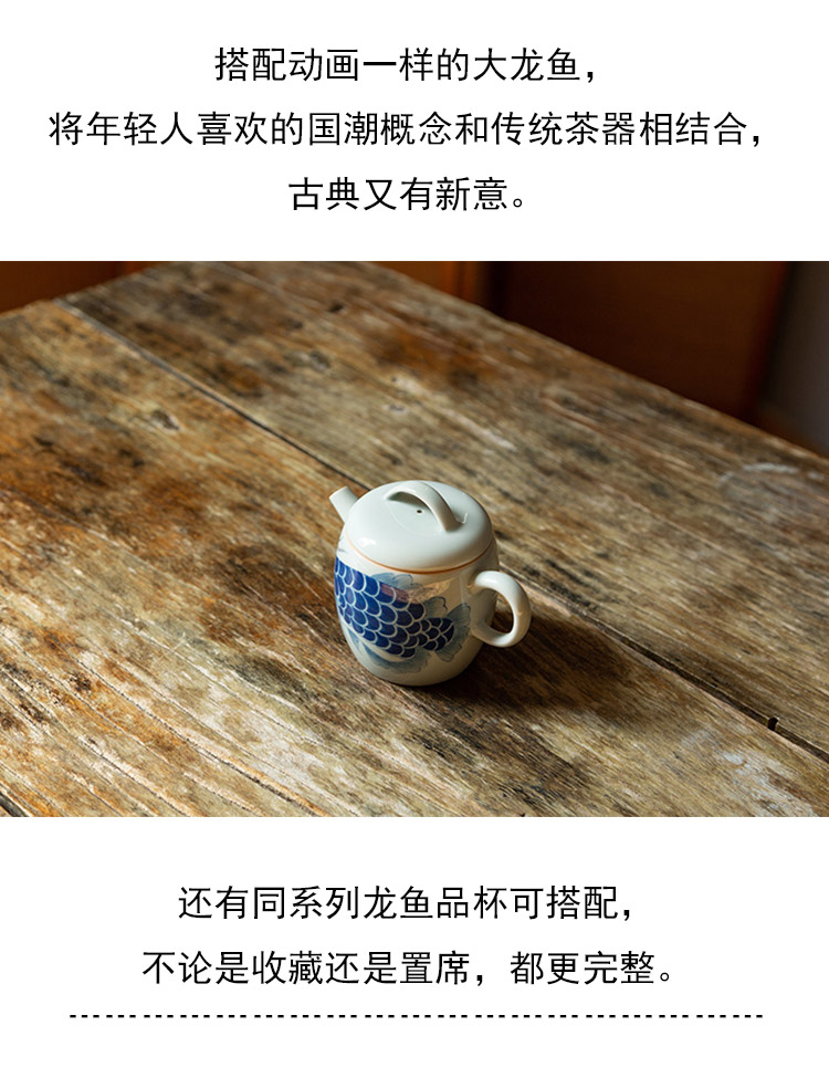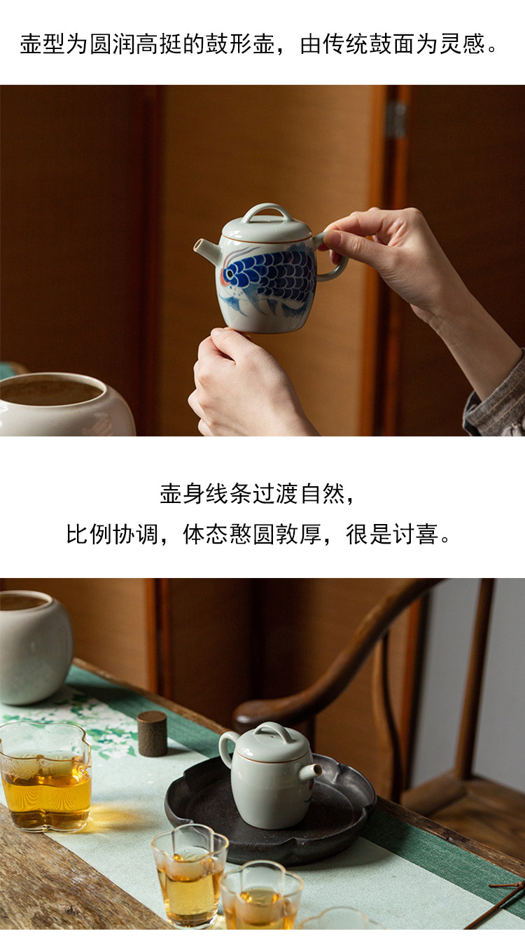 茶香记 手绘龙鱼得宜鼓型壶瓷壶160ml国潮手绘泡茶壶青花功夫茶具