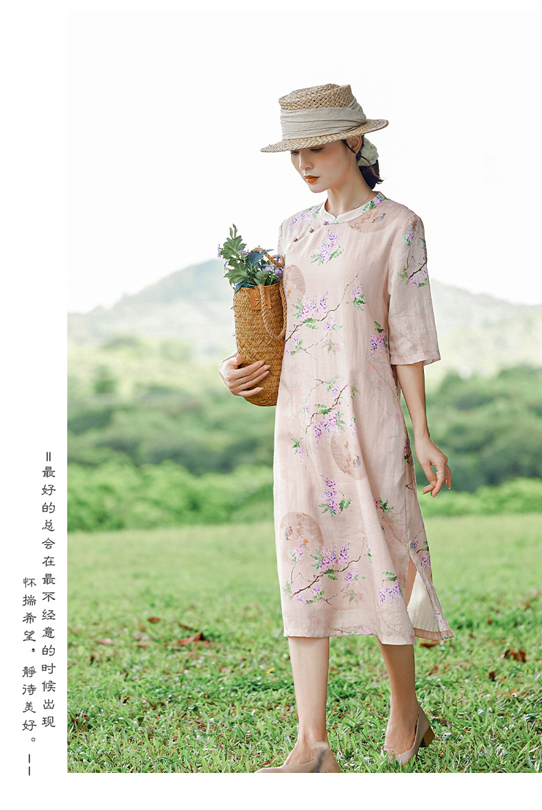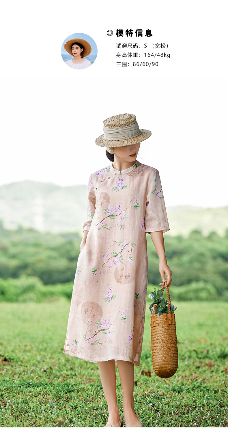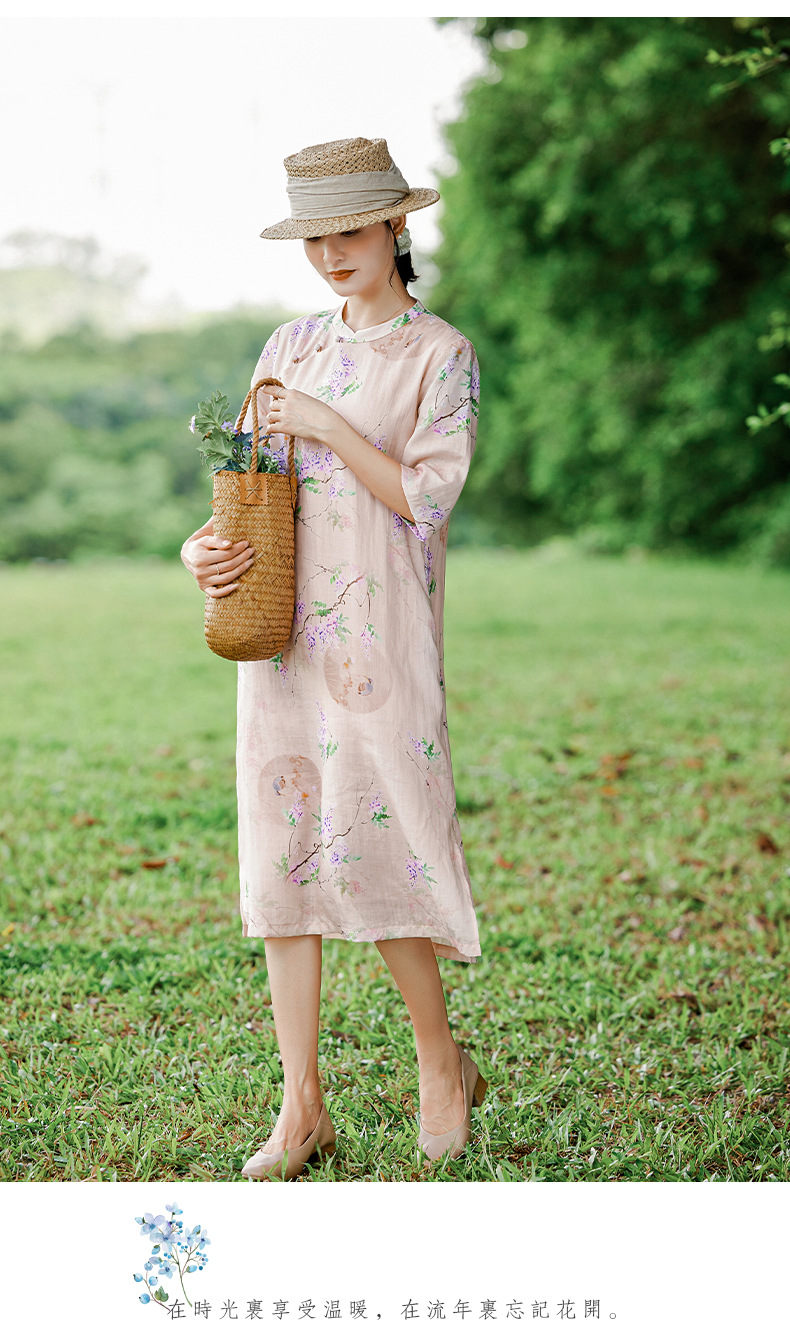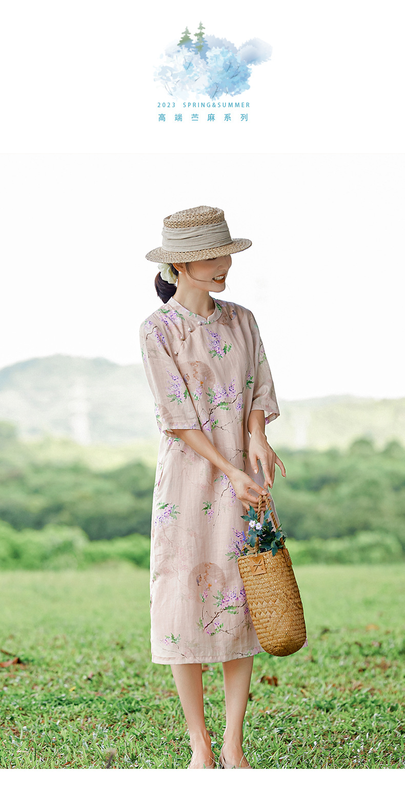 HM-S402新款苎麻印花改良旗袍裙国风文艺立领中袖复古连衣裙夏末初秋