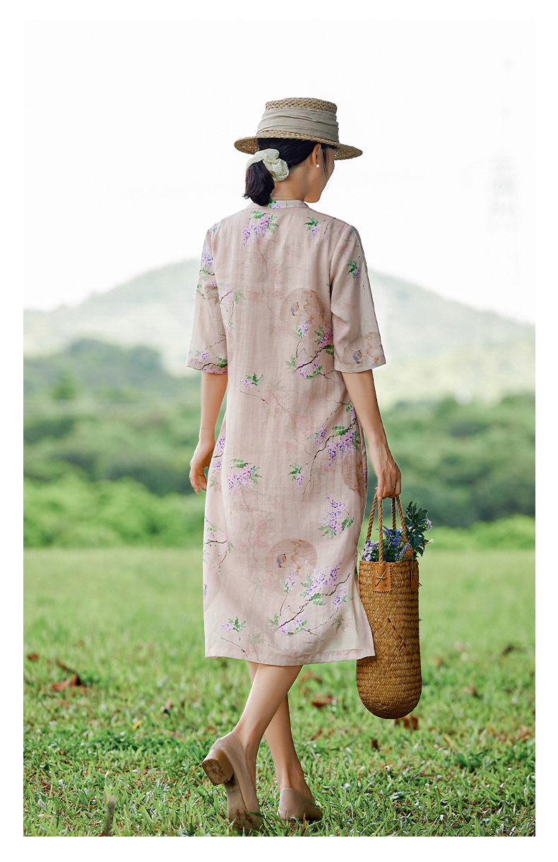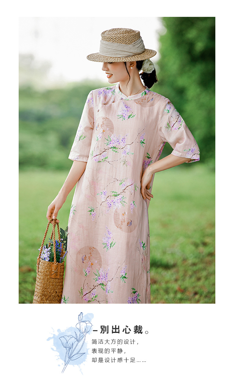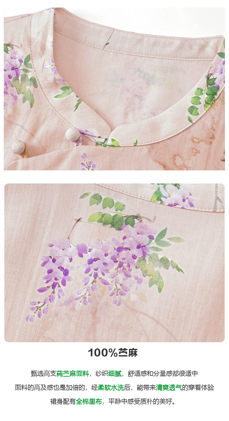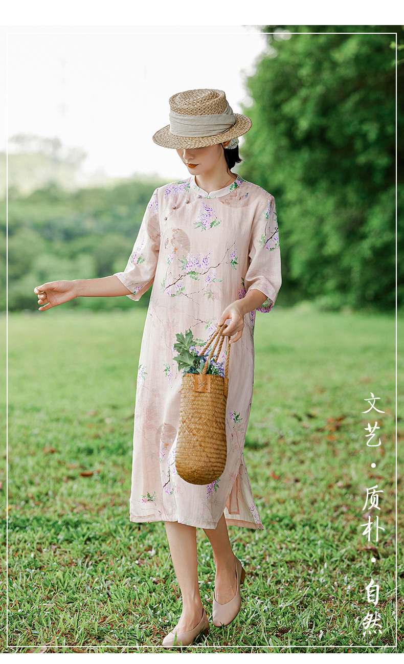 HM-S402新款苎麻印花改良旗袍裙国风文艺立领中袖复古连衣裙夏末初秋