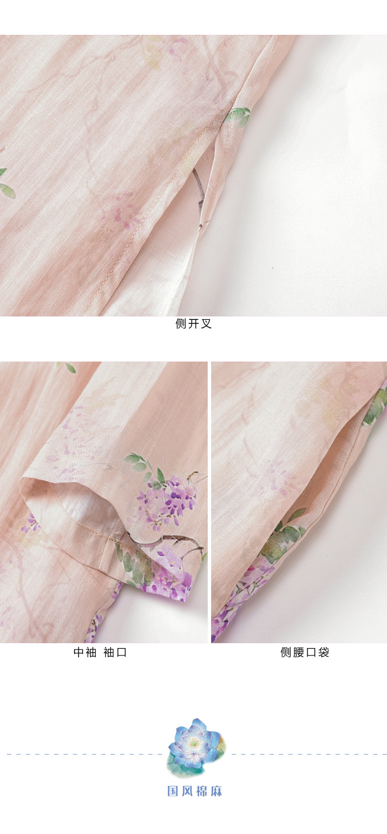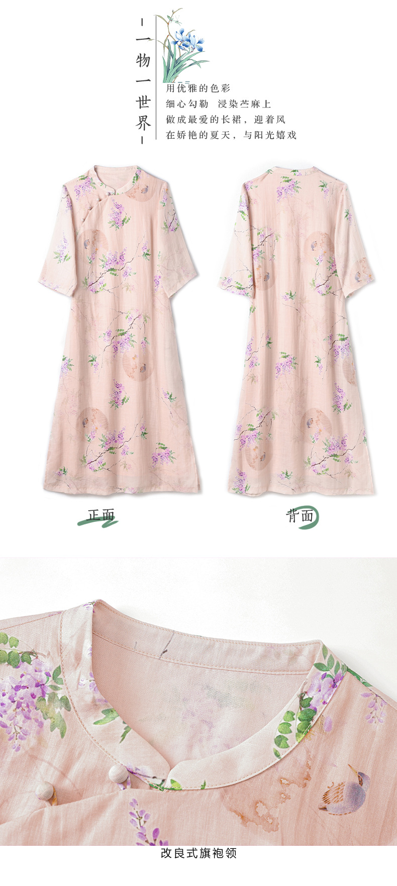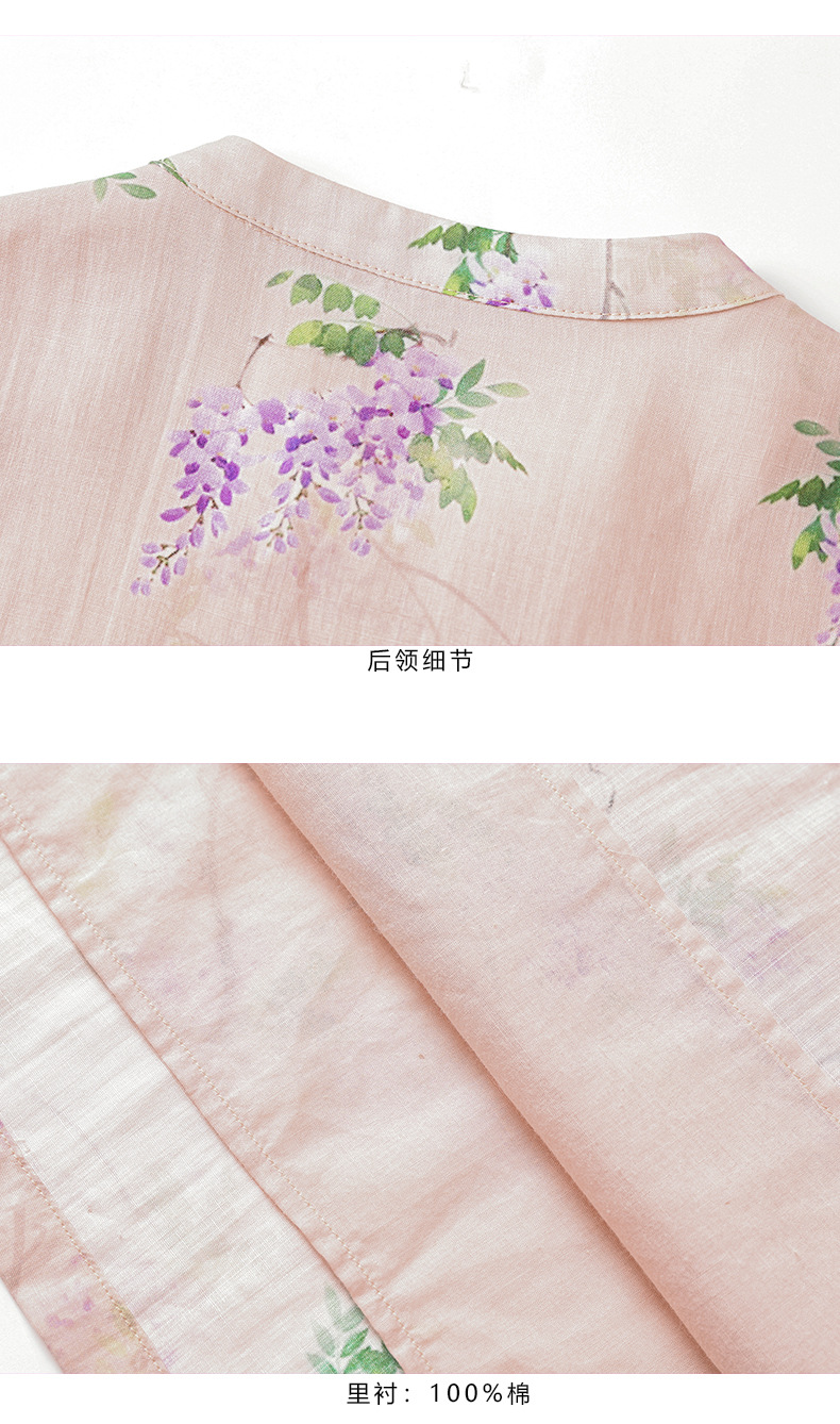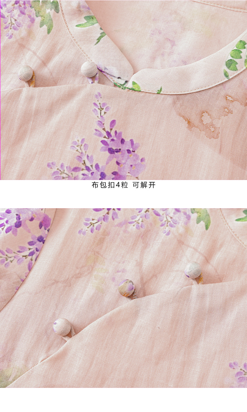 HM-S402新款苎麻印花改良旗袍裙国风文艺立领中袖复古连衣裙夏末初秋