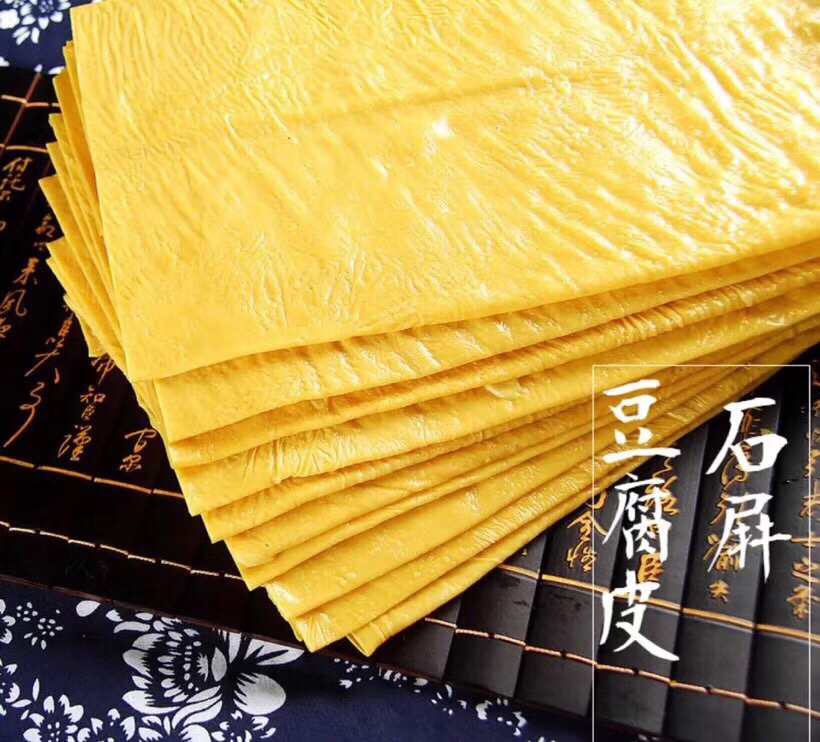大豆→筛选→淘洗→浸泡→磨浆→煮浆→滤浆→揭皮→晾晒→成型→干燥→包装。