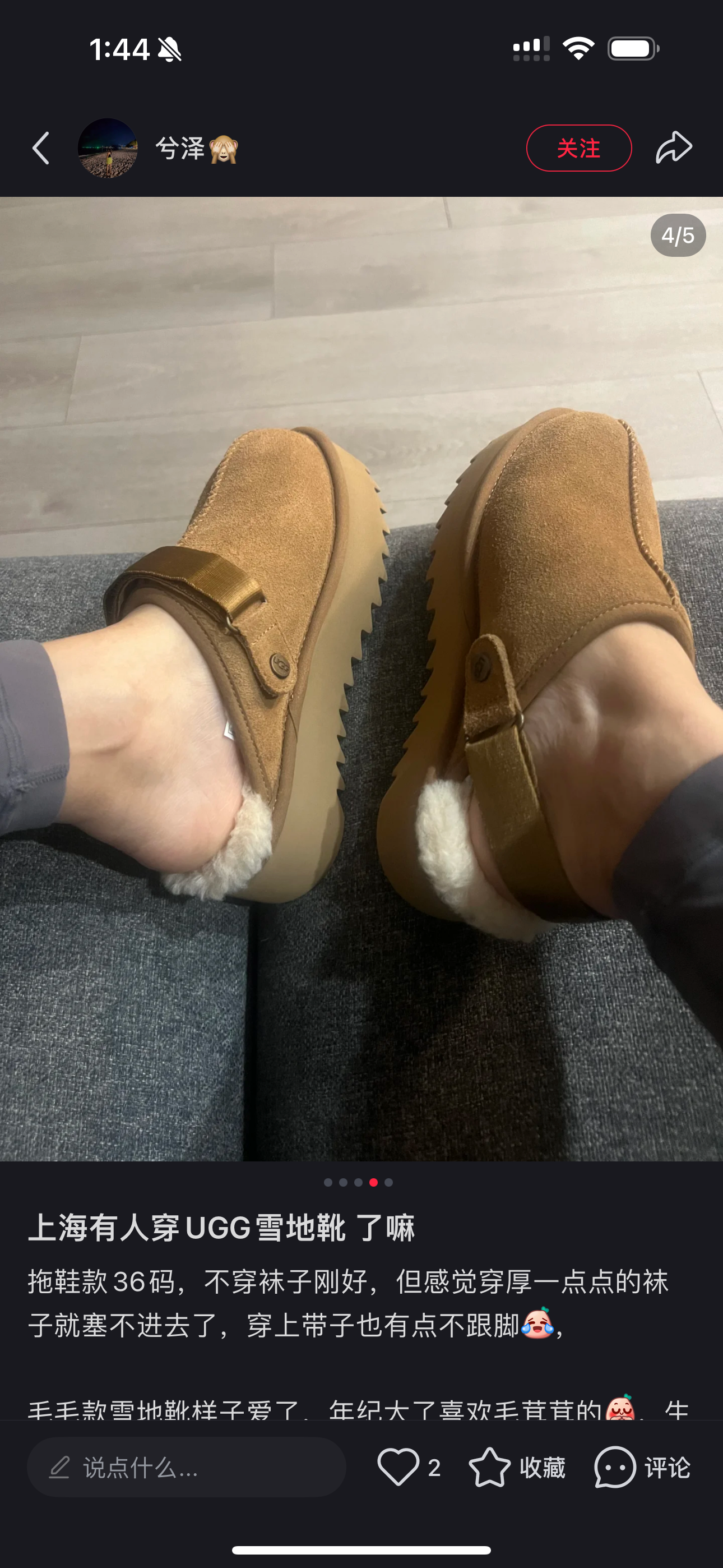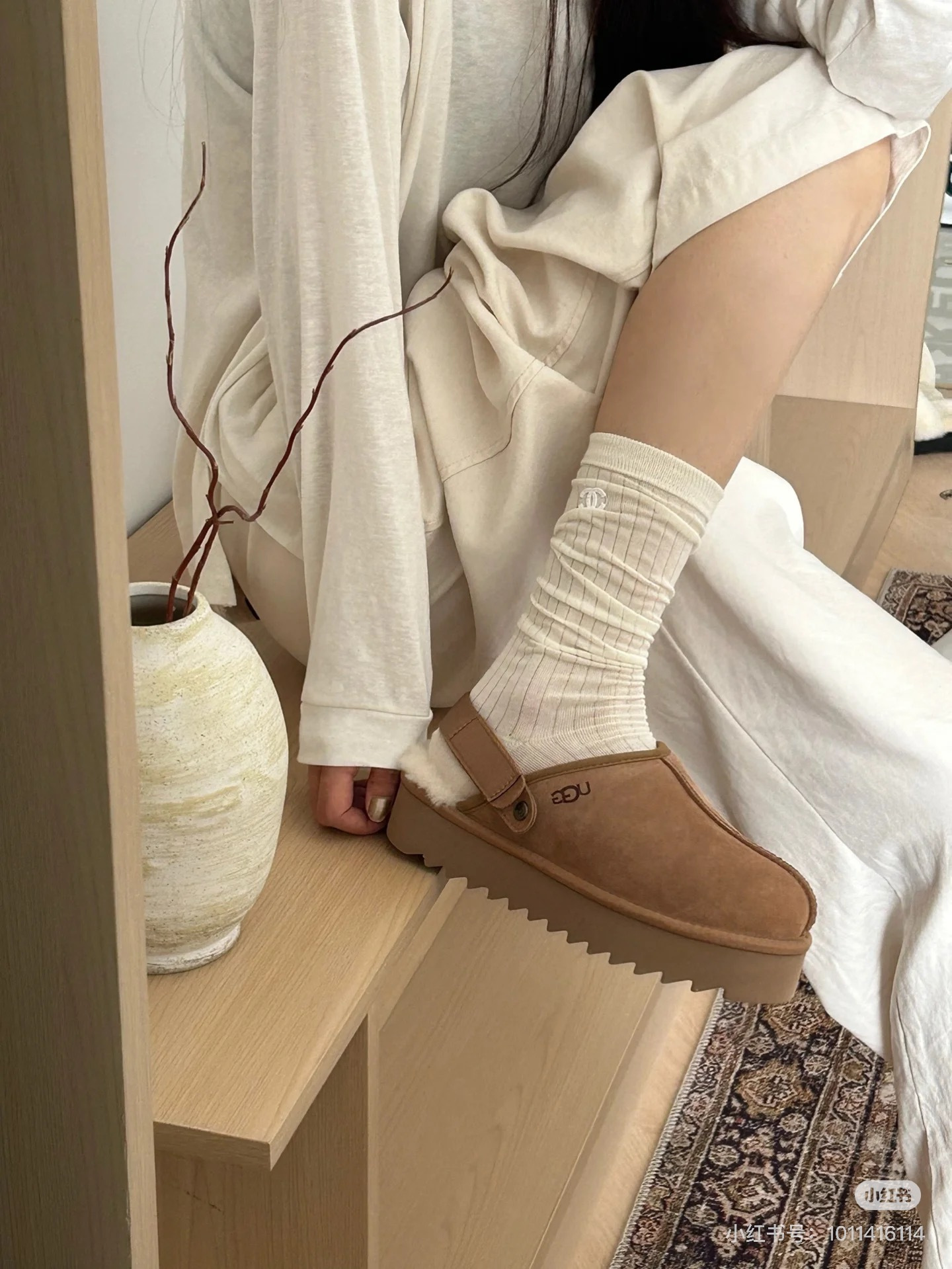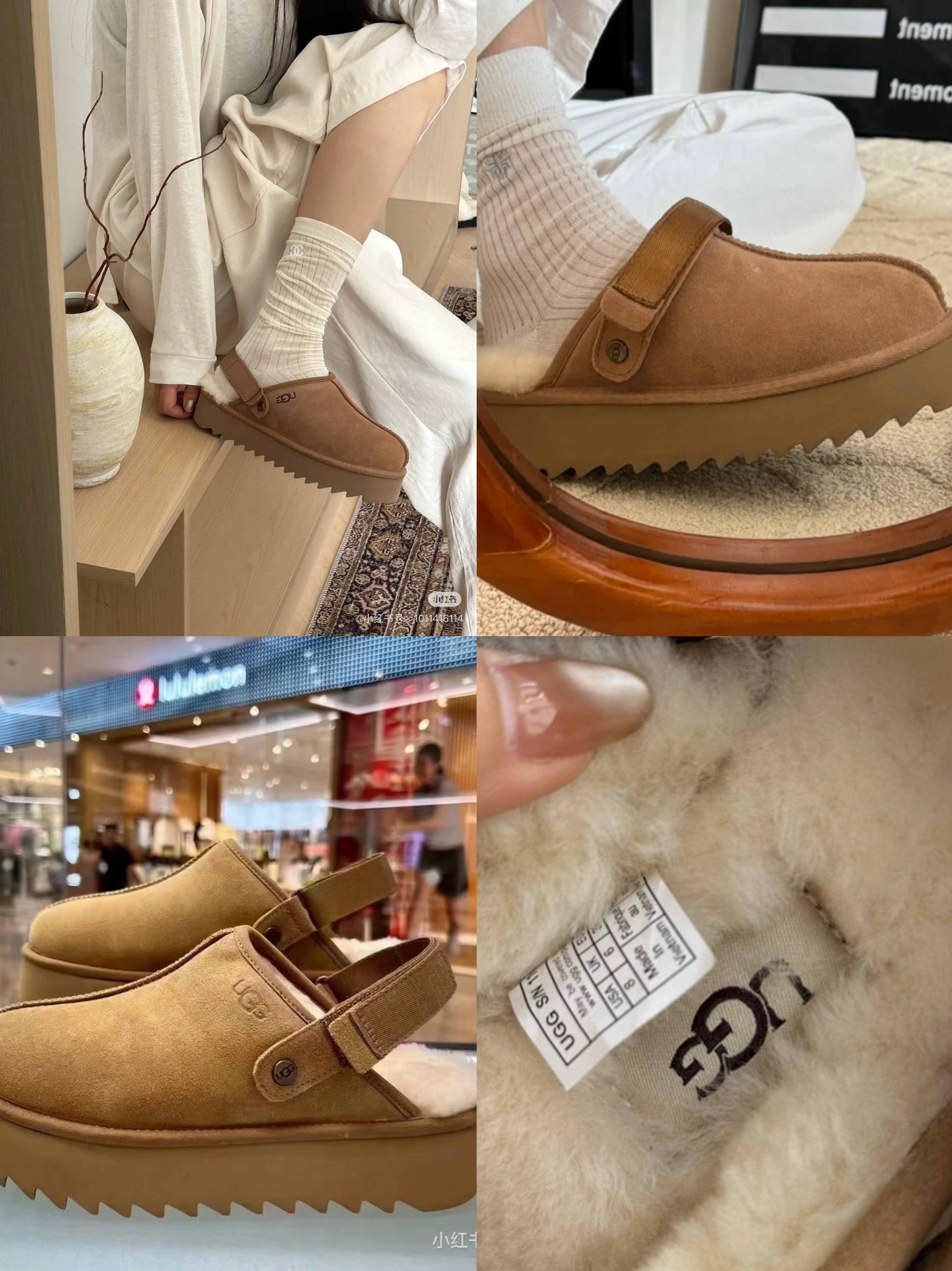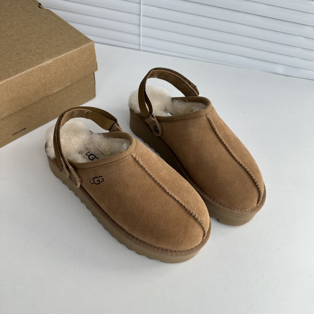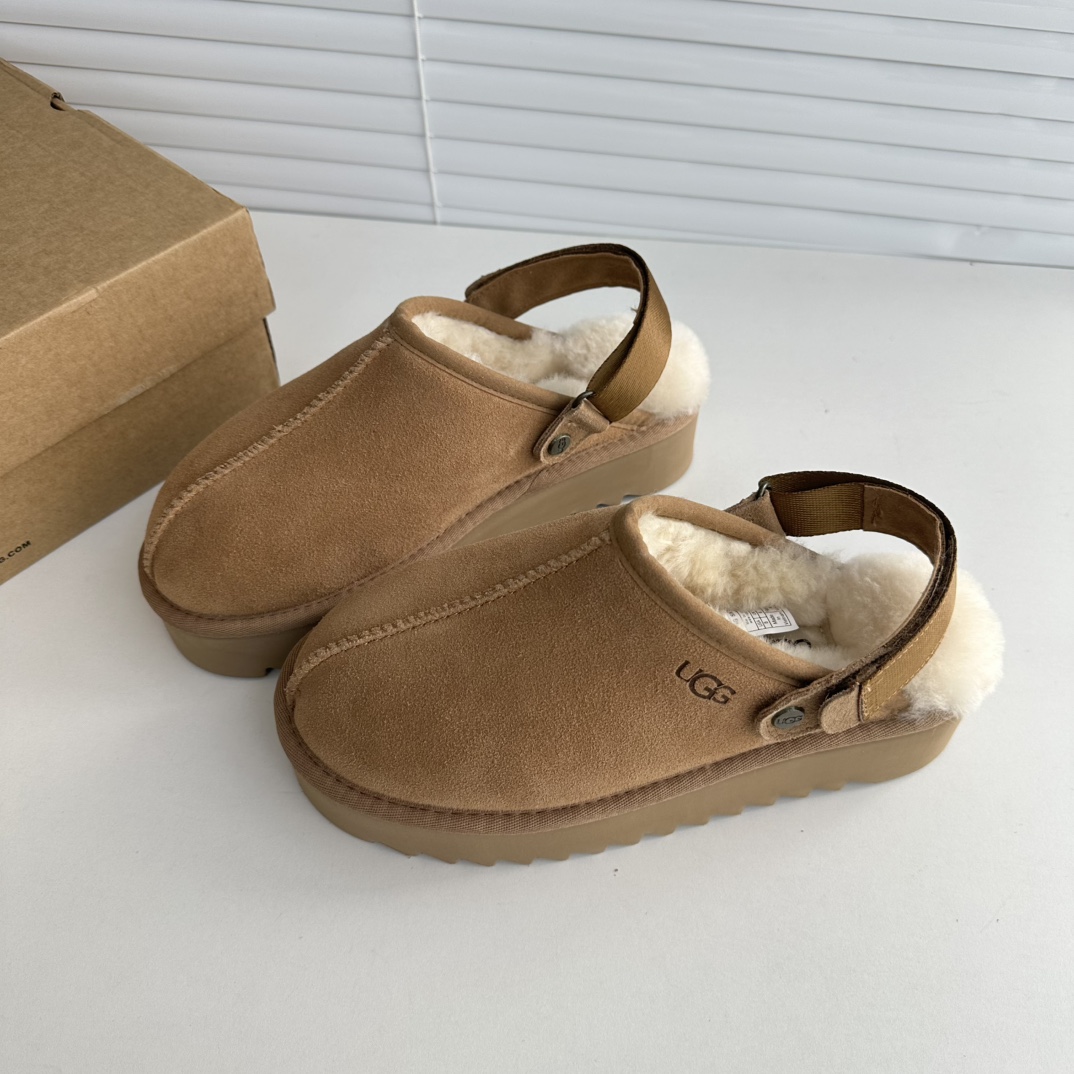 鞋底用料高密度弹力eva,这种鞋底的好处在就在于上脚柔软且不容易凹陷,UG*G的好穿是出了名的,舒适度真的不用在重复提起!!澳洲皮毛一体,纯羊毛🦙毛长足够长和均匀,保暖效果特别棒!