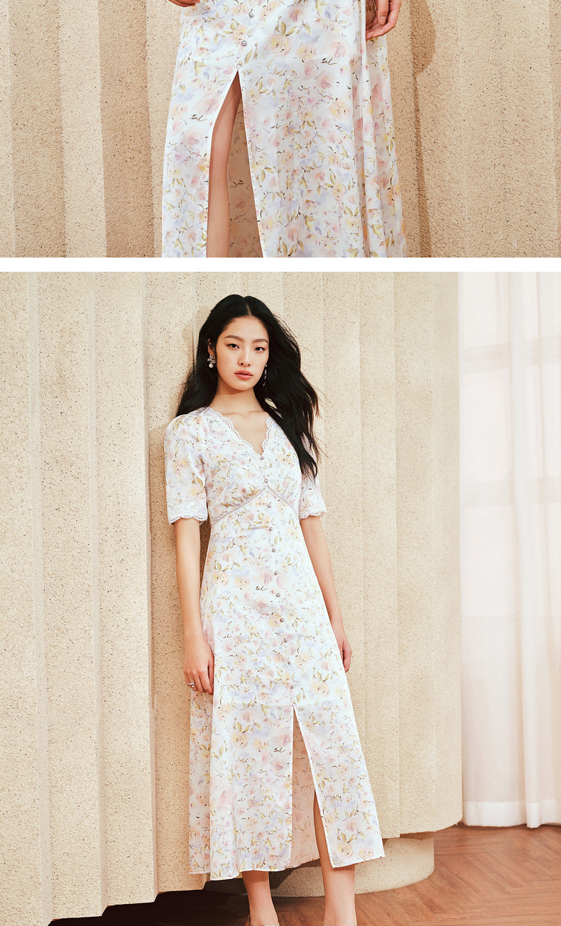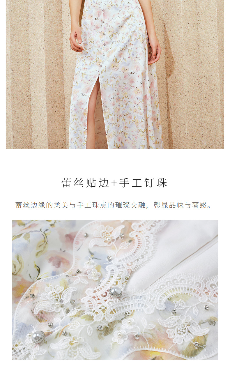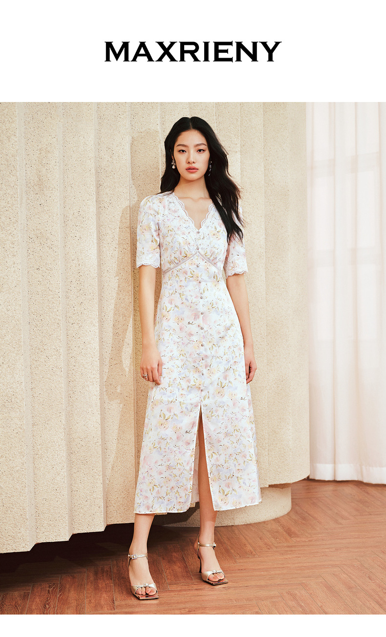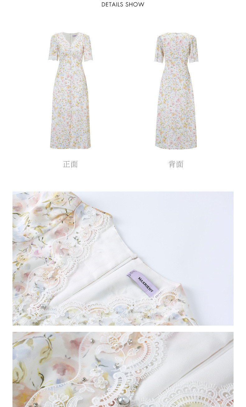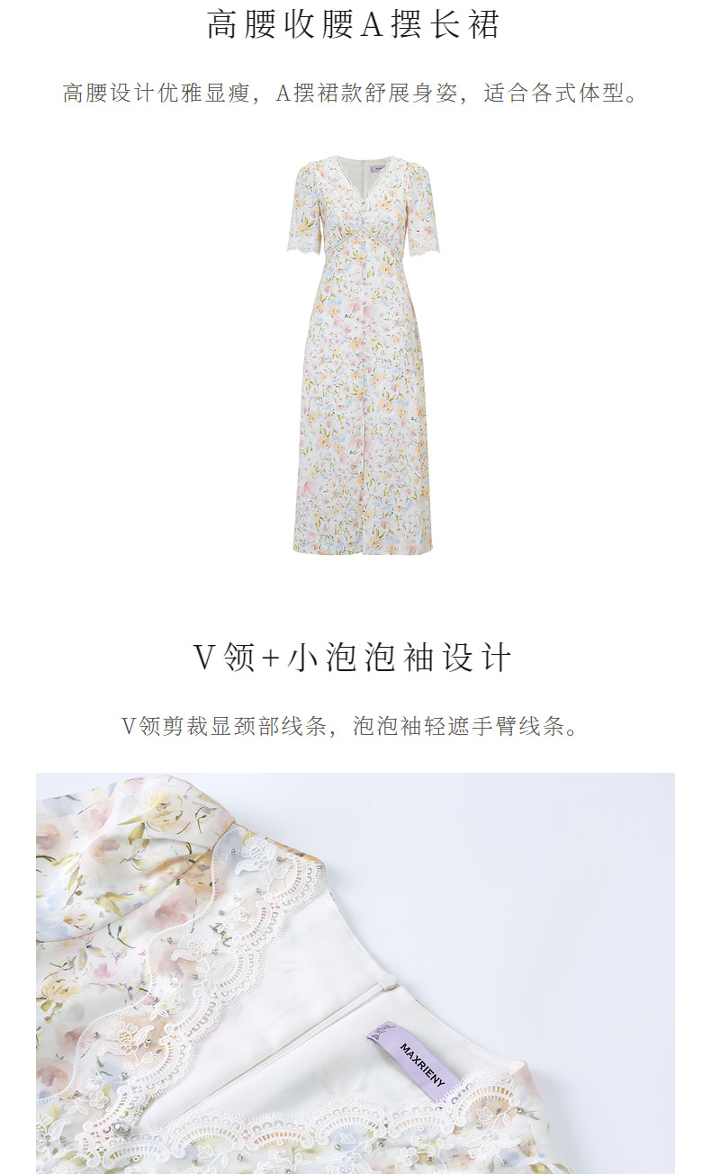 MAXRIENY浪漫复古氛围感蕾丝钉珠连衣裙2024夏季新款V领开叉长裙(货号:MS85DR029)