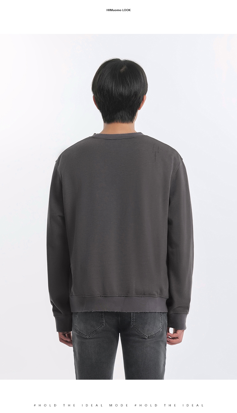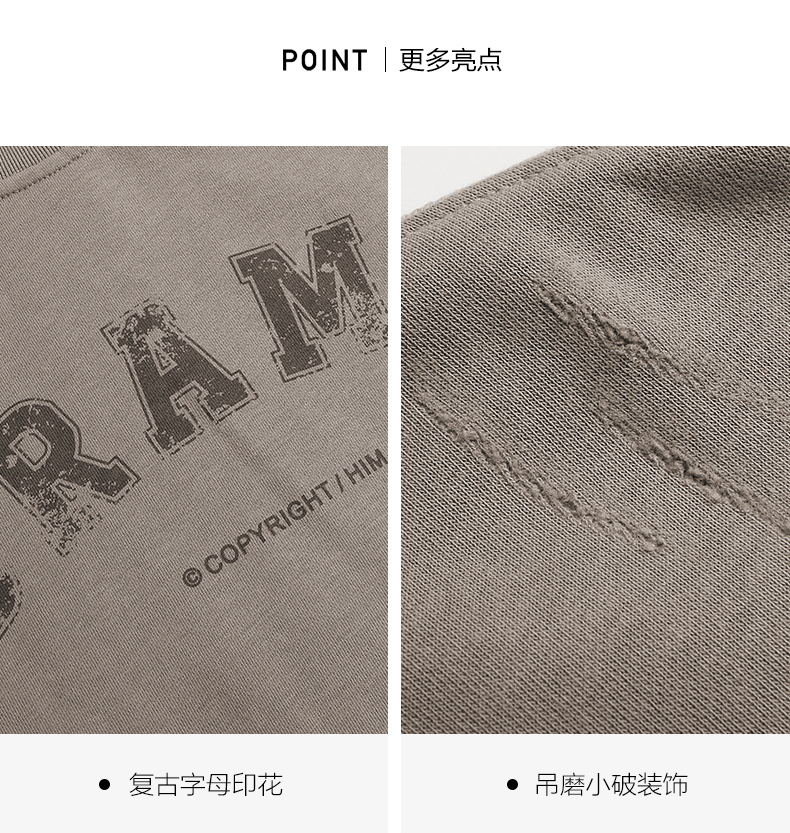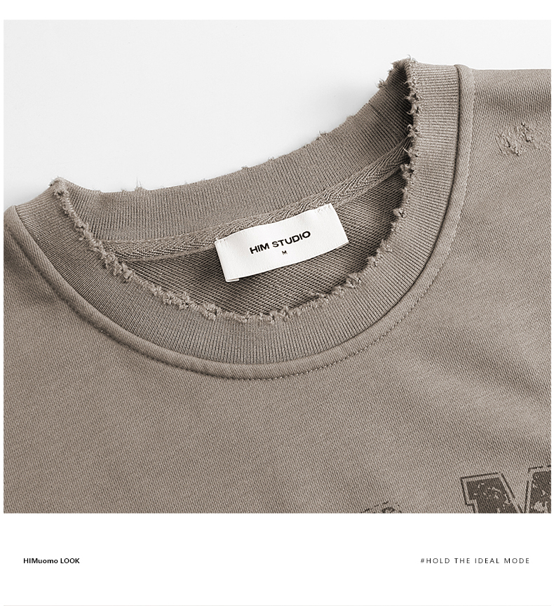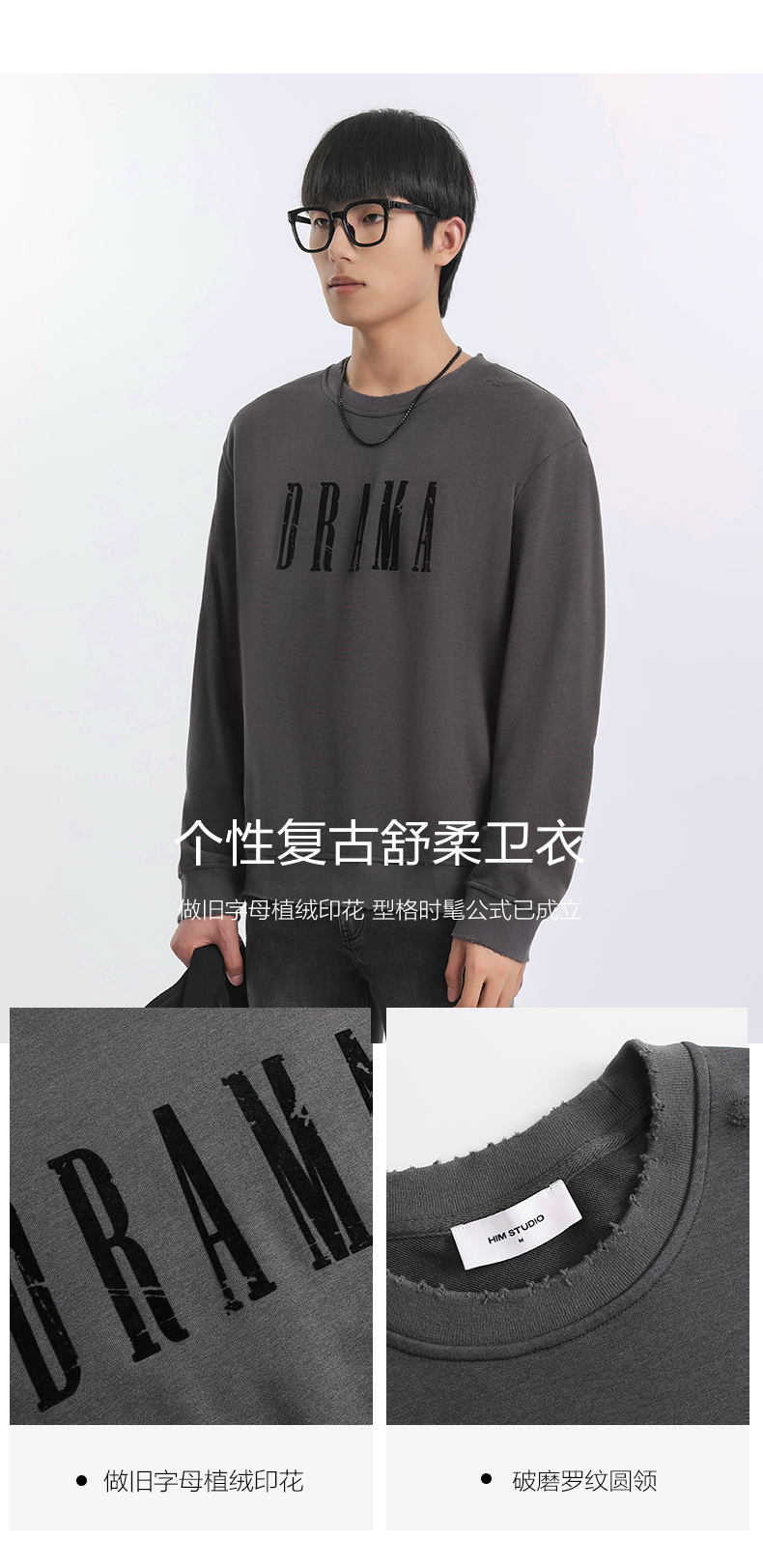 HIM漢崇 复古洗烂破损植绒印花休闲长袖圆领套头卫衣 2025秋季