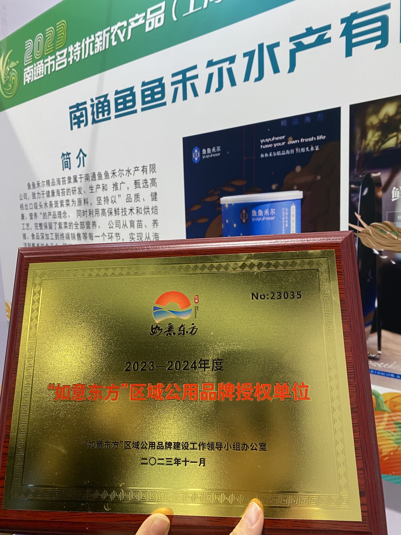 鱼鱼禾尔于2023年被如东县评选为 “如意东方”区域公用品牌产品。