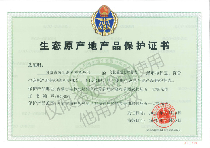 燕麦种植基地获得生态原产地产品保护证书