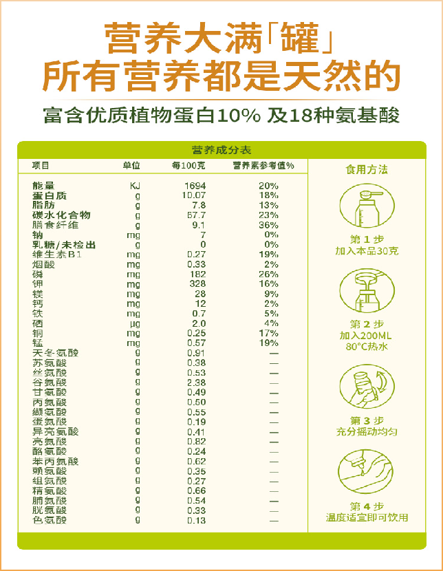 在没有添加糖的基础上,通过C4技术实现了把燕麦胚芽胚乳基底本身的甜味释放出来。天然植物奶粉口感微甜、细腻丝滑、不粘腻、不齁嗓子,是天然燕麦自带的甜味儿,清香微甜没负担,每一口都是大自然的味道。