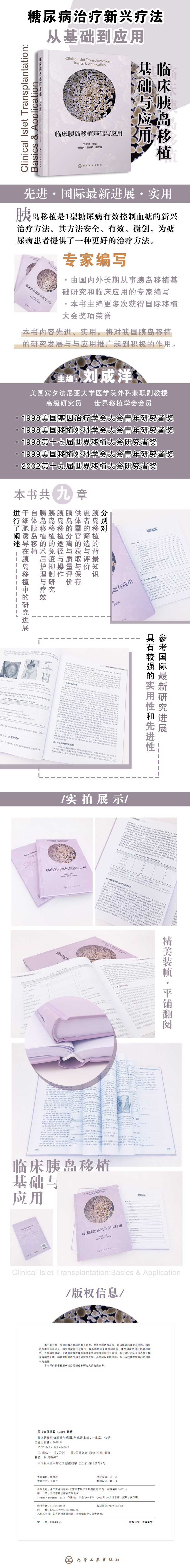 刘成洋医生带领的团队通过查阅大量的文献和胰岛移植相关书籍,并结合自己多年临床胰岛分离和移植工作的宝贵经验,编著了《临床胰岛移植基础和应用》。我很高兴多年来与他一起共事。该书详述了胰岛移植临床应用的历史和现状,总结了国际上临床胰岛移植在研究和应用方面的经验和教训,对同种异体胰岛移植的每一个细节都提供了详细阐述,比如患者的选择、供体器官筛选与获取方法、胰岛分离、移植途径、免疫抑制药物、术后监督与管理以及自体胰岛移植的临床应用。该书包含了胰岛移植领域的一些最新进展,尤其是美国临床胰岛移植联盟(CIT)的一些数据和方案。