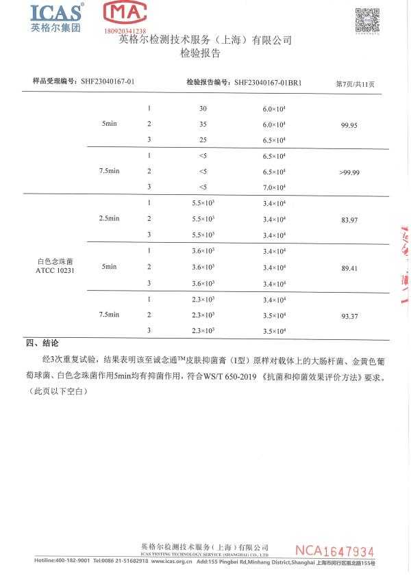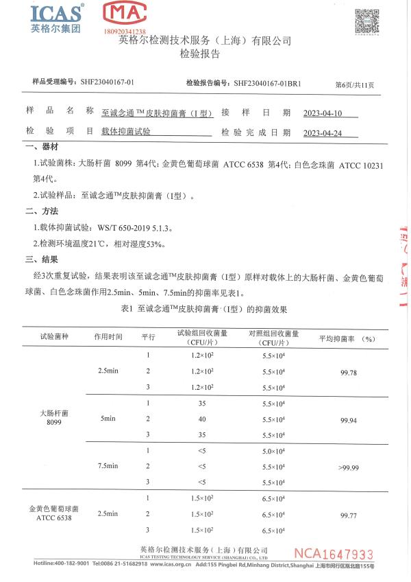 皮肤膏做了抑菌性测试,刚开始做的时候,我们也拿不准没有任何西药抑菌成分是否可以通过测试,毕竟中医治疗皮肤病和单纯抑菌是不一样的。结果出来后,我们也很惊喜,对大肠杆菌和金黄色葡萄球菌对抑菌率均在99%以上,对白色念珠菌涂抹7.5min后,可达到93.37%。