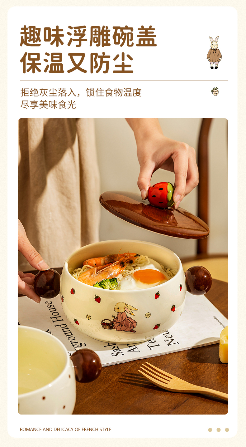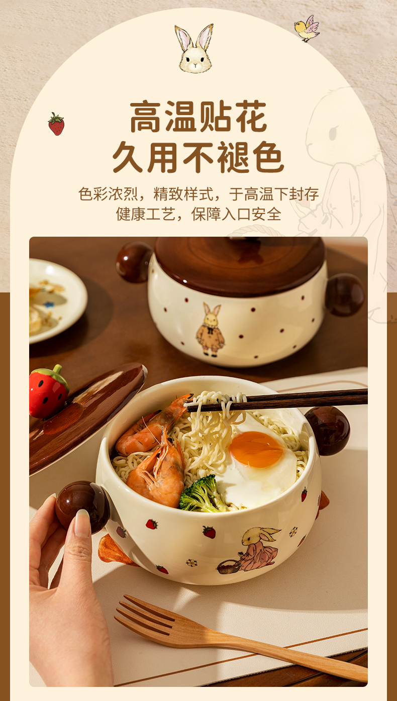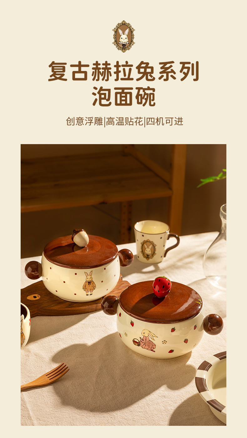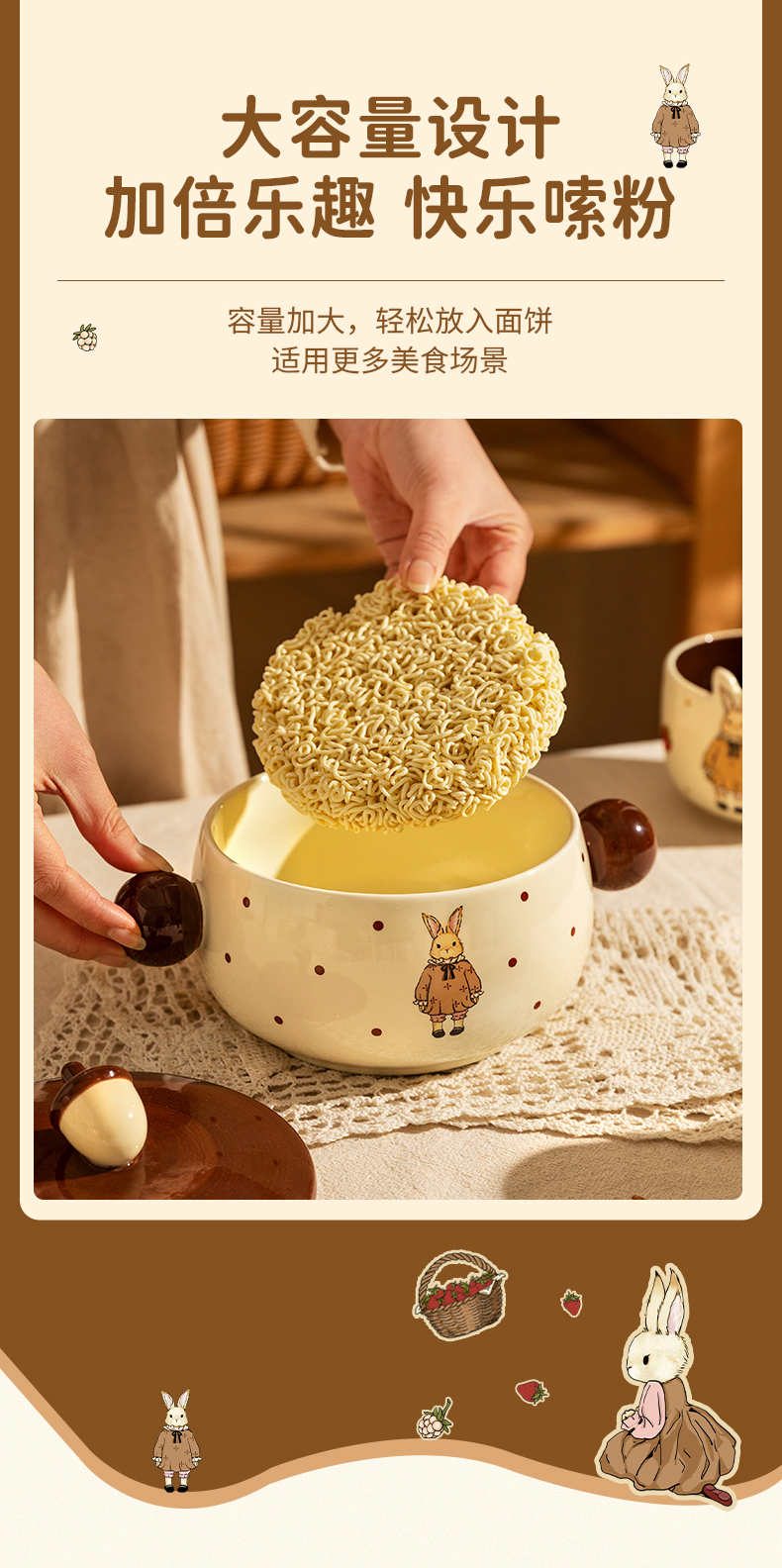 摩登主妇赫拉兔带盖泡面碗家用高颜值双耳陶瓷餐具泡面杯方便面碗