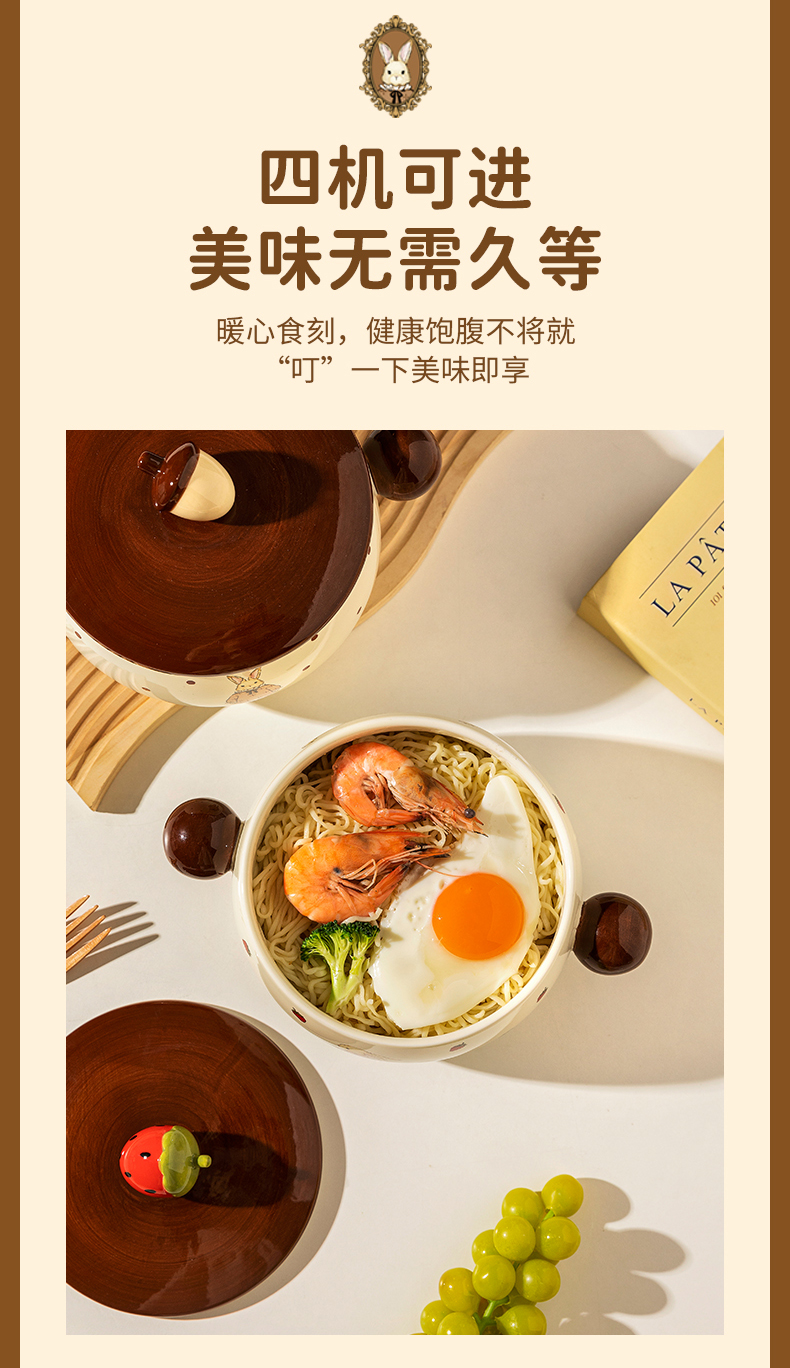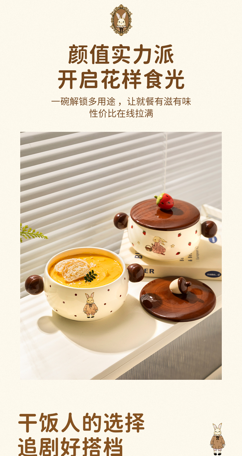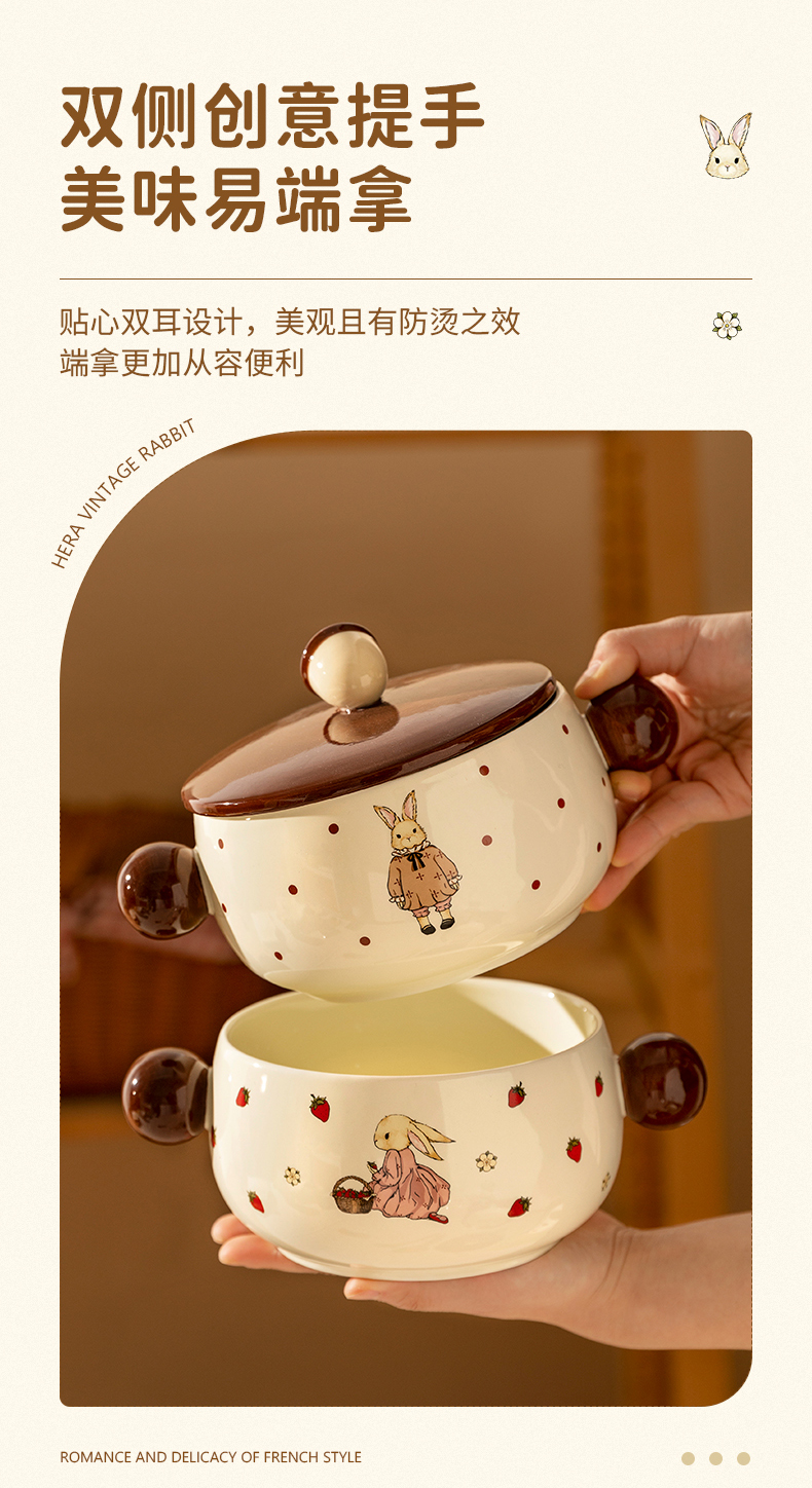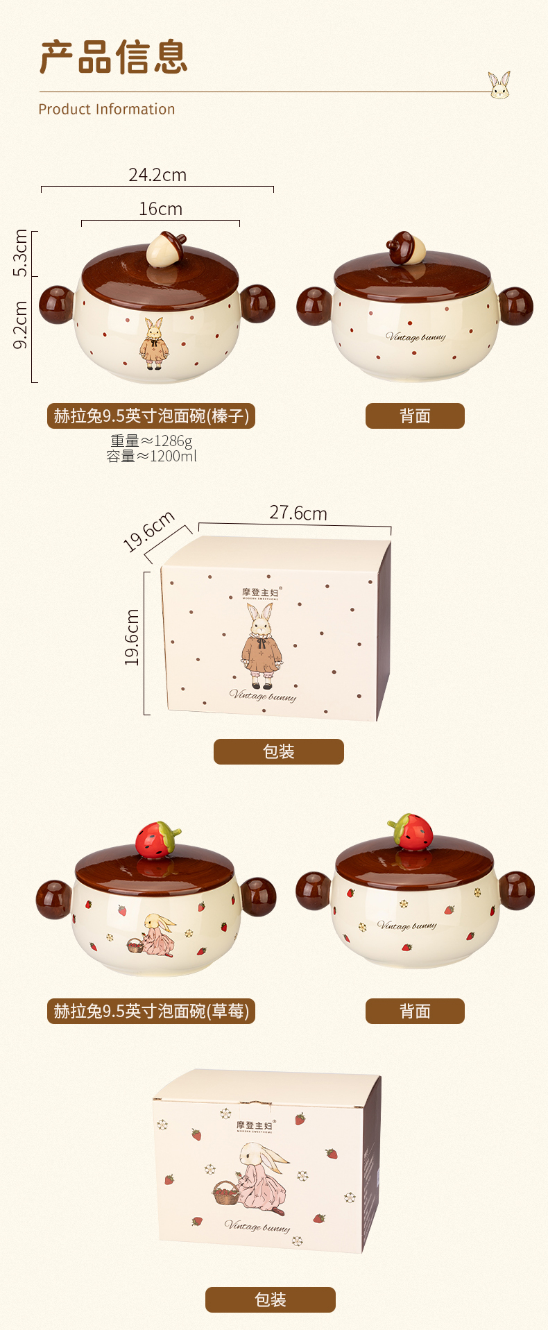 摩登主妇赫拉兔带盖泡面碗家用高颜值双耳陶瓷餐具泡面杯方便面碗