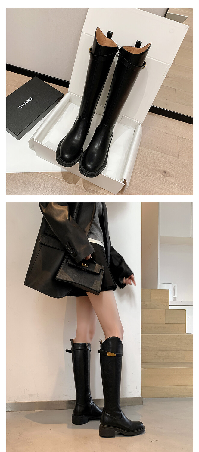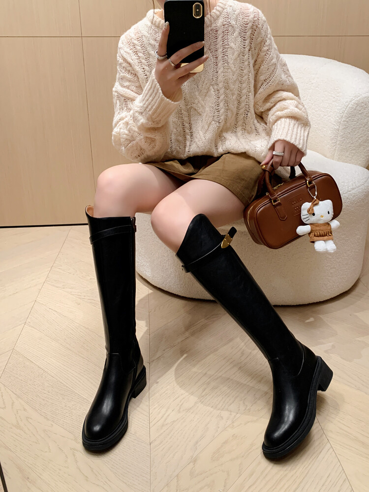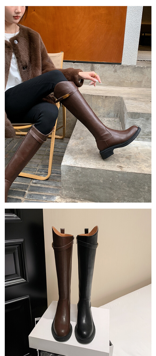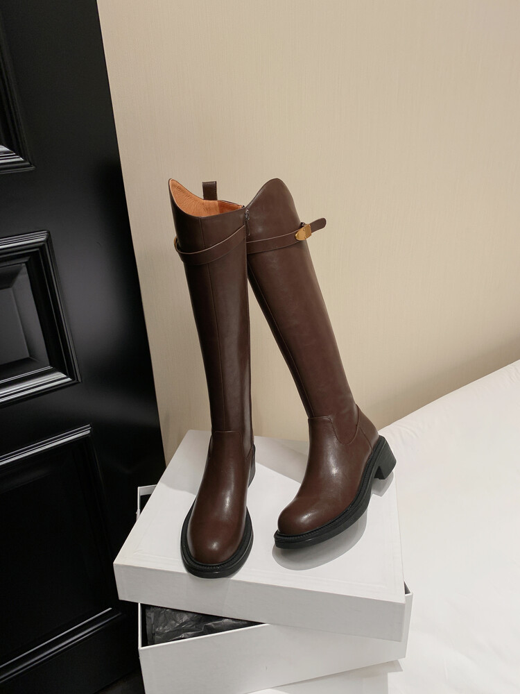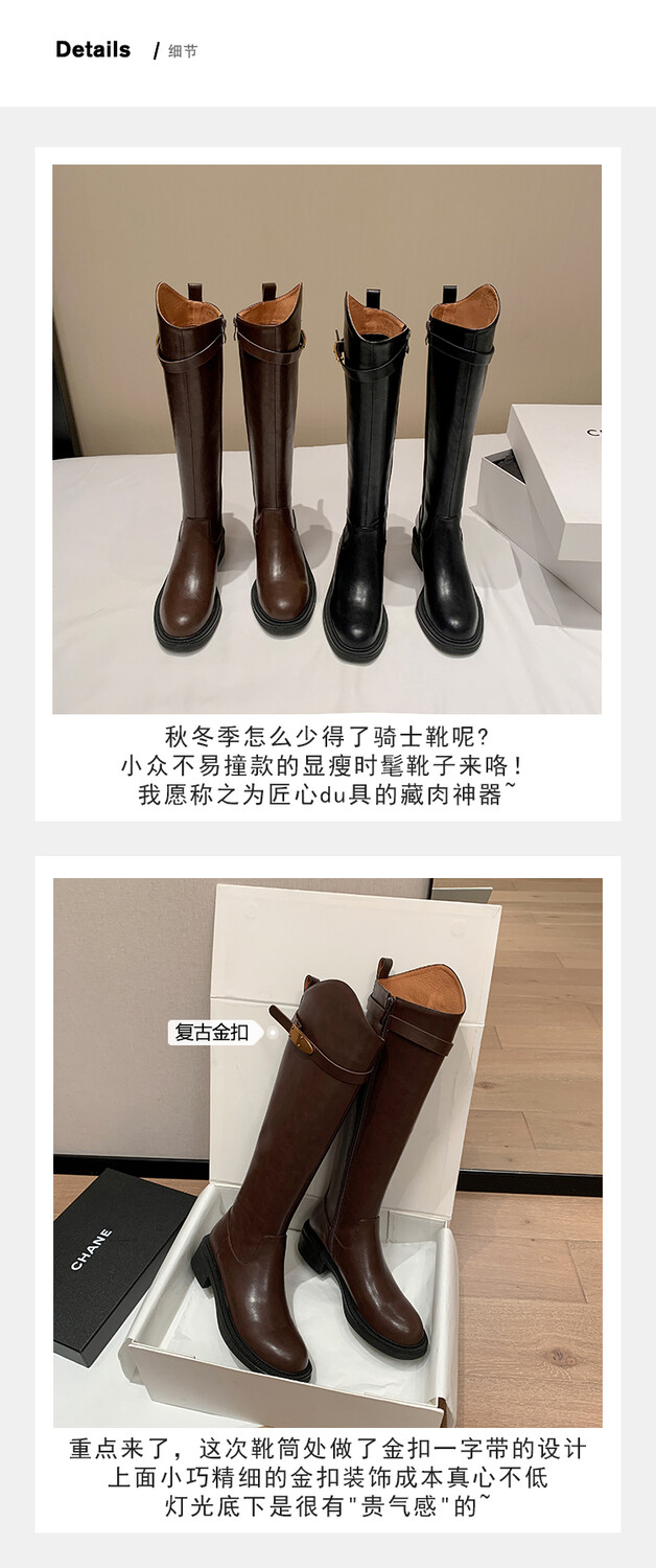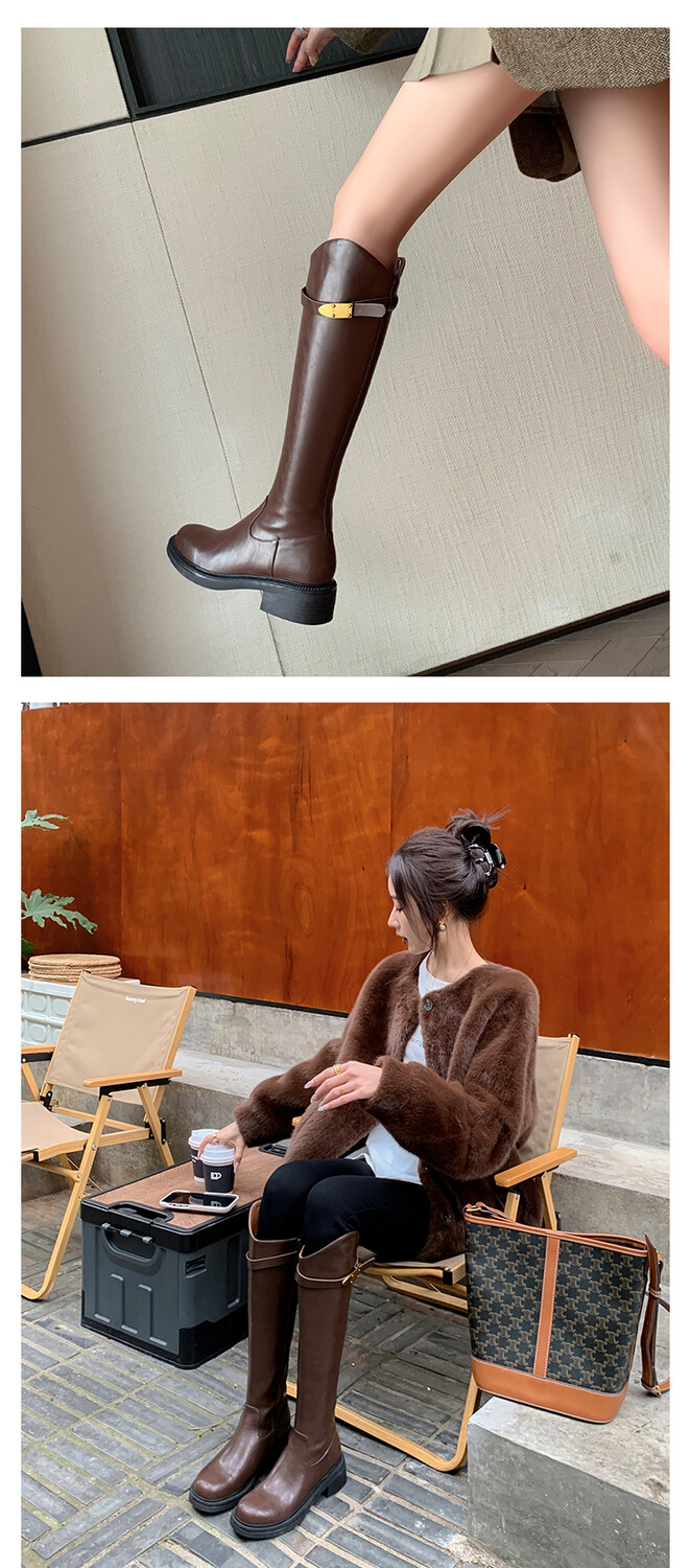 【预售7天】牛皮洋气百搭金属扣骑士靴秋冬圆头粗中跟V口真皮高筒长靴女DY&8405