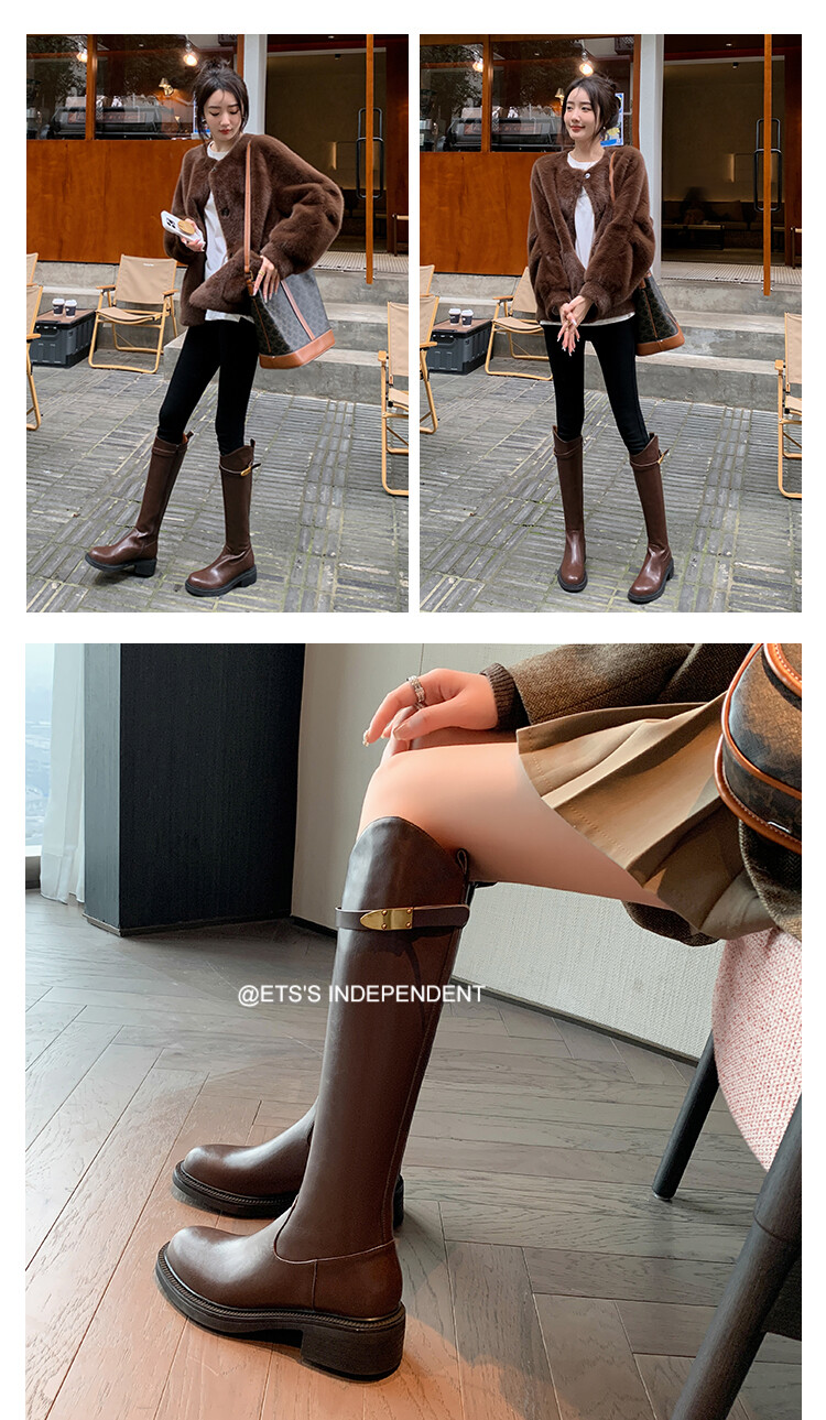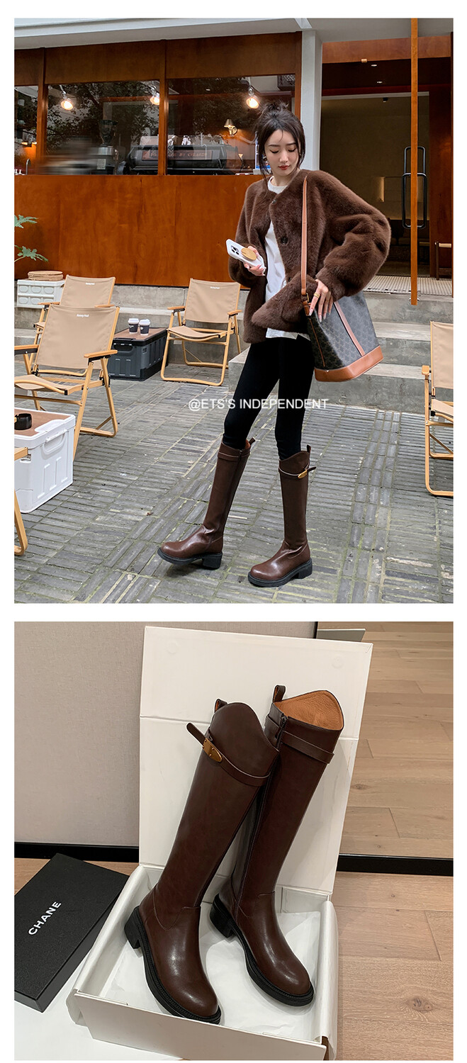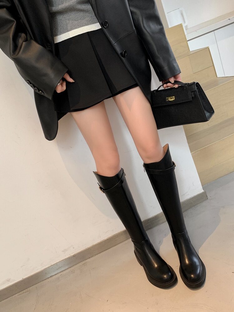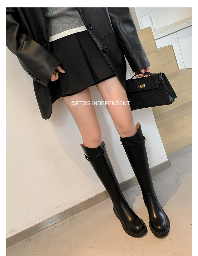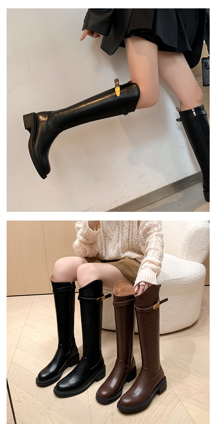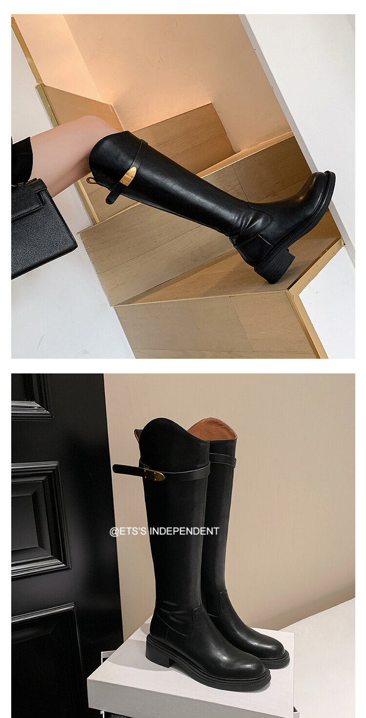 【预售7天】牛皮洋气百搭金属扣骑士靴秋冬圆头粗中跟V口真皮高筒长靴女DY&8405