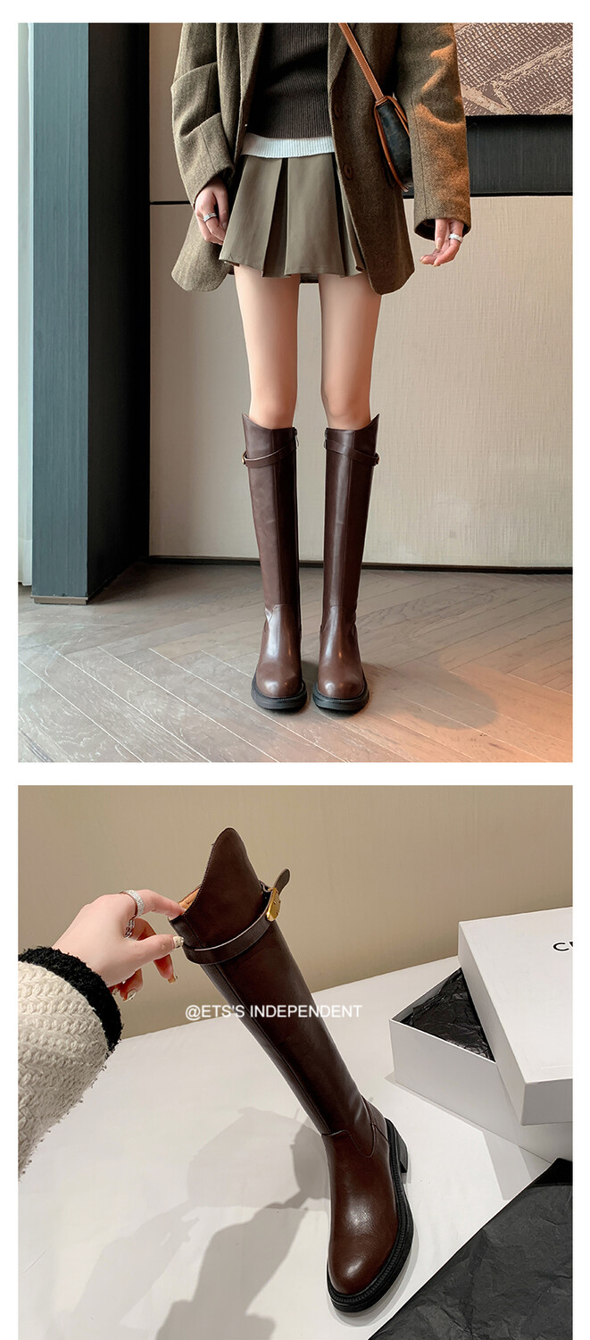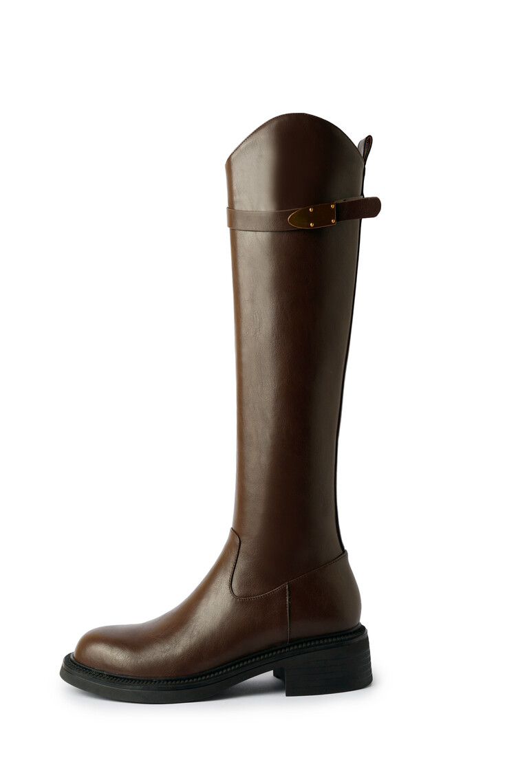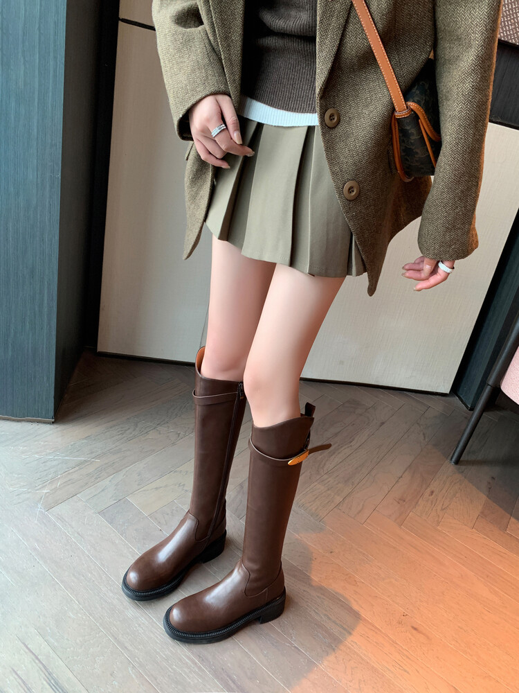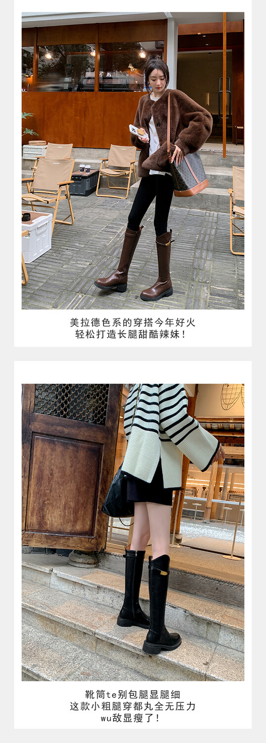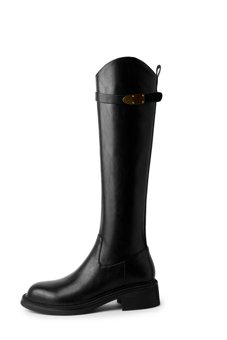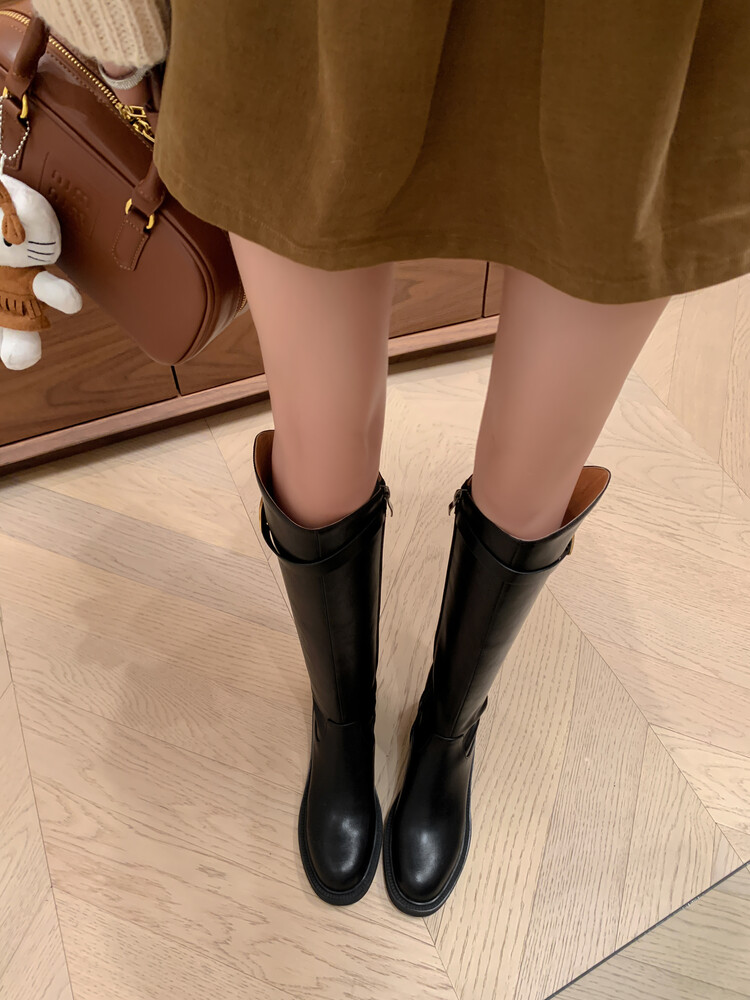 【预售7天】牛皮洋气百搭金属扣骑士靴秋冬圆头粗中跟V口真皮高筒长靴女DY&8405
