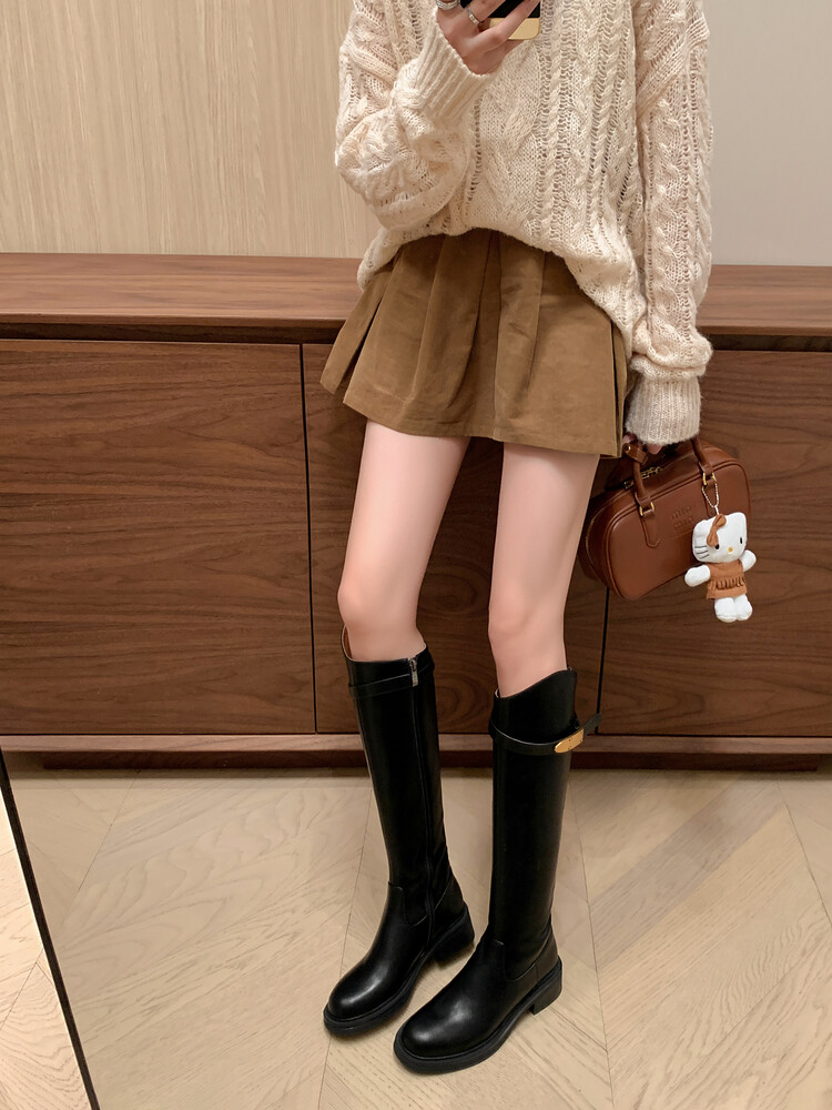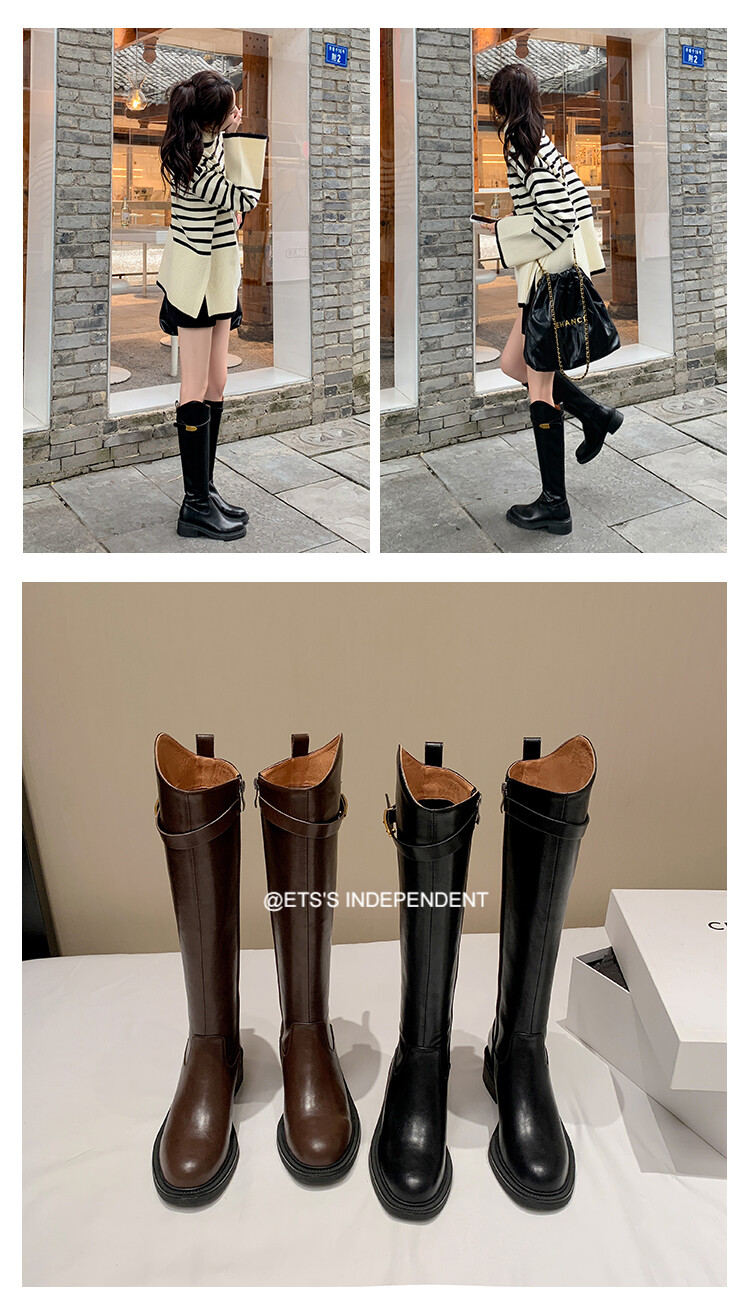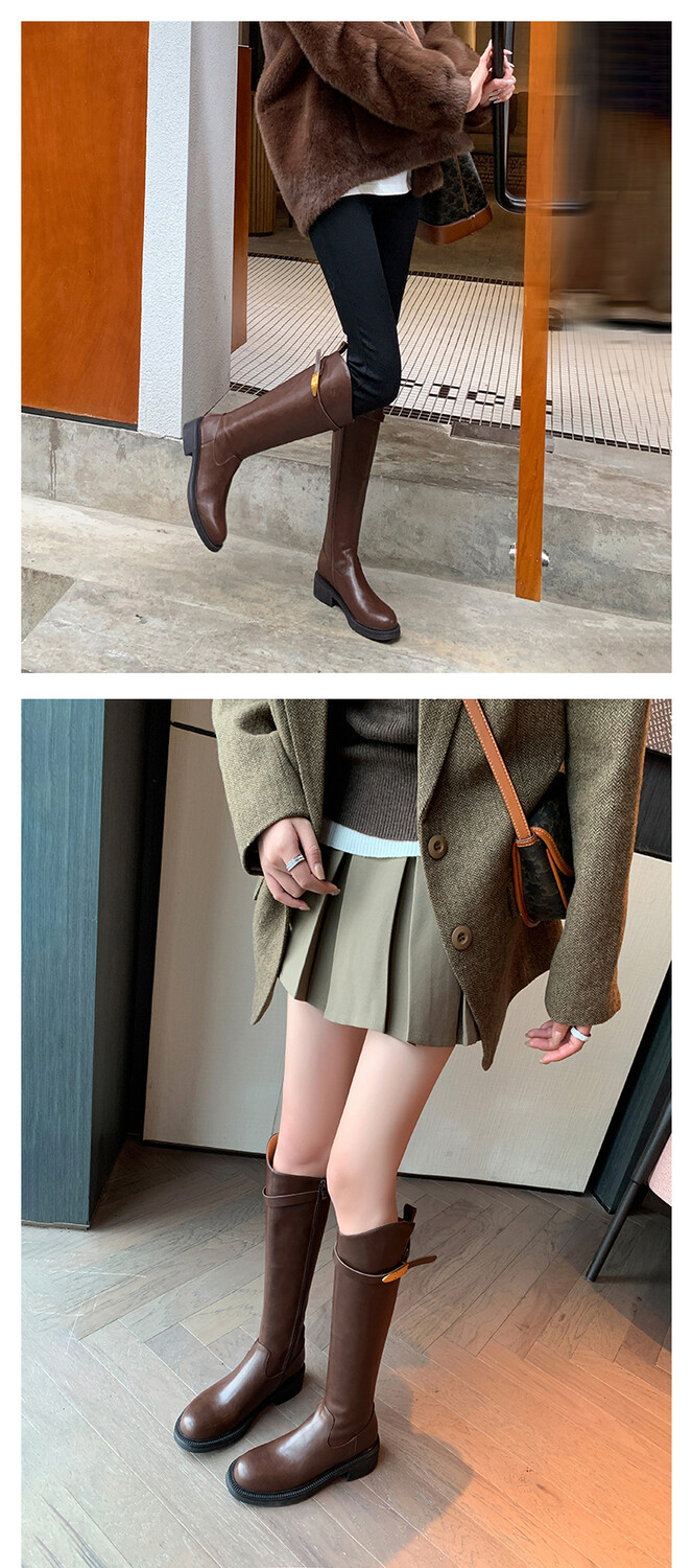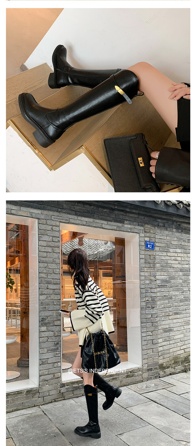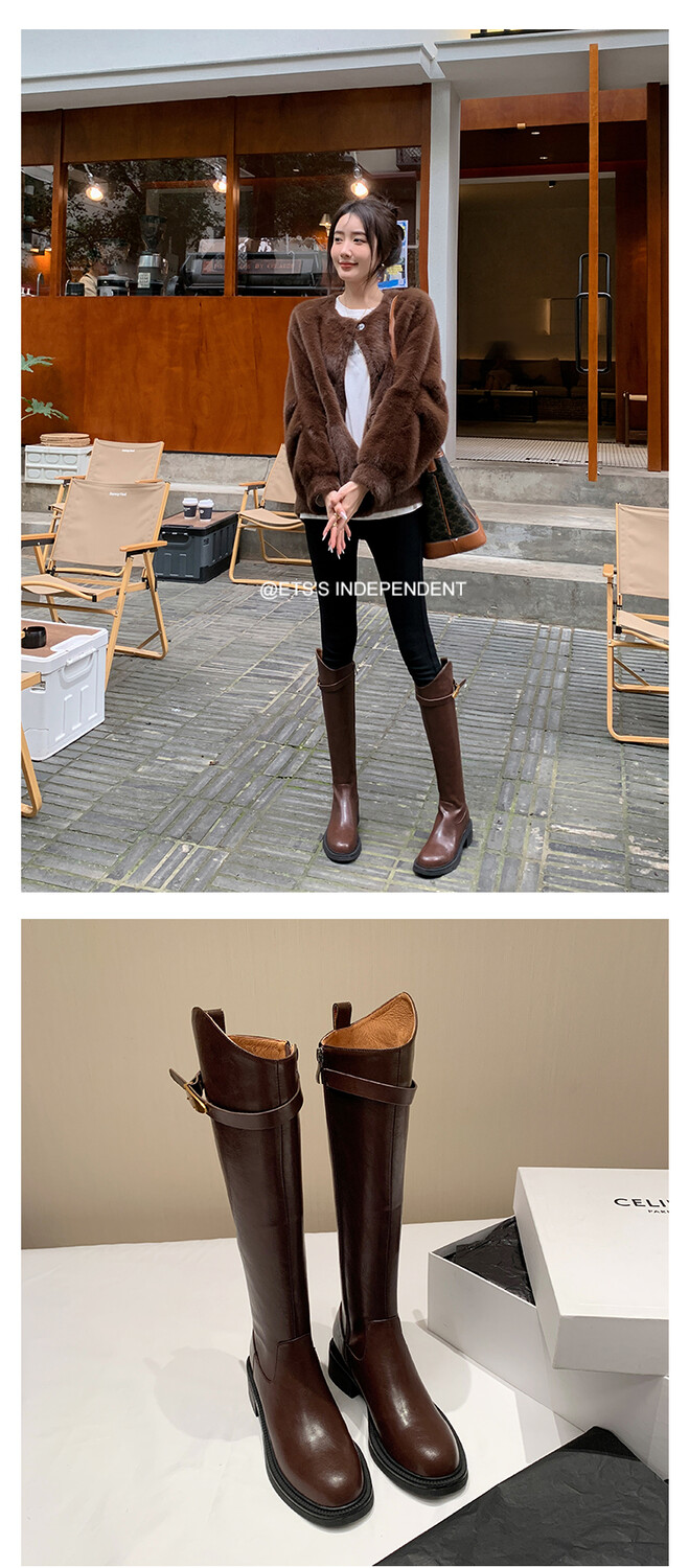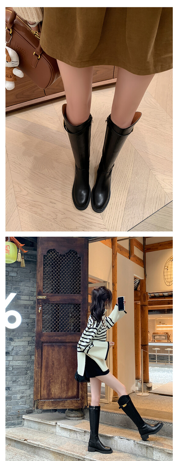 【预售7天】牛皮洋气百搭金属扣骑士靴秋冬圆头粗中跟V口真皮高筒长靴女DY&8405