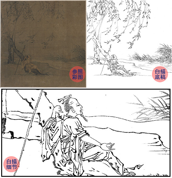 宋画人物小品白描底稿-王诜《柳荫高士图》-斗方小品册页-多种白描尺寸可选-GD21