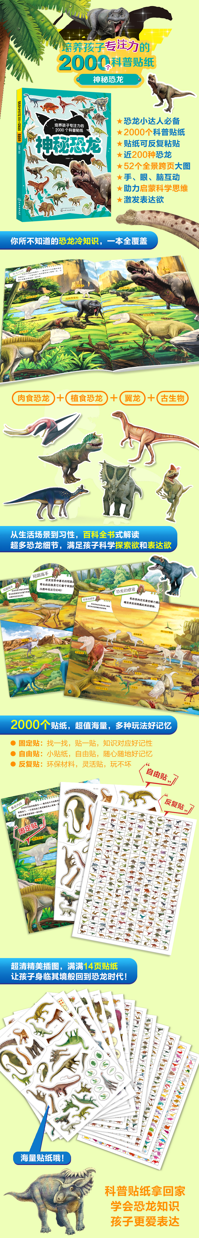 《培养孩子专注力的2000个科普贴纸.神秘恐龙》以小朋友喜欢的恐龙为主题,结合丰富有趣的动物百科知识,介绍了禽龙、蜥脚龙、鸟脚龙、霸王龙等不同种类的植食恐龙和肉食恐龙,充分满足孩子的好奇心和求知欲。每册2000贴形态各异的恐龙实物图,100余个趣味恐龙介绍,52个全景大图,海量贴纸,多种玩法,供孩子随意粘贴玩耍!趣味认知,培养孩子阅读兴趣和科学思维,锻炼手、脑、眼的协调性,不知不觉中带小朋友走进神秘的恐龙世界!