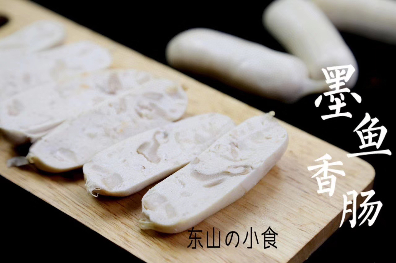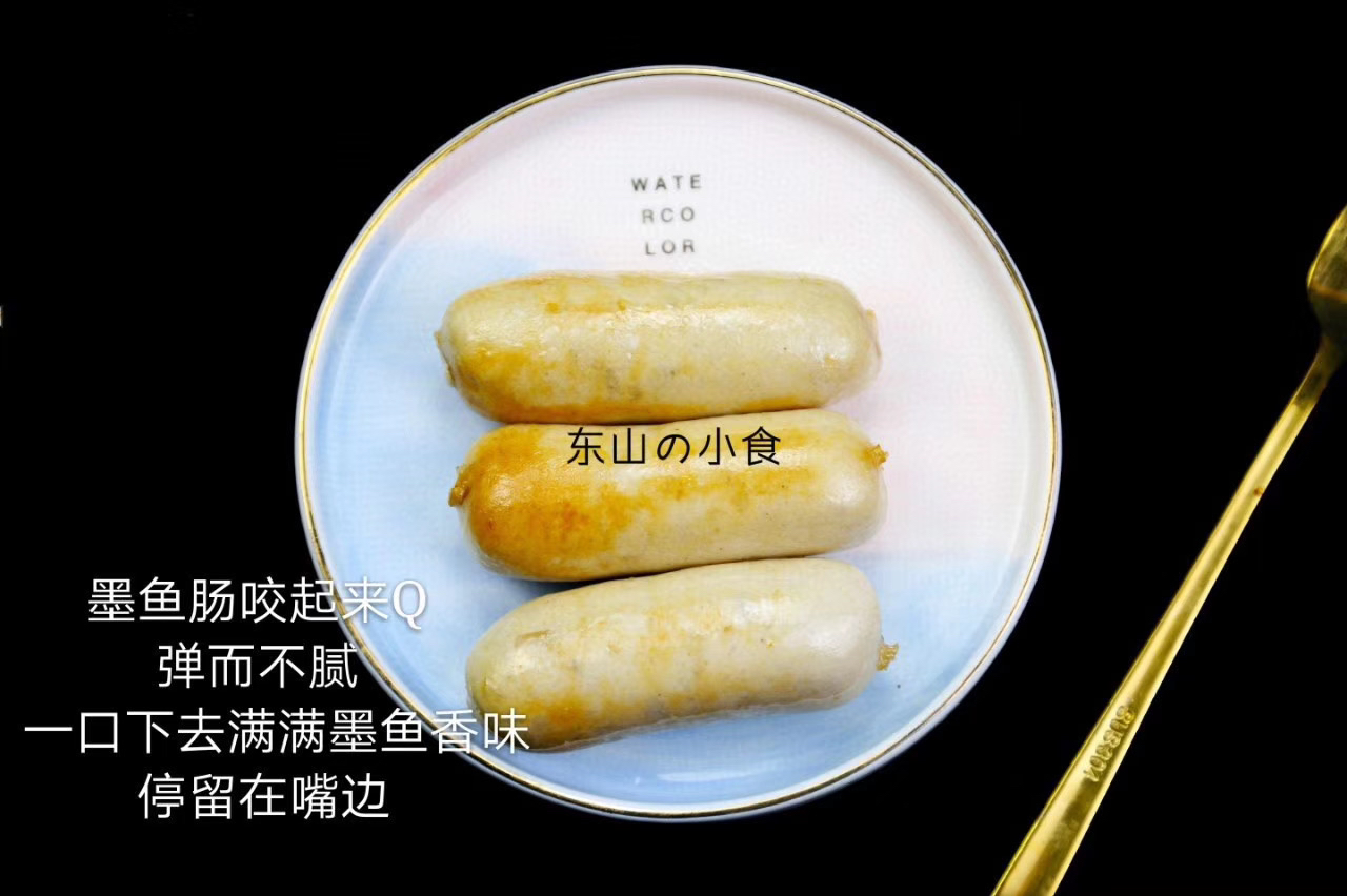 【食材】墨鱼切丁,墨鱼泥 3;6的比例,再加%10的新鲜后腿肉 ,让整个墨鱼肠咬起来Q 弹而不腻 一口下去满满的墨鱼香味