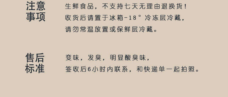 4.运输包装使用充足冰袋+加厚泡沫箱,运输过程出现冰袋融化,商品软化属于正常现象,冷冻食材48小时内有凉气,品质暂不会受影响。请及时开袋检查并冷冻保存,介意慎拍!