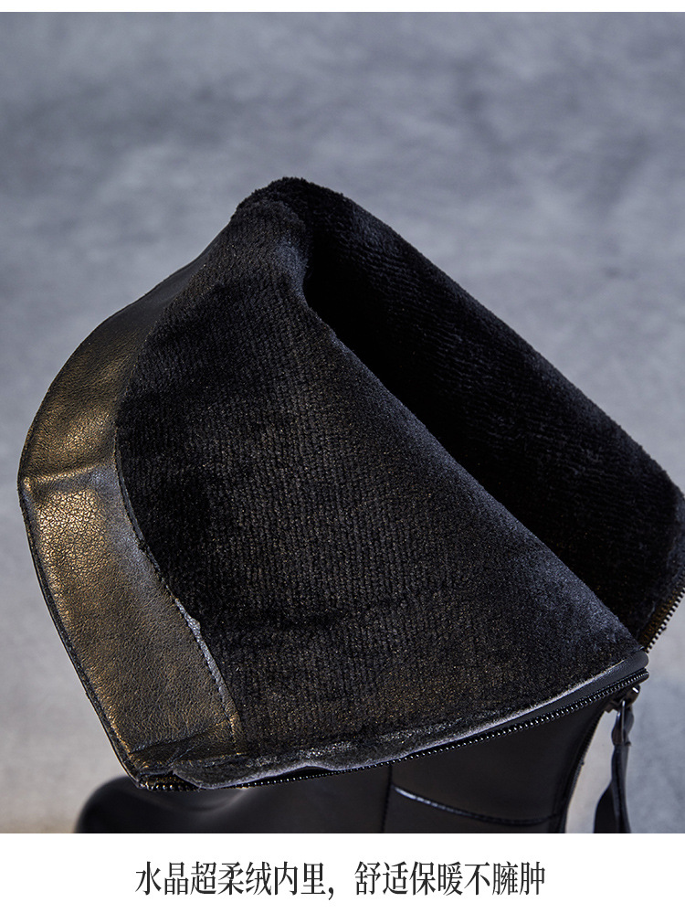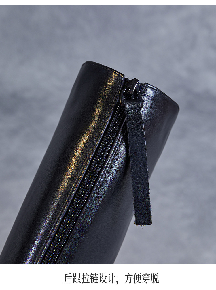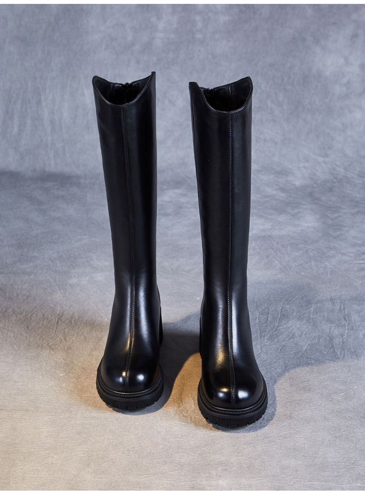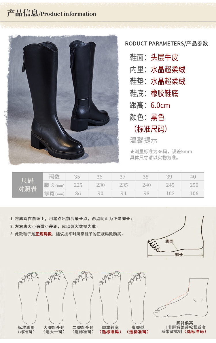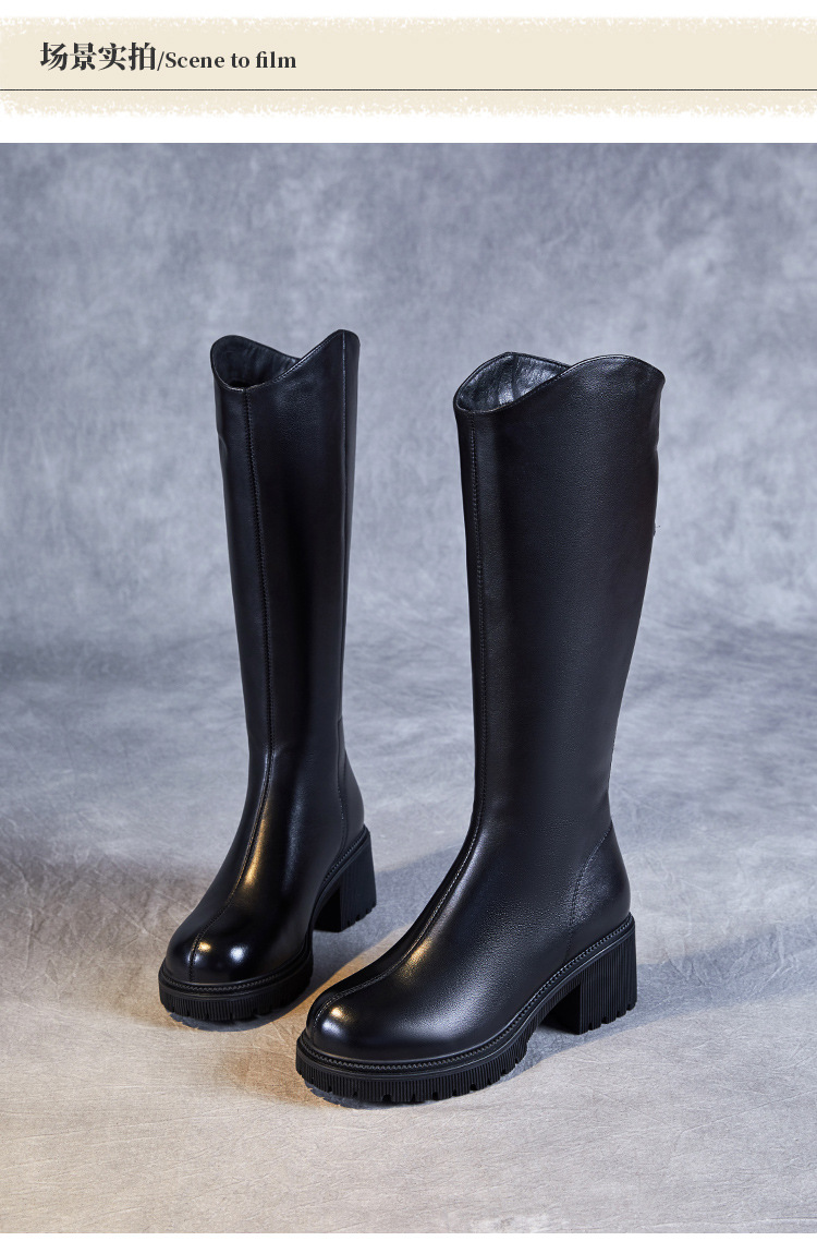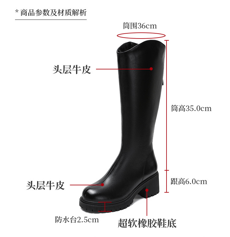 真皮长筒靴女新款秋冬季,加绒增高粗跟不过膝V口厚底骑士靴子ZM233558